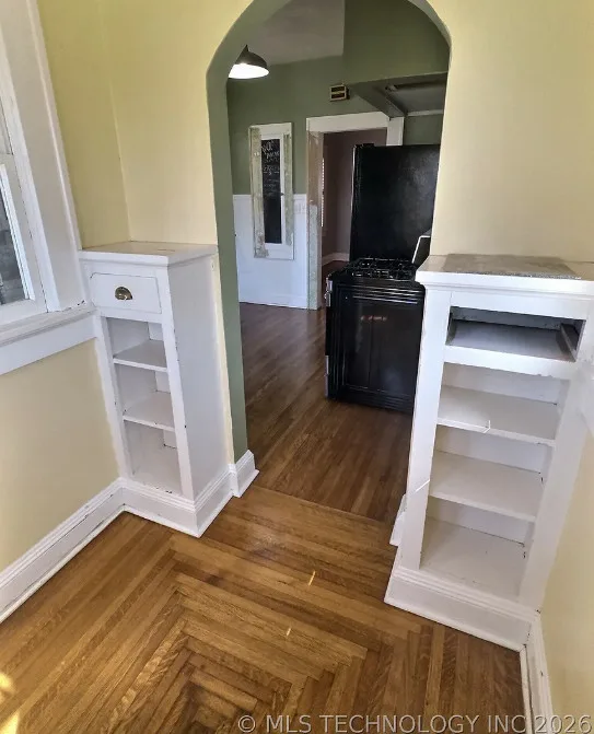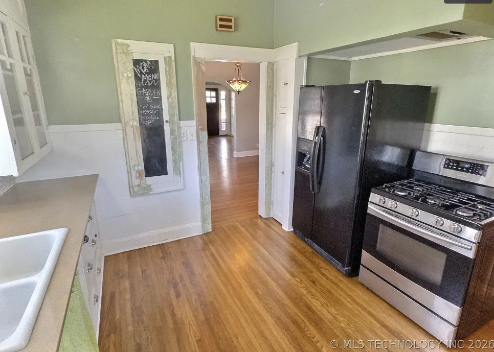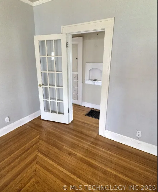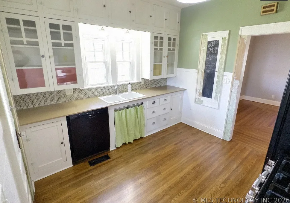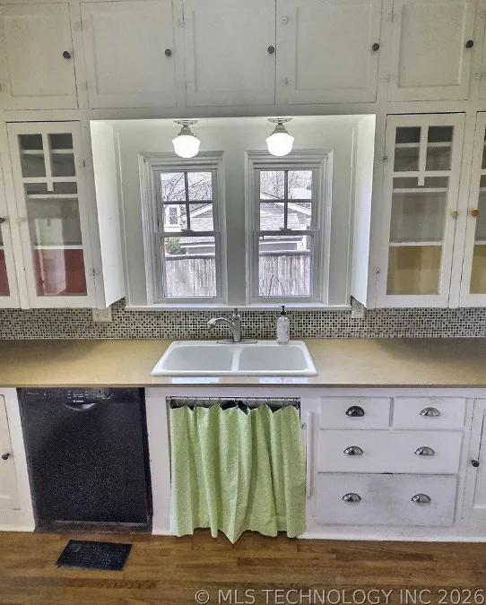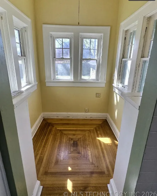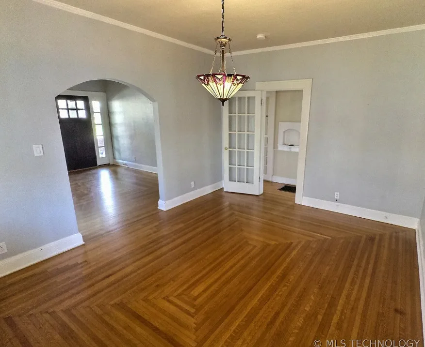 This house has pretty floors and some nice details! The house was built in 1928. It is located in Tulsa, Oklahoma. The house features a covered front porch, a porte cochere, pretty hardwood floors, built-in shelving, baseboards, crown moulding and a telephone nook. There is a lot of natural light in the house and there is a cute kitchen. There is a detached storage shed/garage on the property. Two bedrooms, one bathroom and 1,236 square feet. $248,500