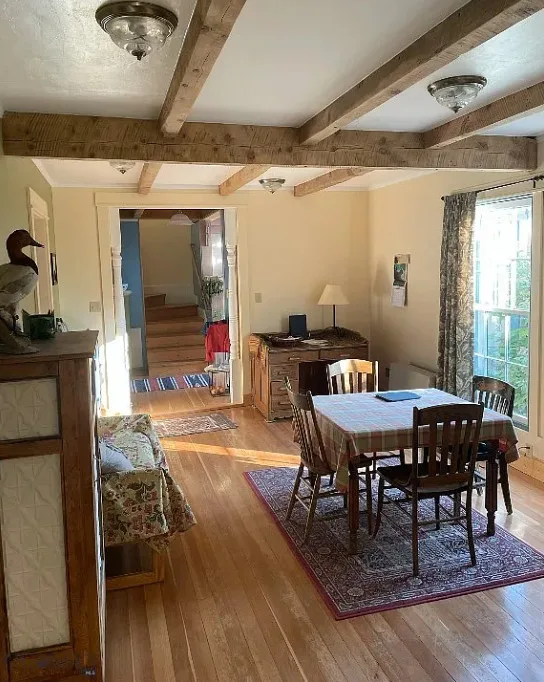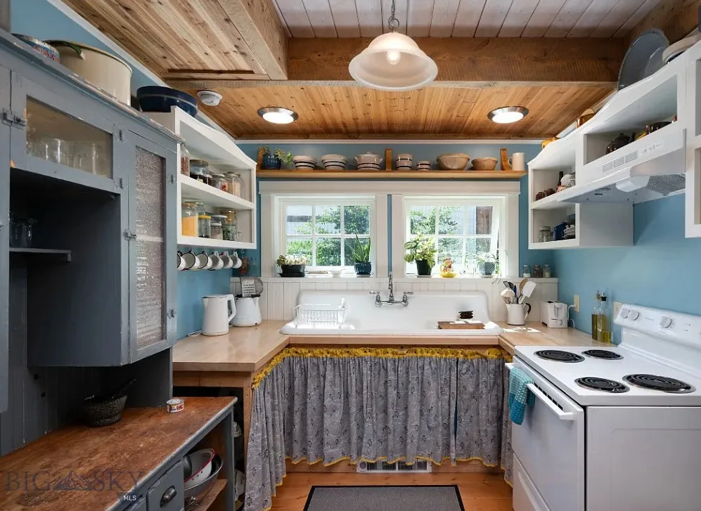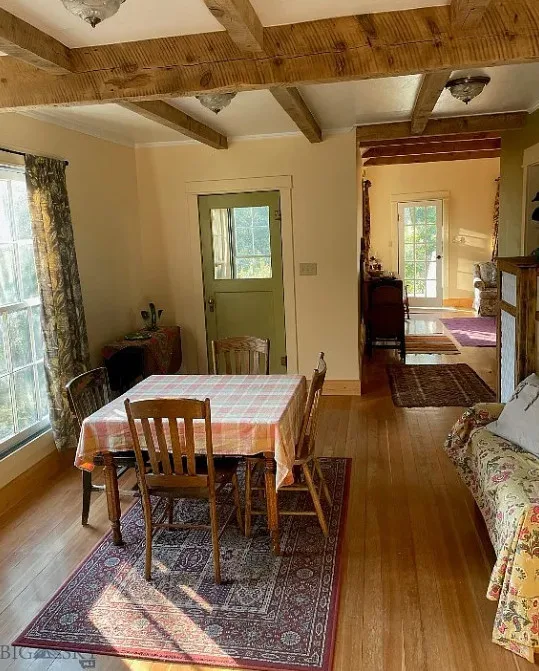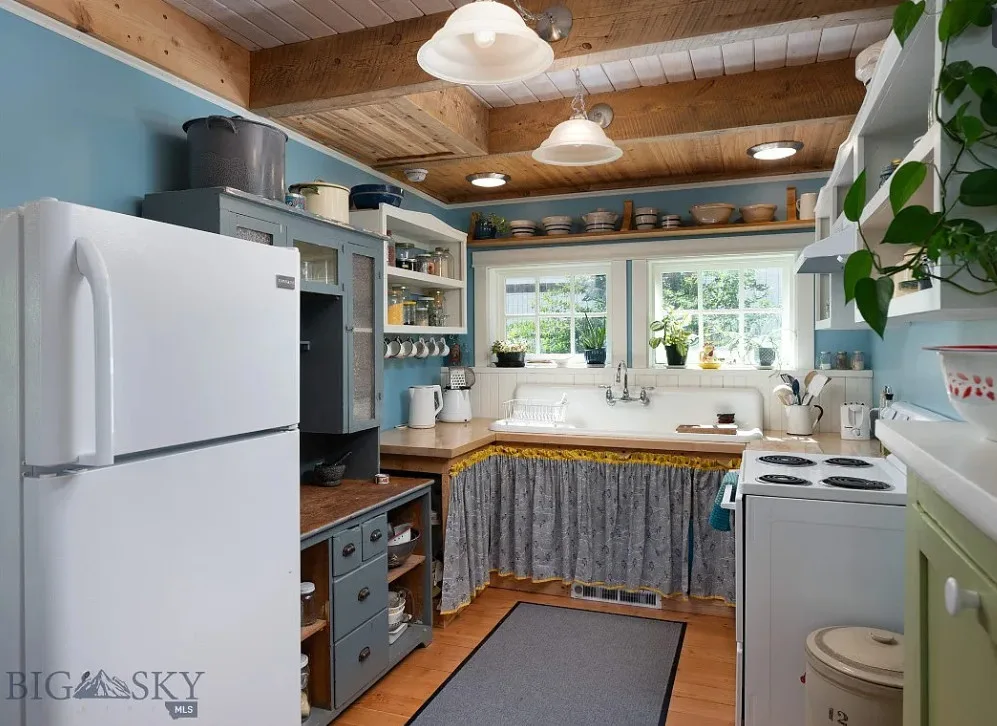 Love this interior! That glass sunroom and the kitchen sink are perfect! This is known as the Samuel Russell House. It was built in 1900. The house is located in Virginia City, Montana. The house features a covered front porch, vaulted ceilings, exposed beams, wood floors, great kitchen sink, baseboards, french doors, glass sunroom and bead board. There is a detached storage building on the property. Two bedrooms, two bathrooms and 1,455 square feet. $445,000