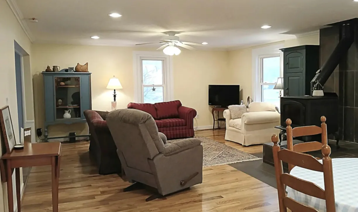 Happy farmhouse filled with light & simplicity! Private yard for some grilling, gardening, or roaming hens. Long driveway for evening walks, a wraparound porch for morning coffee, & abundant inspiring views. Main level has an open living/dining area, spacious kitchen, 3/4 bath, laundry room, and a bedroom/den with adjoining full bath. Upstairs are 3 large bedrooms (2 with walk-in closets) and a full bath. Remodeled in 2024: new hardwood flooring, replaced HVAC ducts/plumbing, new kitchen cabinets/appliances, new bathroom vanity & shower insert. Tiled hearth, ready for your choice of paint color. Walls freshly painted & contemporary skip-trowel added to 1st floor ceilings. Small rear porch with laundry entry. 3-bay garage. Shed with chicken coop. Come visit!