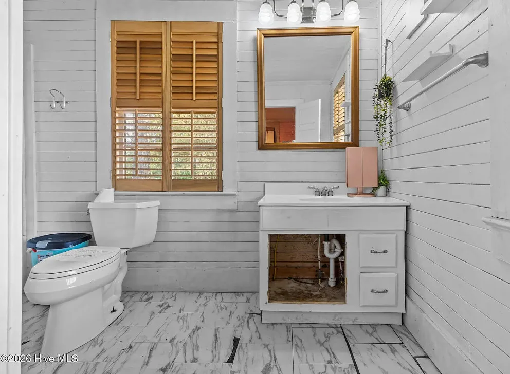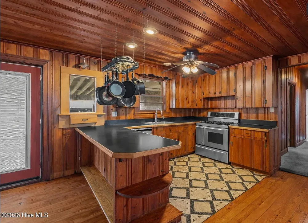 That is a neat looking barn! I wish they showed in all of the outbuildings. I’m curious about the white one. The house was built in 1900. It is located on 3.01 acres in Warsaw, North Carolina. The house features knotty pine, wood floors, built-in bookshelves, baseboards and a brick fireplace. There are multiple outbuildings on the property, including a cool old barn. Four bedrooms, two bathrooms and 2,080 square feet. $240,000