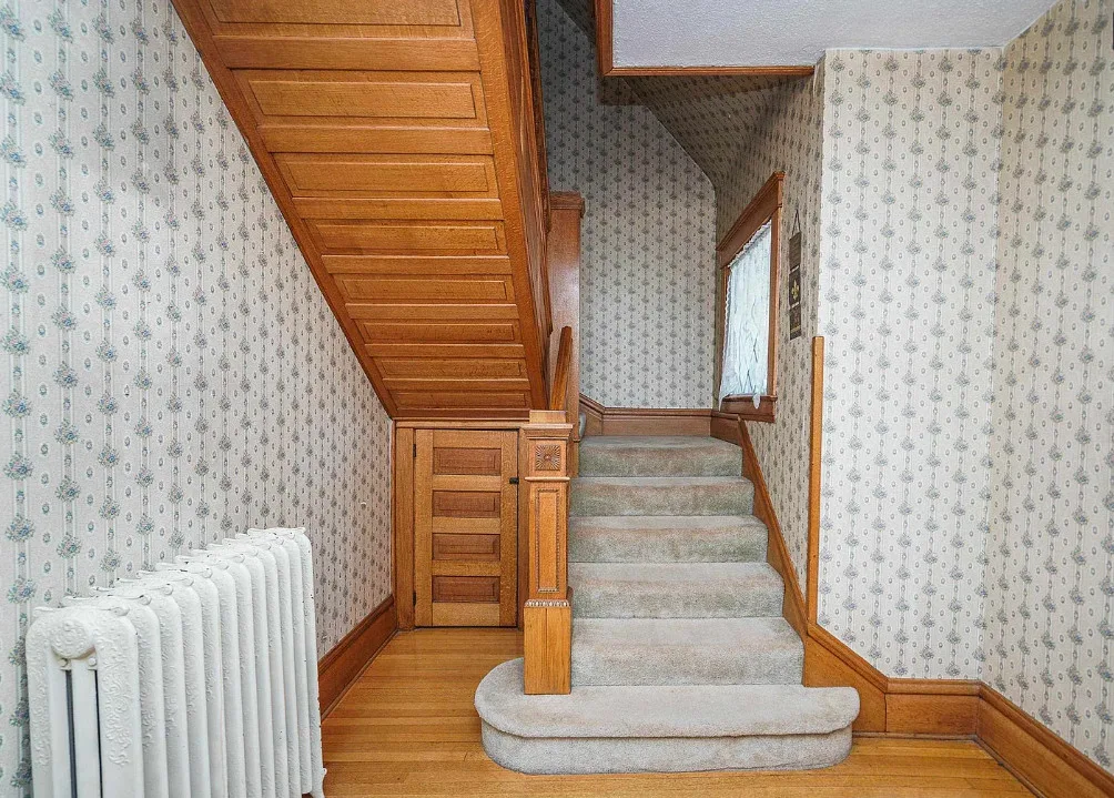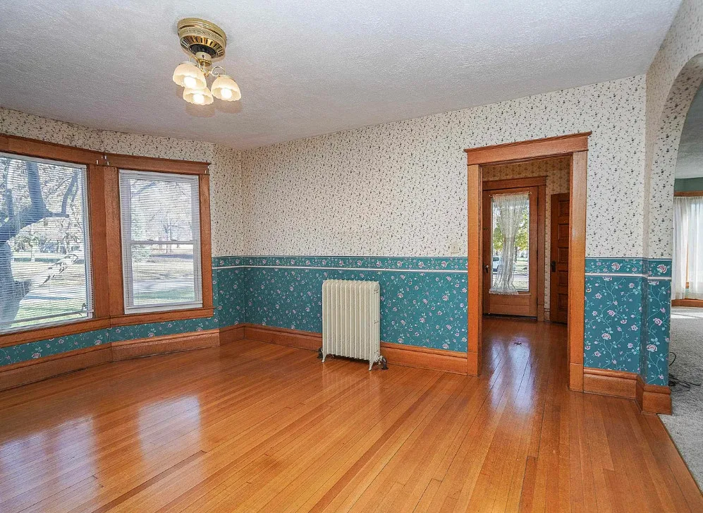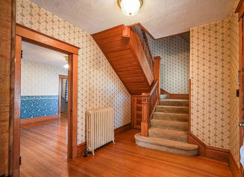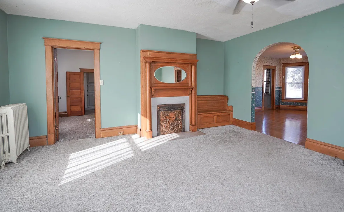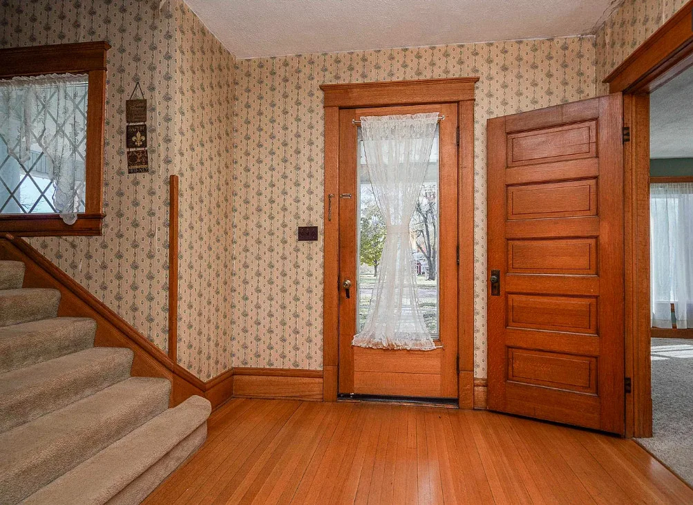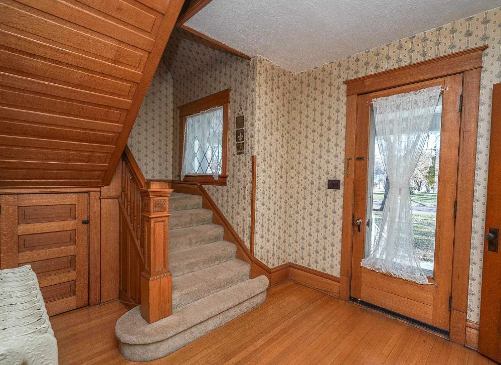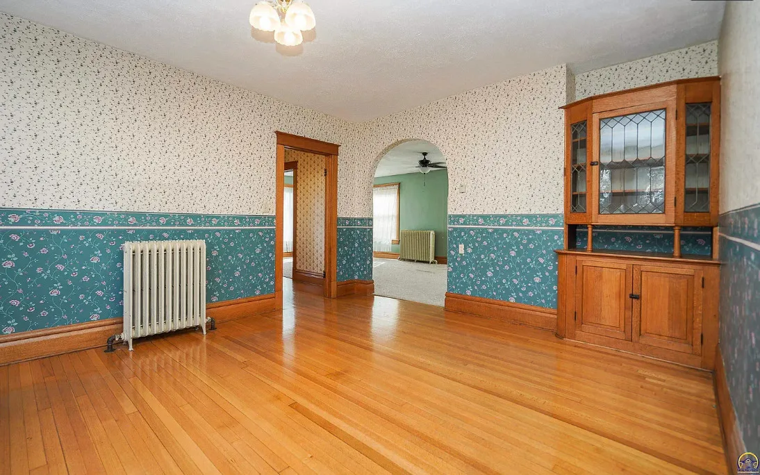 Nice unpainted woodwork! How sweet is that street! It is a brick street and lined with trees. The house was built in 1910. It is located on .41 acre in Holton, Kansas. The house features a covered front porch, screened in back porch, original wood floors, nice staircase, baseboards, arched entryway, bay windows, chair rails, built-in china cabinet with leaded glass, original mantels and built-in seating. There is a detached garage on the property. Four bedrooms, two bathrooms and 2,446 square feet. $165,000