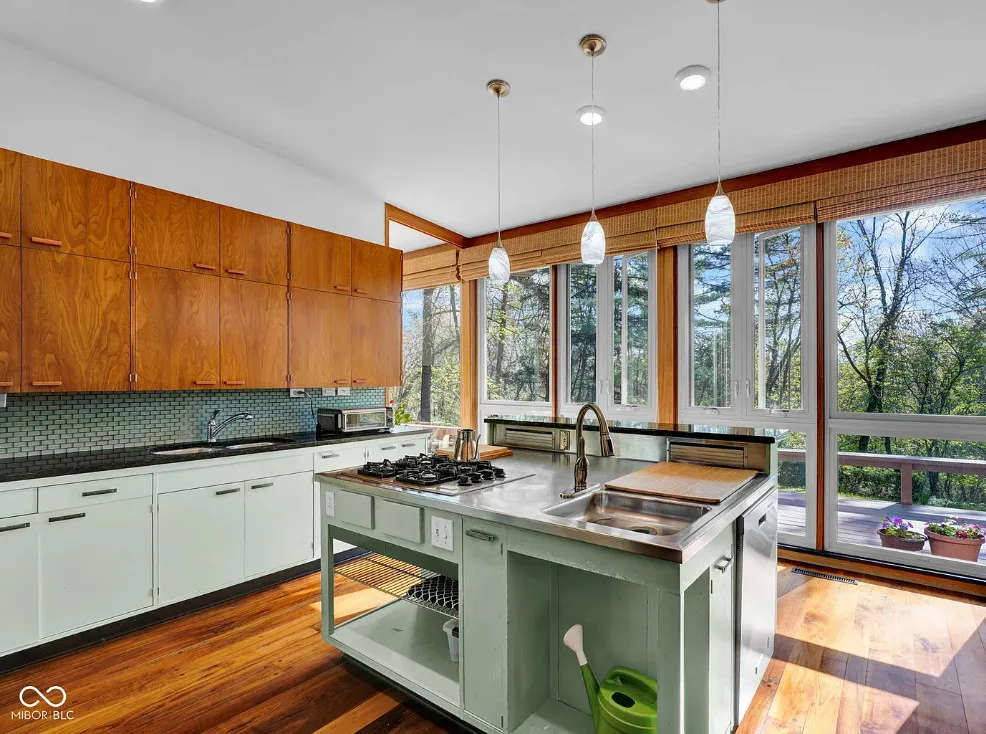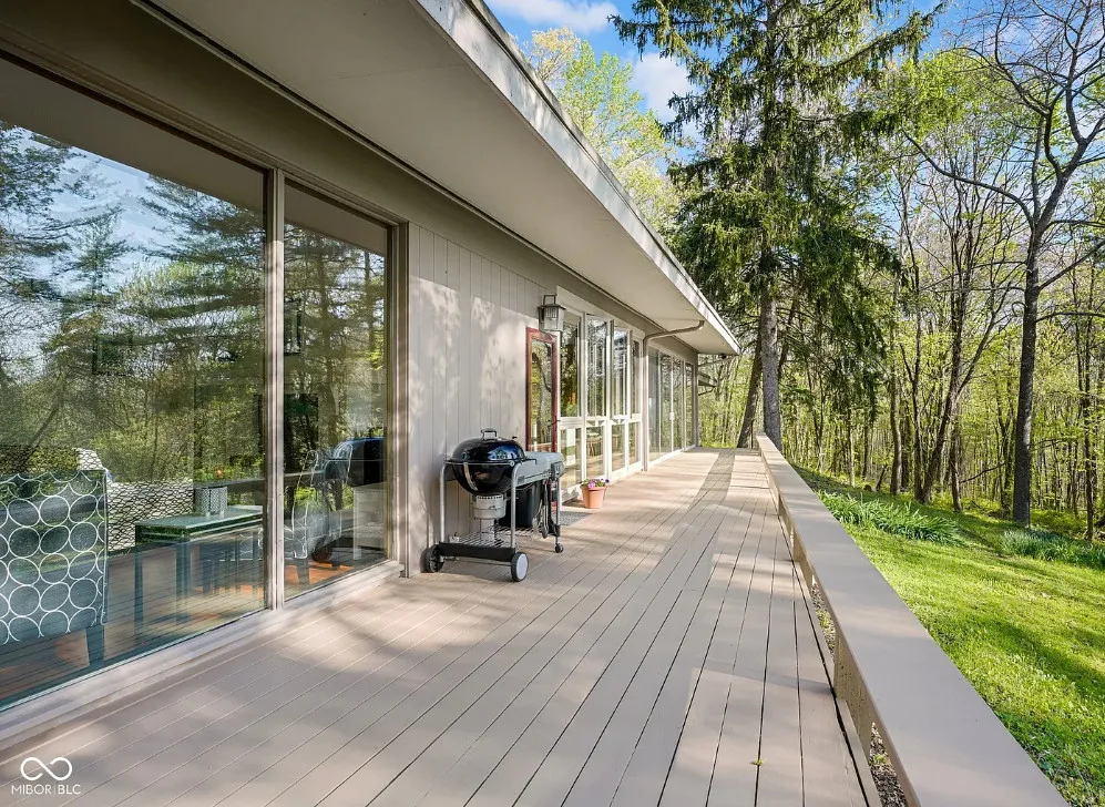 Love the windows in this mid-century home! Pretty view! The house was built in 1950. It is located on 4.14 acres in Columbus, Indiana. The house features a large deck, a beautiful patio, wood floors, a lot of natural light. spacious kitchen and built-in bookshelves. This is a big house! Four bedrooms, four bathrooms and 3,468 square feet. $695,000