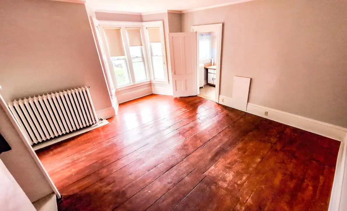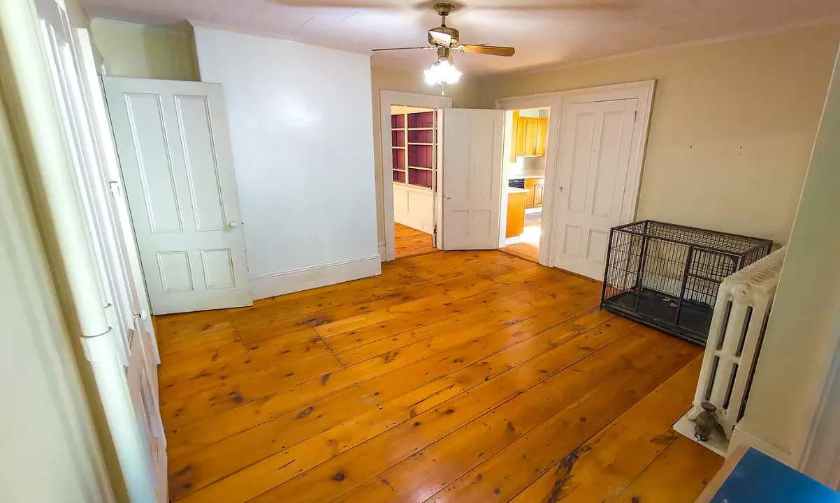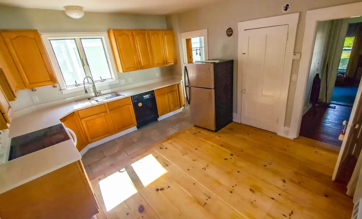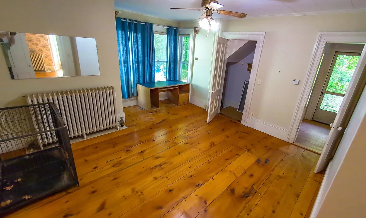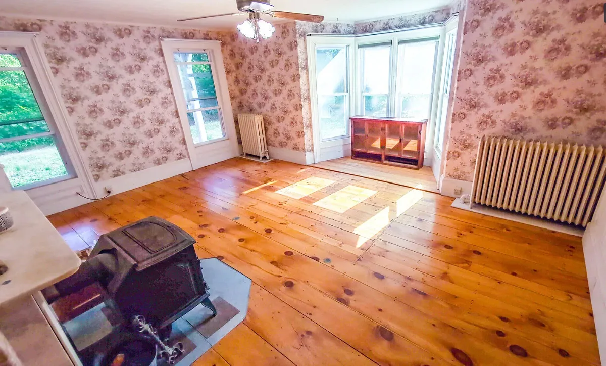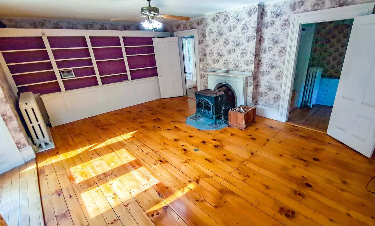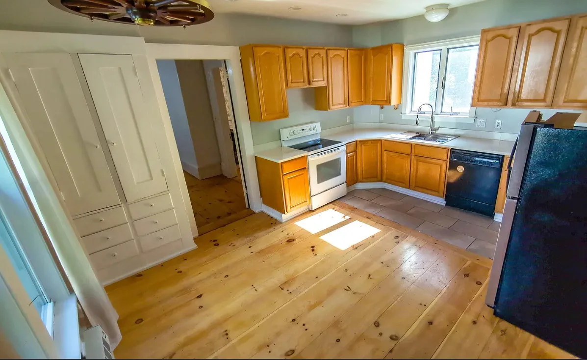 This house has wide plank floors and an attached barn. The house was built in 1880. It is located on .63 acre in Lisbon, New Hampshire. The house features a covered front porch, wide plank wood floors, wide baseboards, crown moulding and a wood stove. There is a large attached barn. Close to White Mountains’ Outdoor Adventures. Four bedrooms, four bathrooms and 2,421 square feet. $299,900