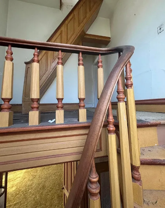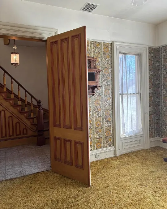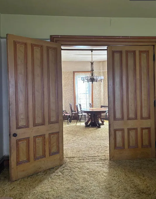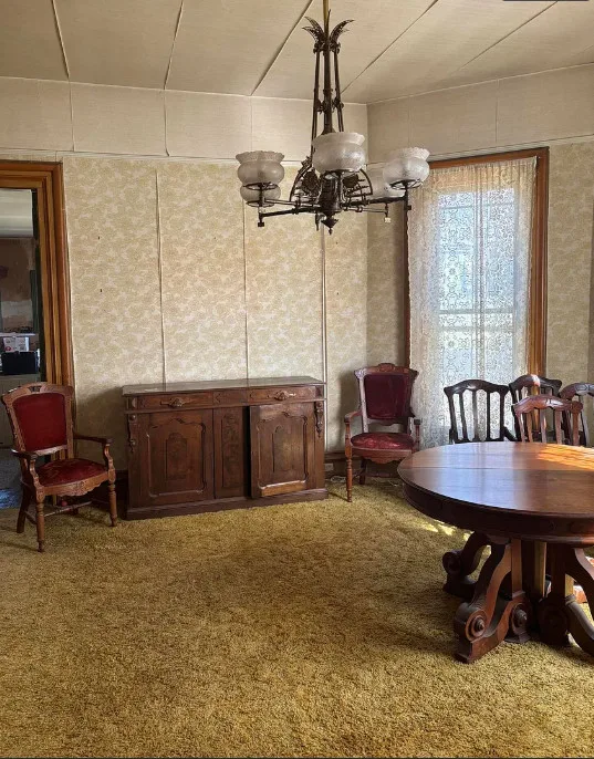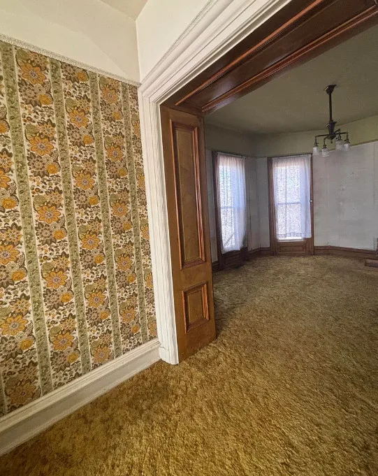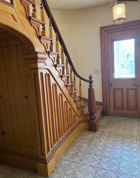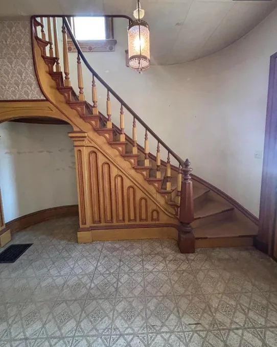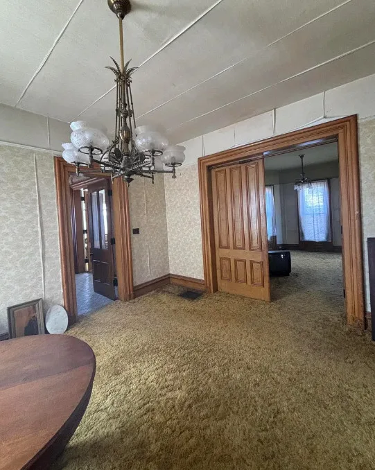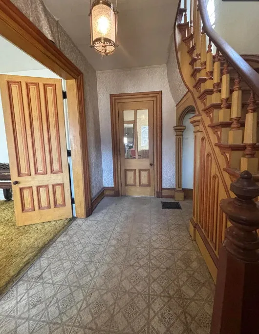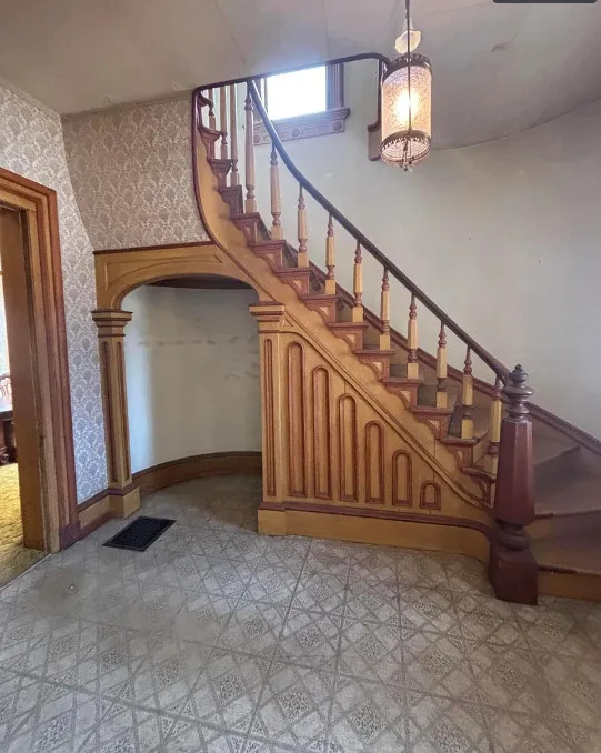 What a house this could be! Love that pretty staircase and the vintage light fixtures. This house was built in 1885. It is located on .3 acre in Manchester, Michigan. The house features a covered front porch, small upper porch, pretty front door, grand staircase, vintage light fixtures, large doors and wide baseboards. Four bedrooms, two bathrooms and 2,726 square feet. $229,900