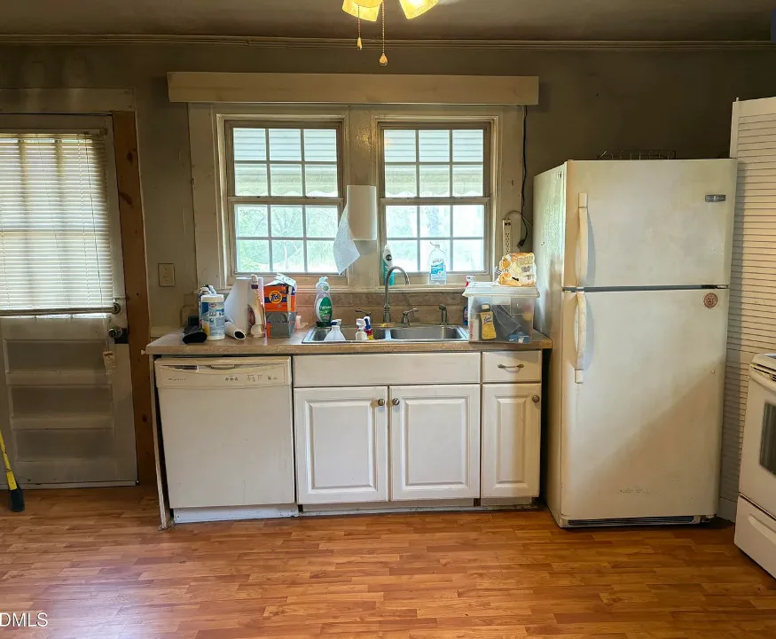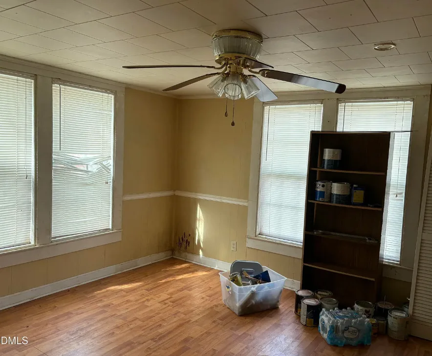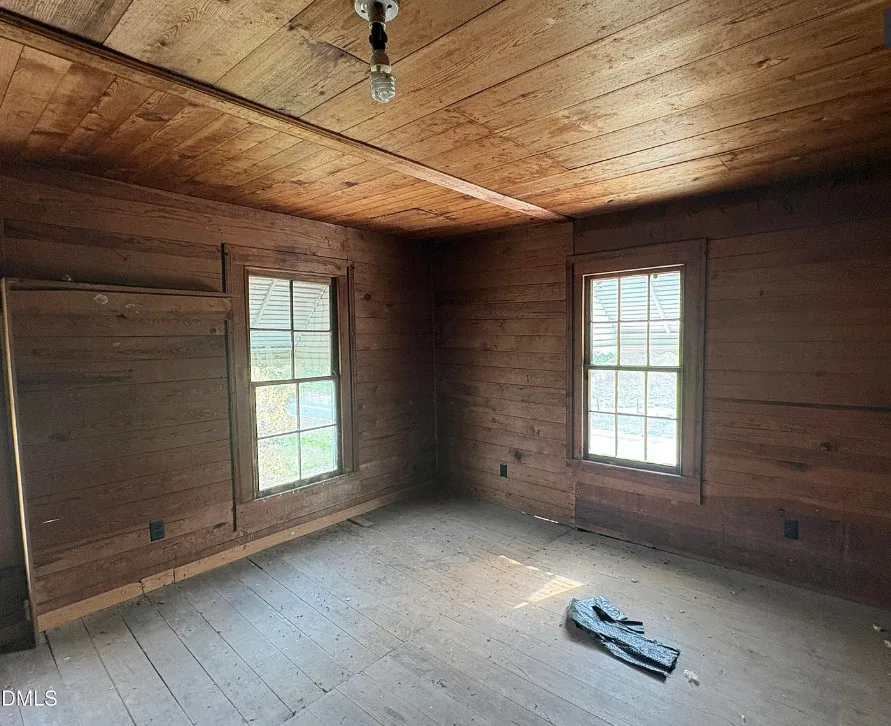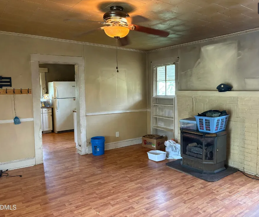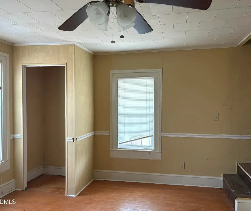This has some nice acreage with it! The interior is better than I expected. The house was built in 1900. It is located on 28.6 acres in Bennett, North Carolina. The house features a covered front porch, wood floors, built-in bookshelves, crown moulding, chair rails, wide baseboards, knotty pine, back porch and an updated bathroom. This house would be the type where a good cleaning would go a long way, then move in and work room by room. There are a couple of outbuildings on the property. Five bedrooms, one bathroom and 1,987 square feet. $395,000