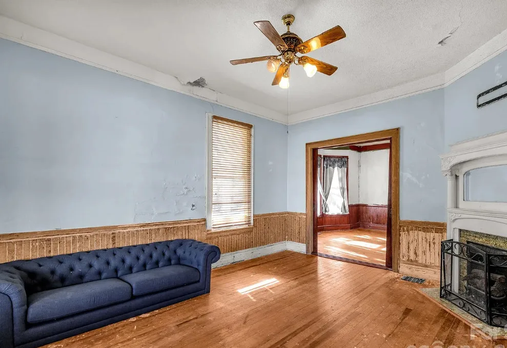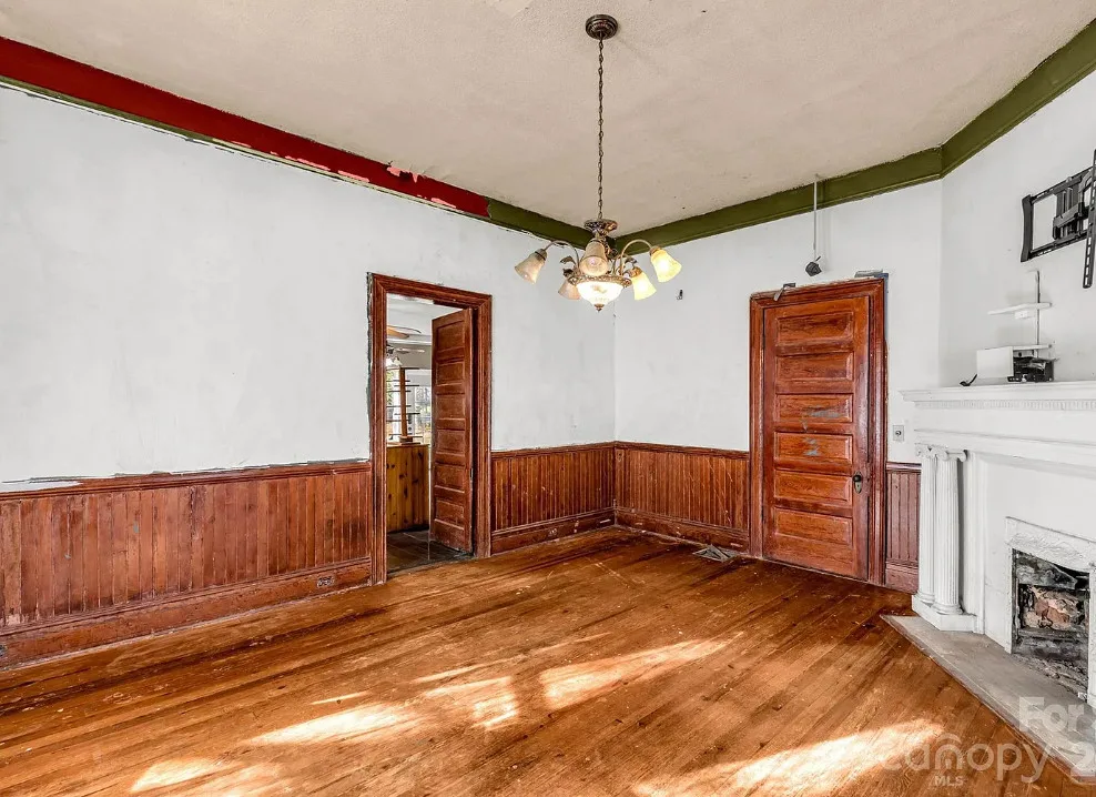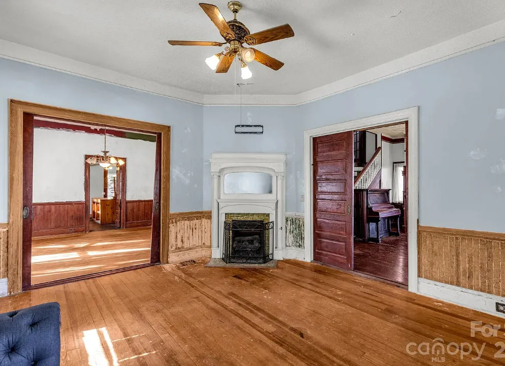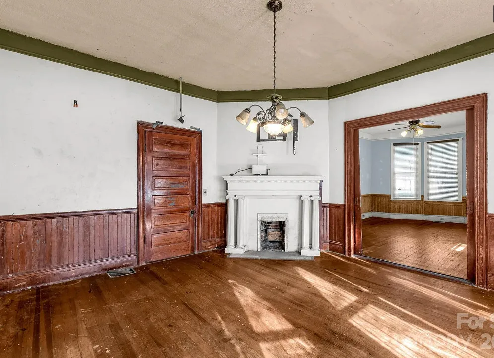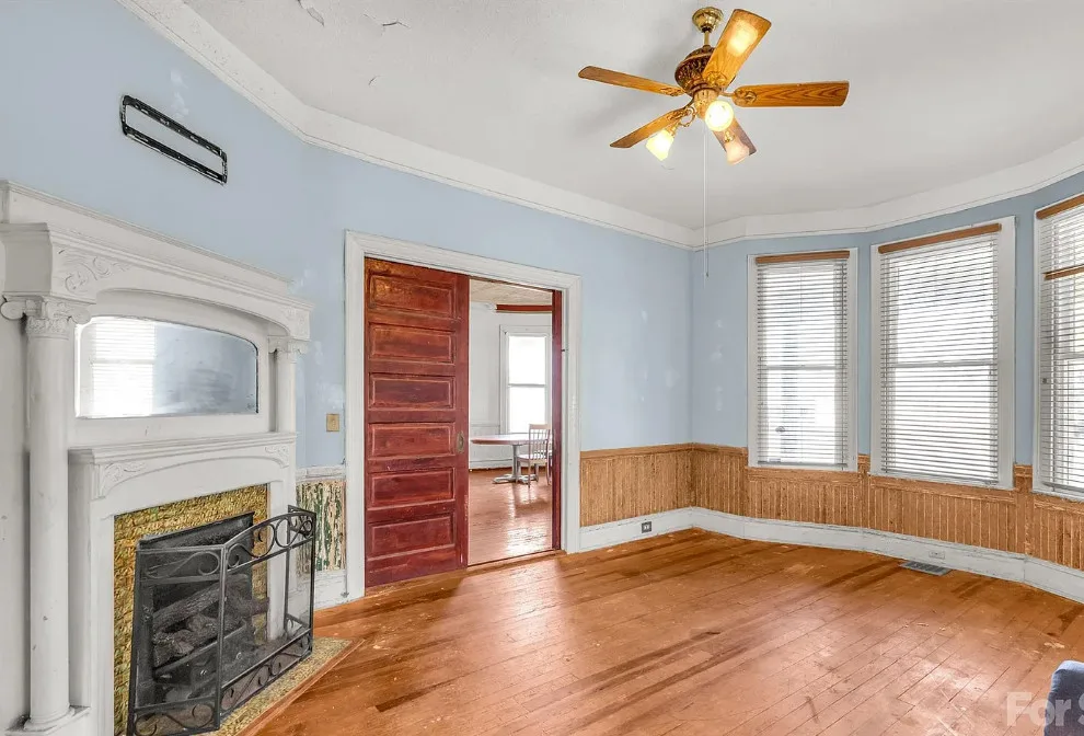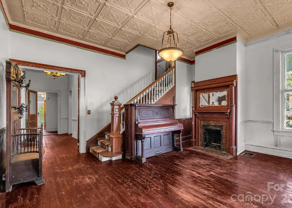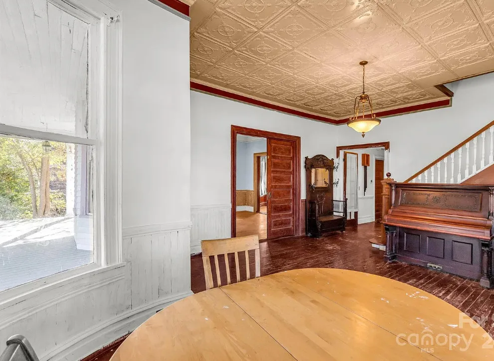 This house has pretty exterior details! I like the porch! The house was built in 1892. It is located on .52 acre in Clover, South Carolina. The house features a large wrap around porch, wood floors, pressed tin ceiling. pretty staircase, wide baseboards, crown moulding, pocket doors and bead board wainscoting. A good cleaning and some paint would go a long way with this house. Four bedrooms, two bathrooms and 3,234 square feet. $319,900
