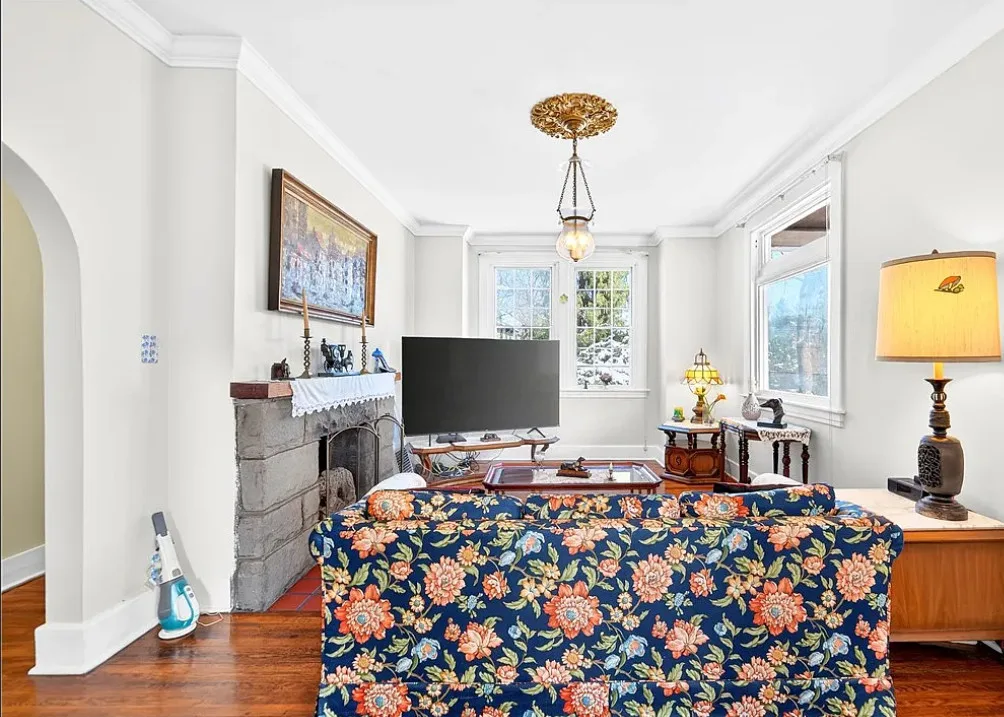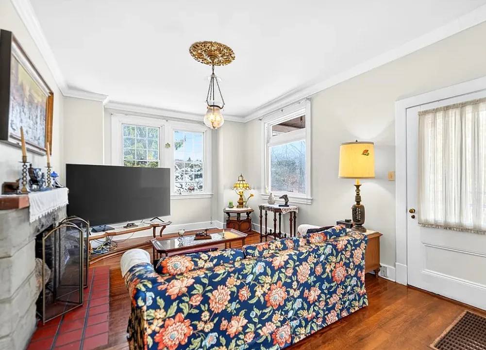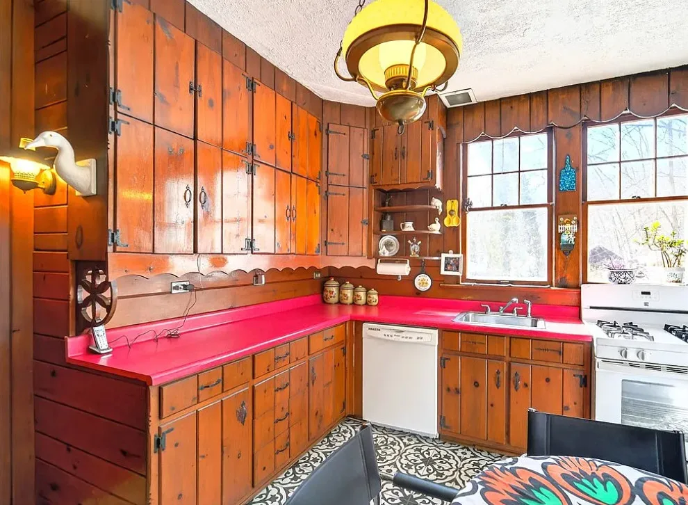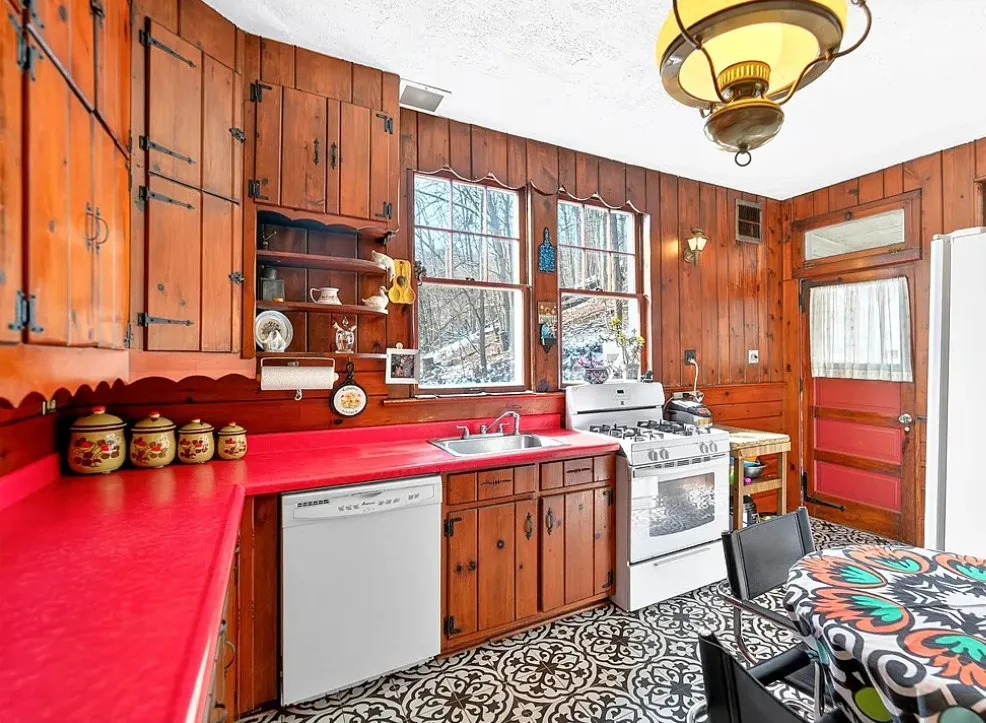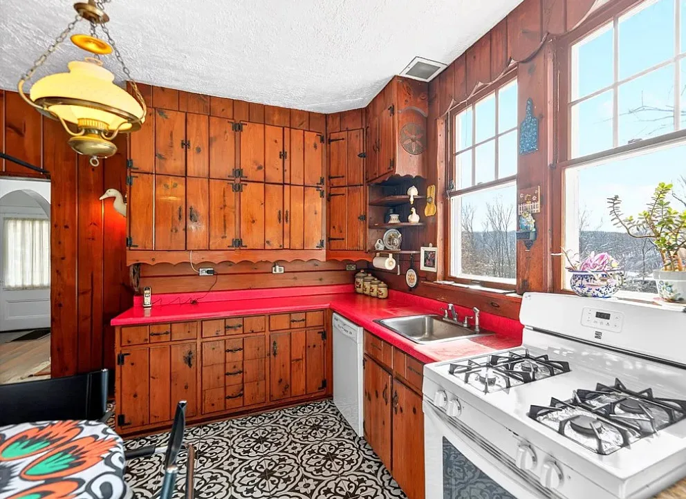 This is a cute house! Nice view! There are some pretty light fixtures inside! But I’m not sure how I feel about the kitchen floor. The house was built in 1905. It is located on .93 acre in Allison Park, Pennsylvania. The house features a covered front porch, original wood floors, crown moulding, wide baseboards, vintage light fixtures, knotty pine cabinetry in the kitchen and a lot of natural light. There is a detached garage on the property. Four bedrooms, one bathroom and 1,498 square feet. $219,900