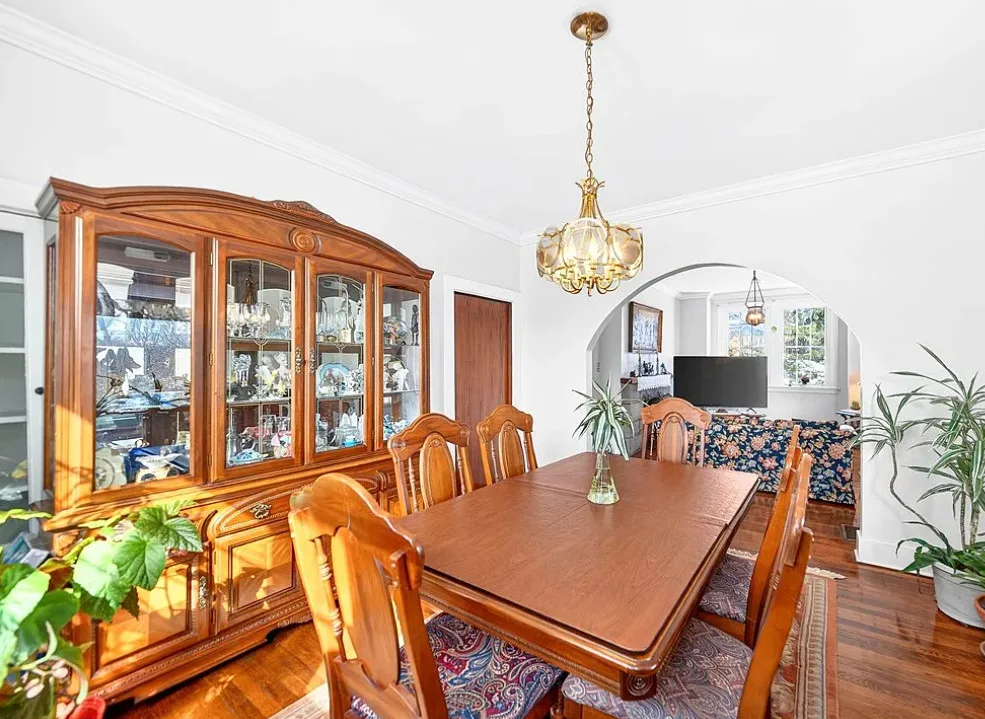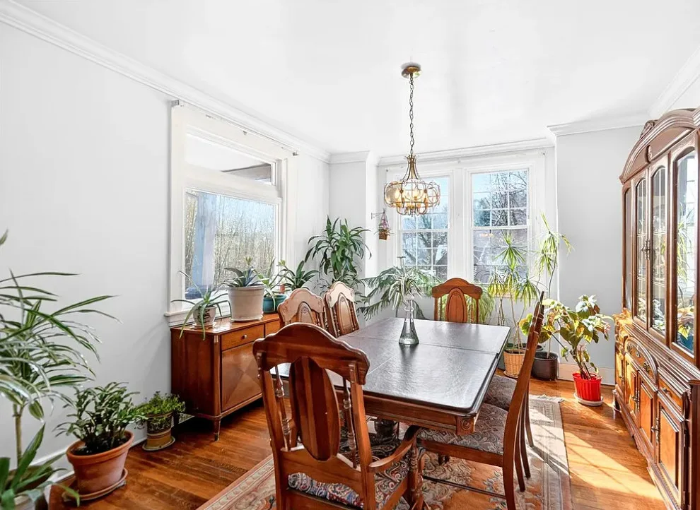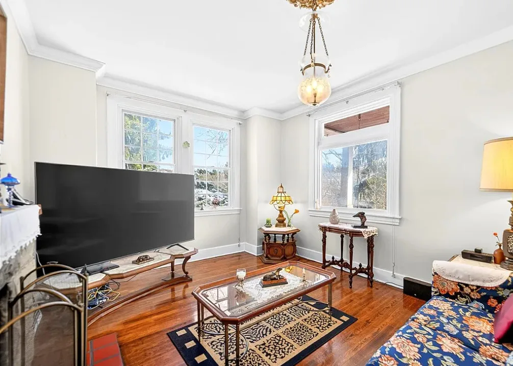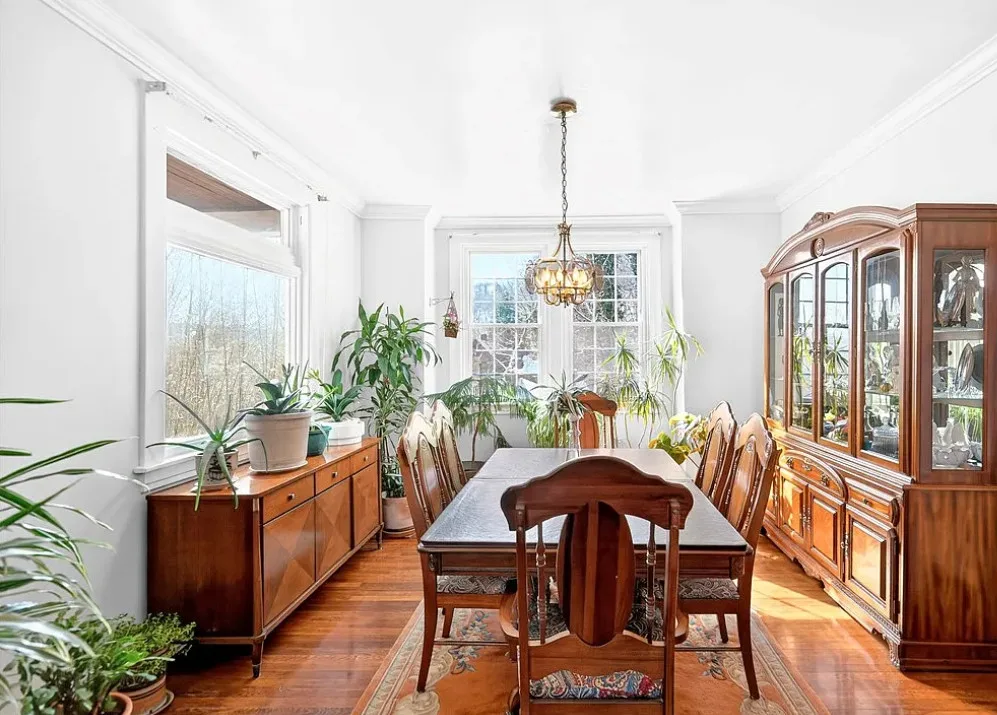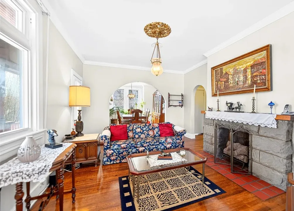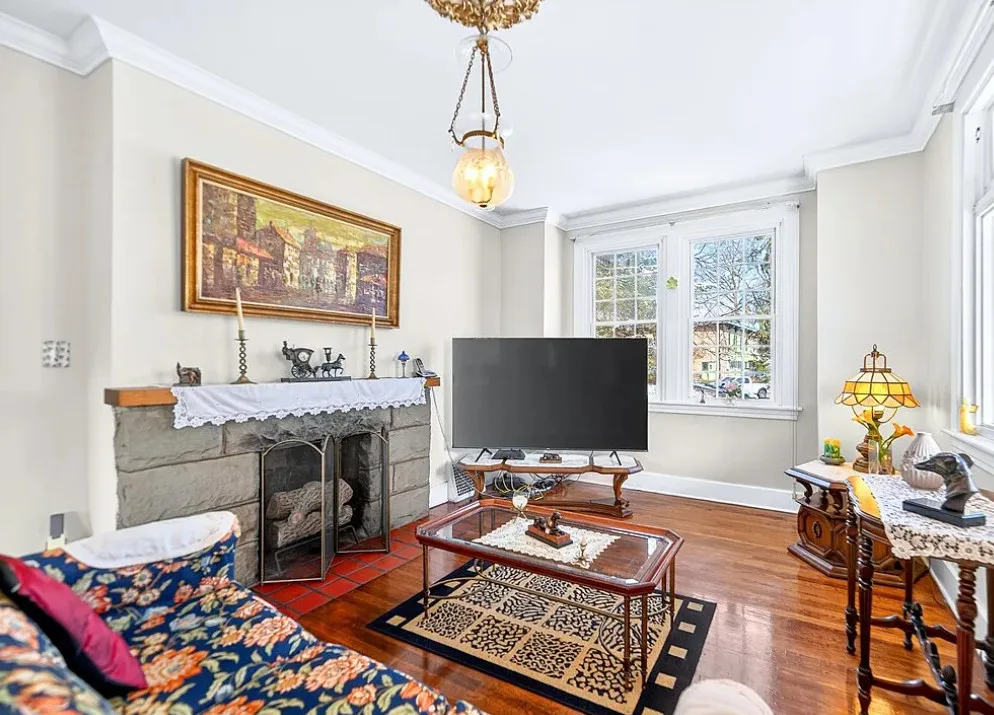 This is a cute house! Nice view! There are some pretty light fixtures inside! But I’m not sure how I feel about the kitchen floor. The house was built in 1905. It is located on .93 acre in Allison Park, Pennsylvania. The house features a covered front porch, original wood floors, crown moulding, wide baseboards, vintage light fixtures, knotty pine cabinetry in the kitchen and a lot of natural light. There is a detached garage on the property. Four bedrooms, one bathroom and 1,498 square feet. $219,900