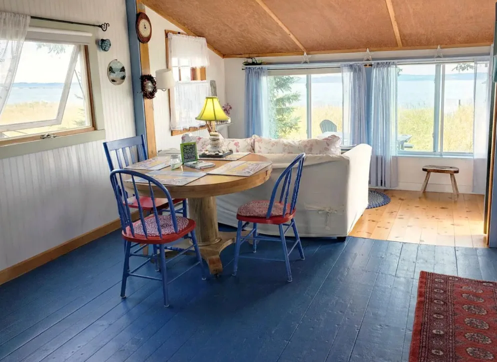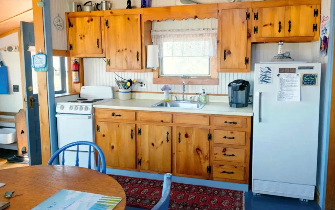 How cute is this Maine beach cottage! I love that sandy beach. This three season cottage is being sold furnished and is a successful vacation rental. It is known as Sweet Pea. It was built in 1930. Sweet Pea is located on .48 acre in Jonesport, Maine. The cottage features shake siding, wood floors, knotty pine kitchen cabinets and bead board. One bedroom, one bathroom and 450 square feet. $399,900