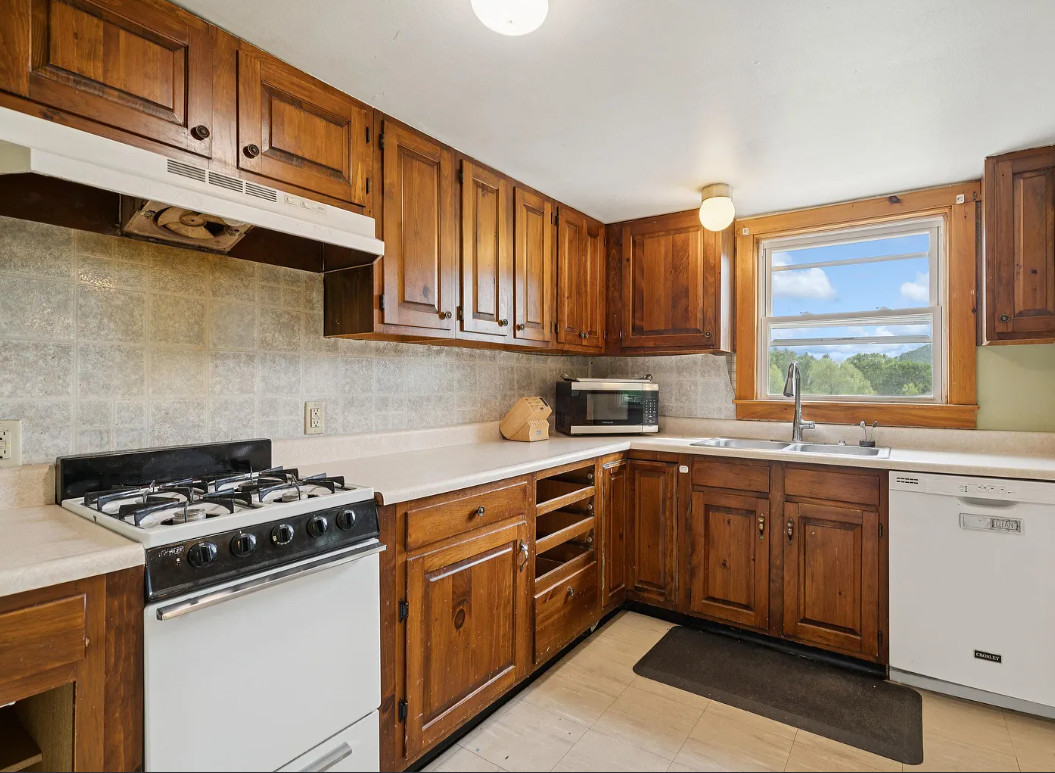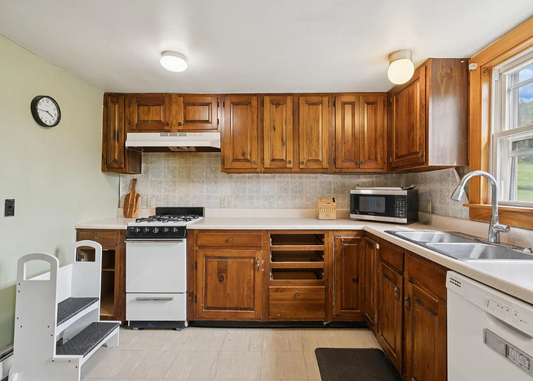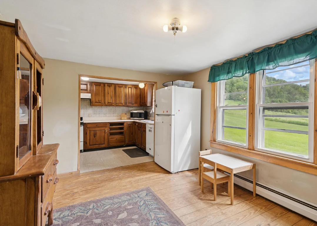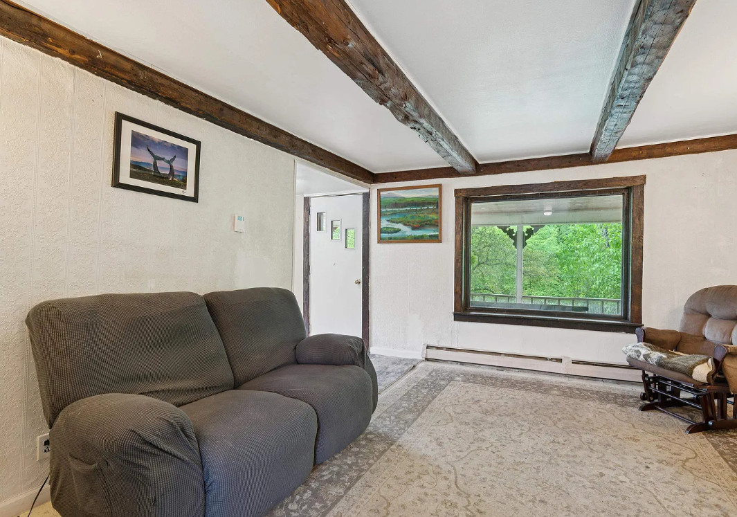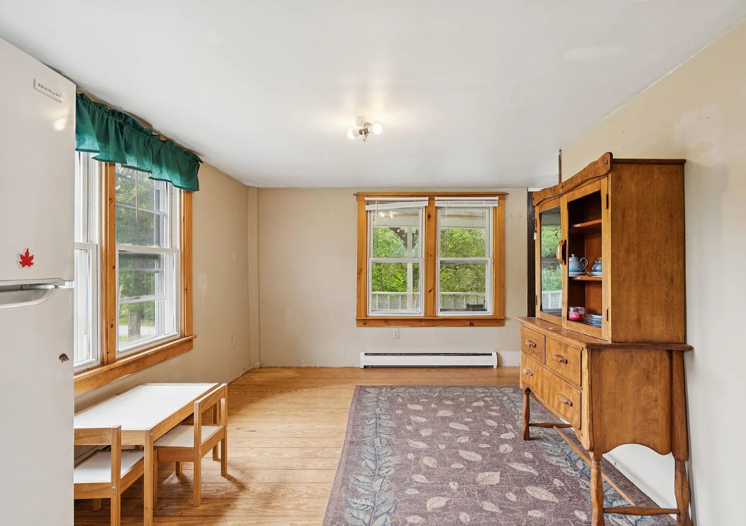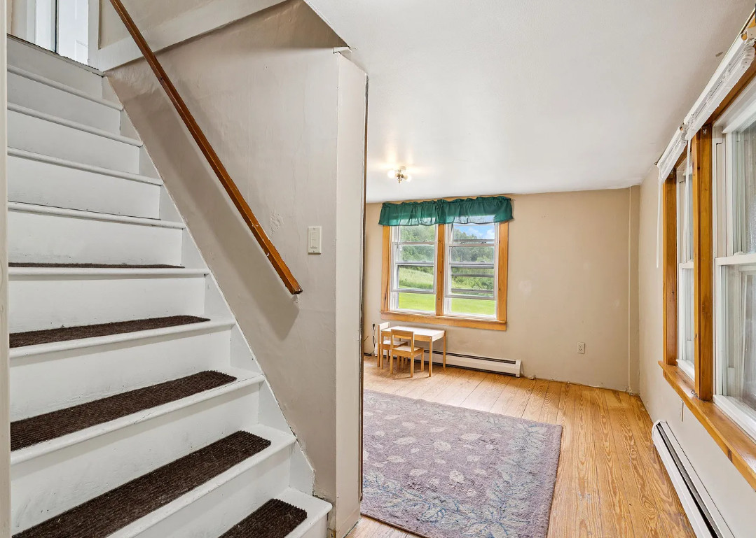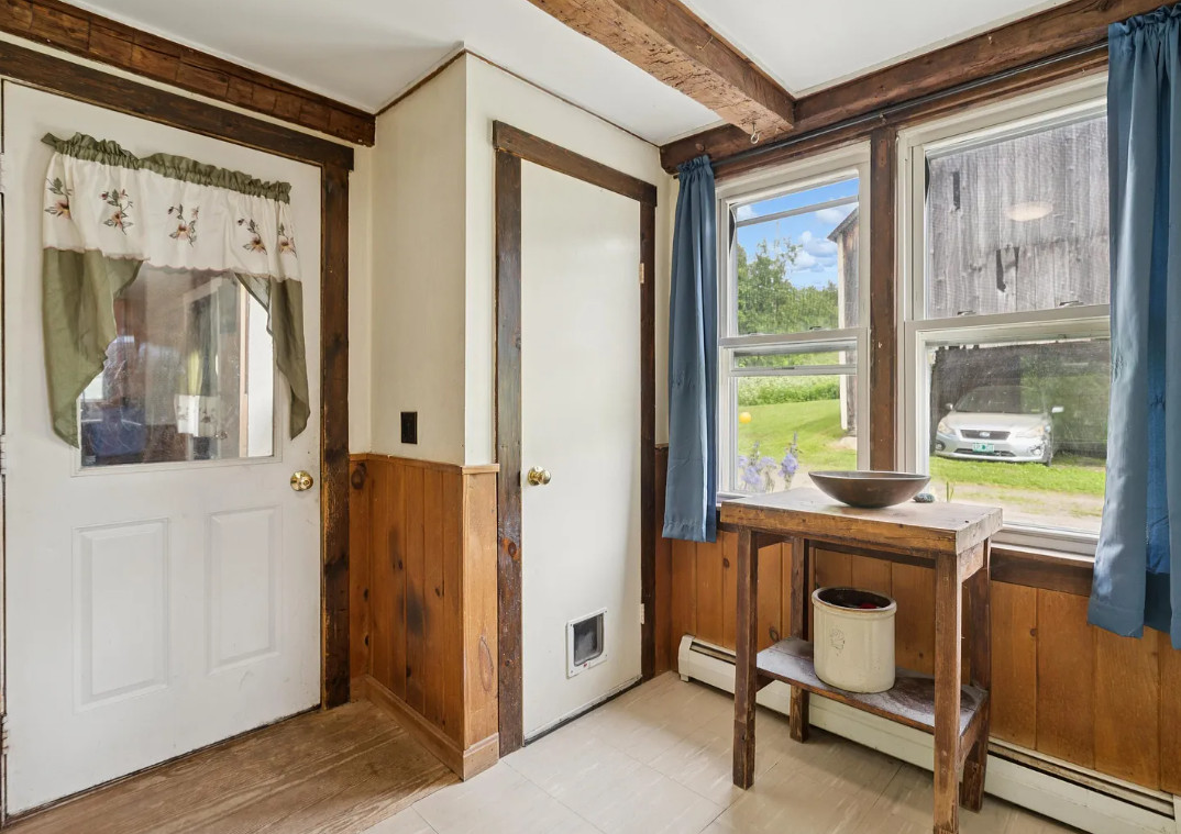 This house has a pretty setting! Love the old barn. The house was built in 1900. It is located on 2.1 acres in Chelsea, Vermont. The house features a covered front porch, wood floors, spacious kitchen, screened in porch and exposed beams. There are a couple of outbuildings on the property, including a big old barn. Three bedrooms, one bathroom and 1,188 square feet. $250,000