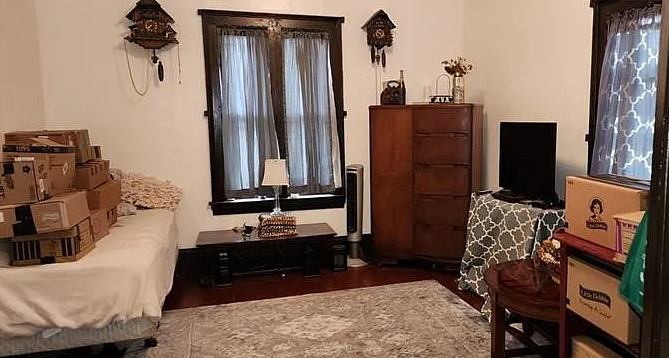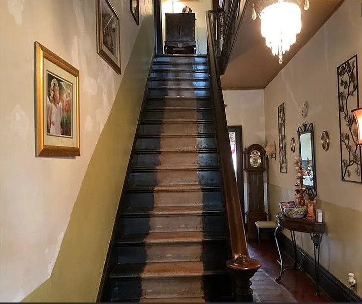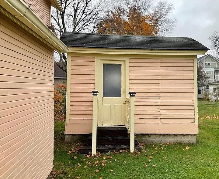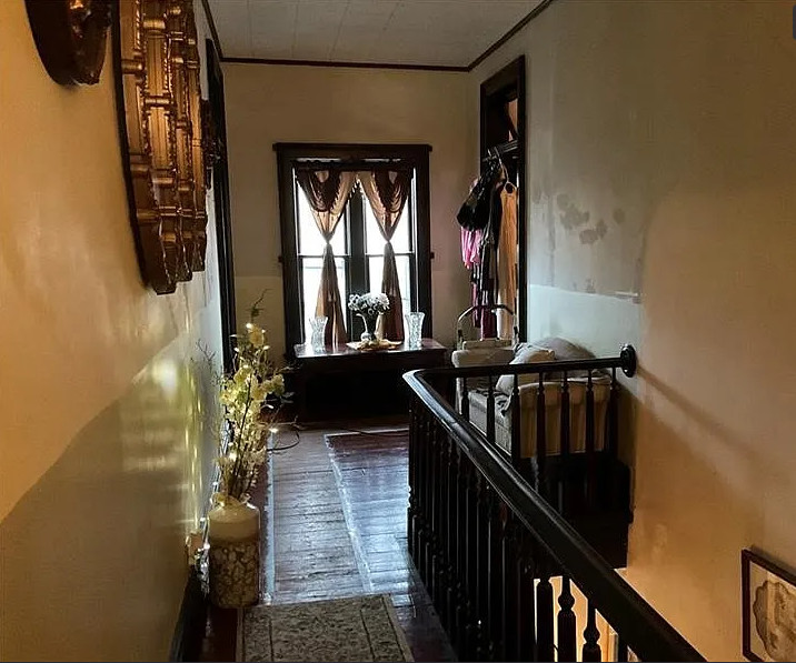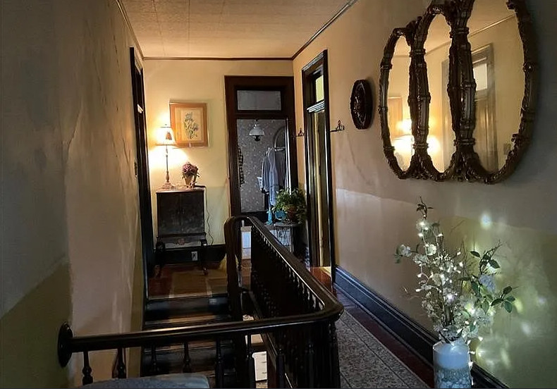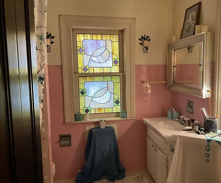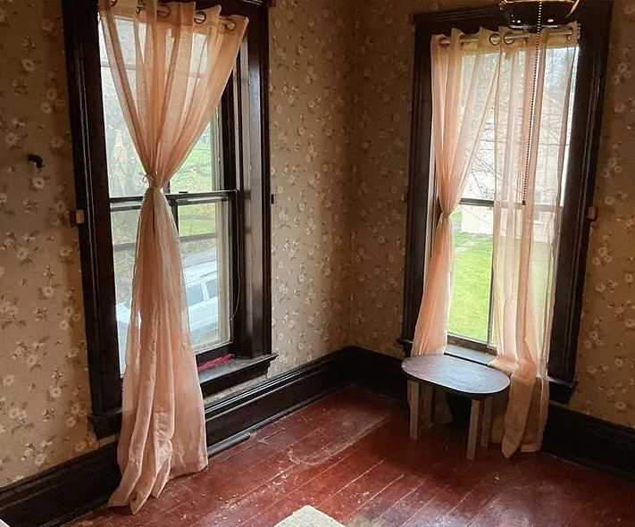 This house has nice details! The stained glass is pretty! The house was built in 1869. It is located on .26 acre in Parker, Pennsylvania. The house features a covered front porch, wood floors, stained glass windows and wide baseboards. There is a large workshop on the property. Four bedrooms, two bathrooms and 2,401 square feet. $75,000
