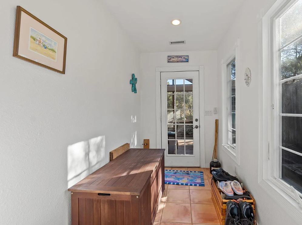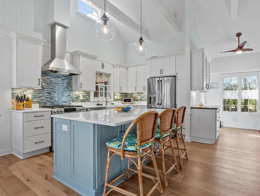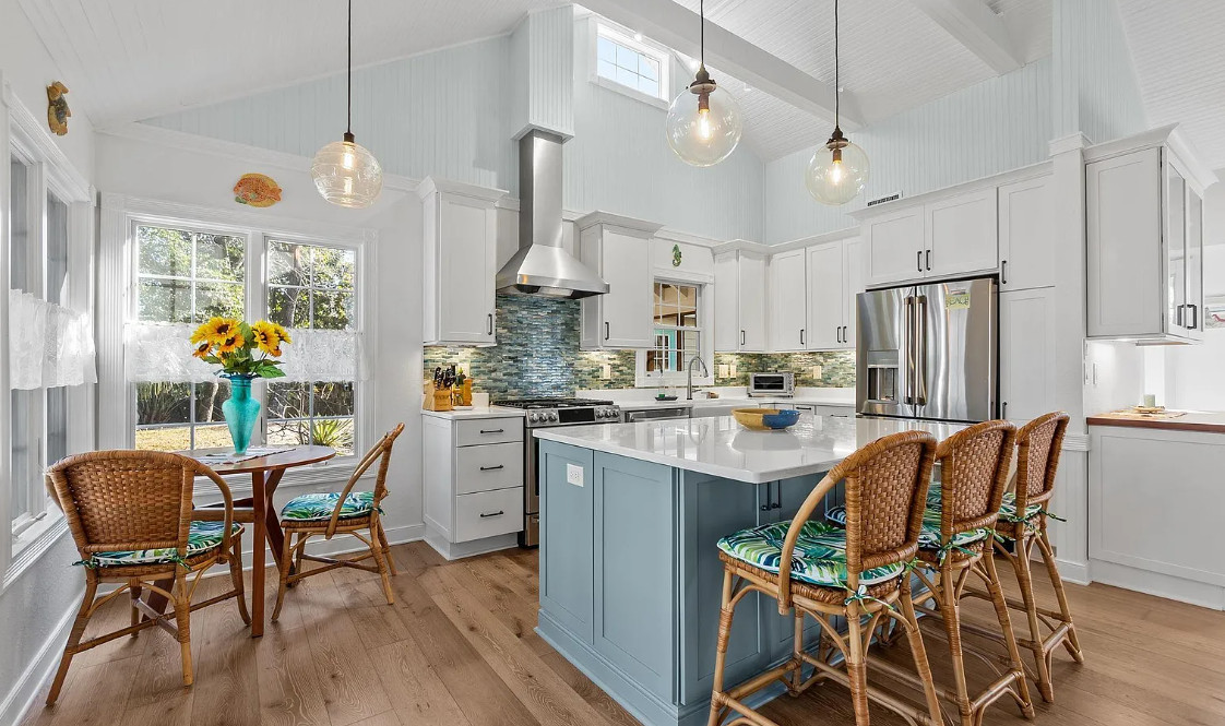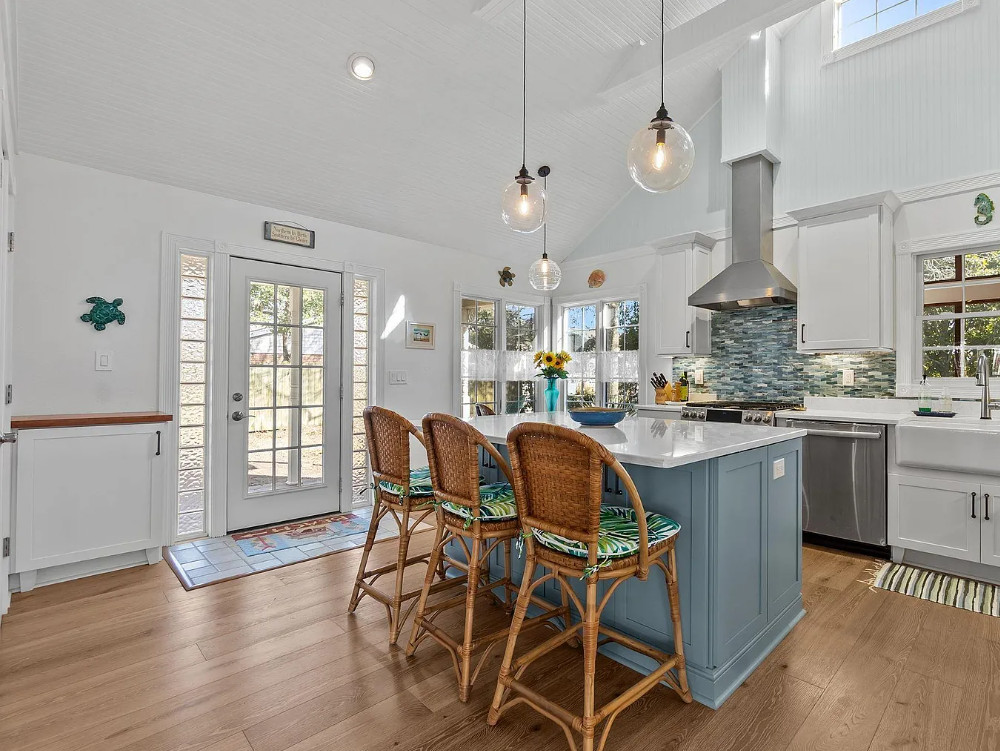 In the Outer Banks! How about that kitchen! So much natural light! The house was built in 1930. It is located on .3 acre in Kitty Hawk, North Carolina. The house features a screened in front porch, a screened in back porch, covered side porch, updated kitchen with soaring ceilings, wood floors, wainscoting and a great bathroom with claw foot tub and balcony. There is a detached garage with a full bathroom on the property. Three bedrooms, two bathrooms and 1,866 square feet. $539,000