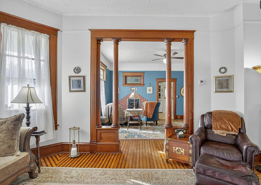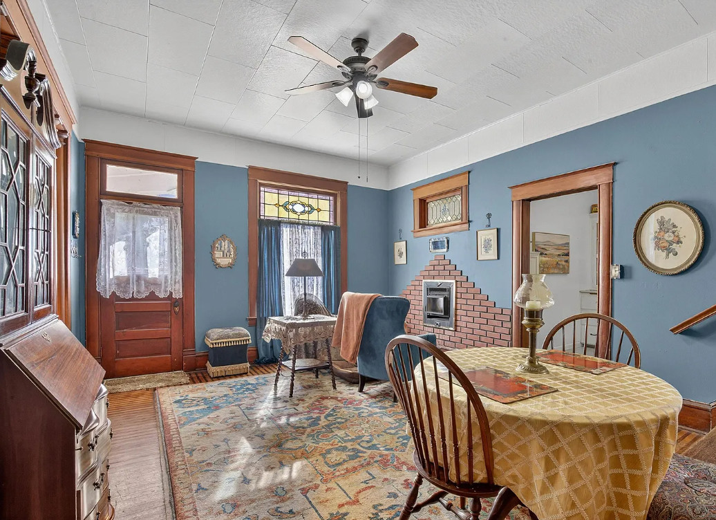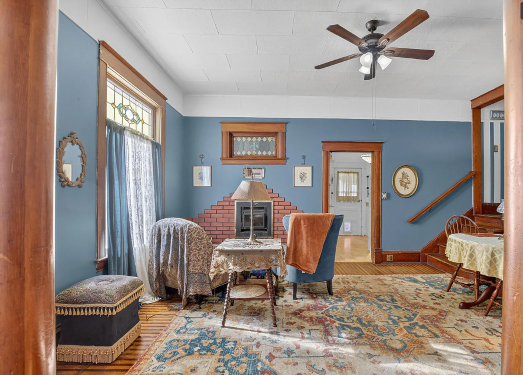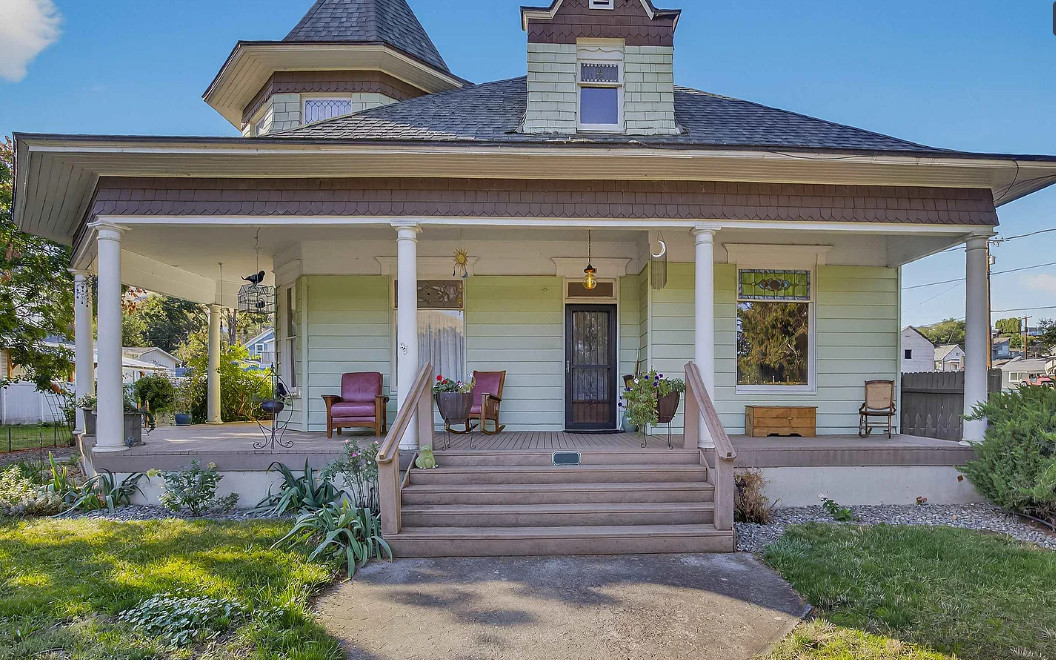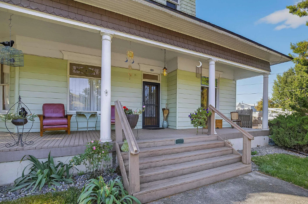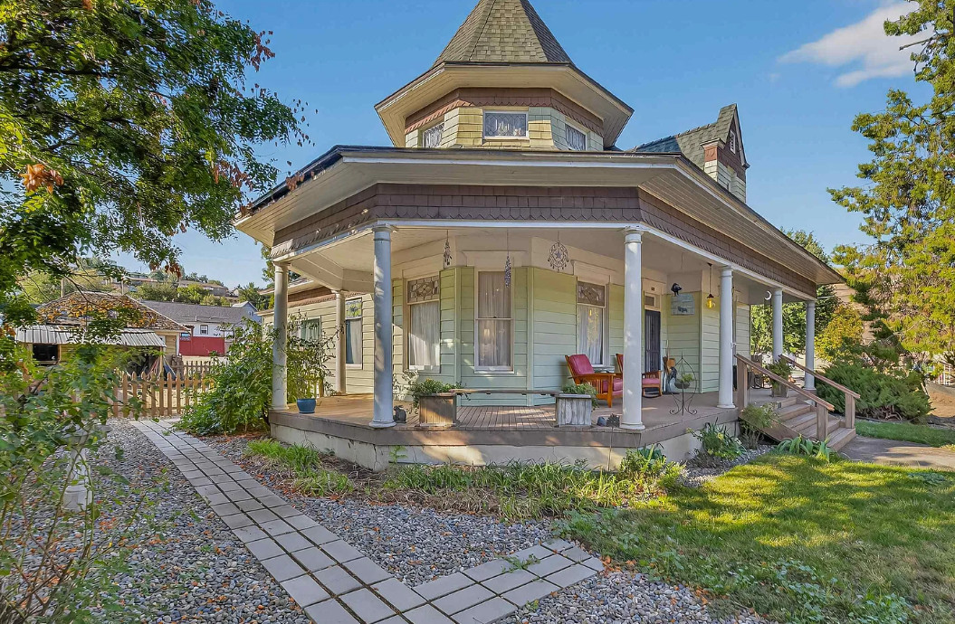 This house has unique wood floors! I love the porch and the staircase! The house was built in 1905. It is located in Asotin, Washington. The house features a pretty wrap around front porch, unique wood floors, stained glass transom windows, picture rails, nice staircase, unpainted woodwork, wide baseboards, vintage light fixtures and solid wood doors. If you pull up street view you can see the house has pretty scenery. Four bedrooms, one bathroom and 1,842 square feet. $335,000