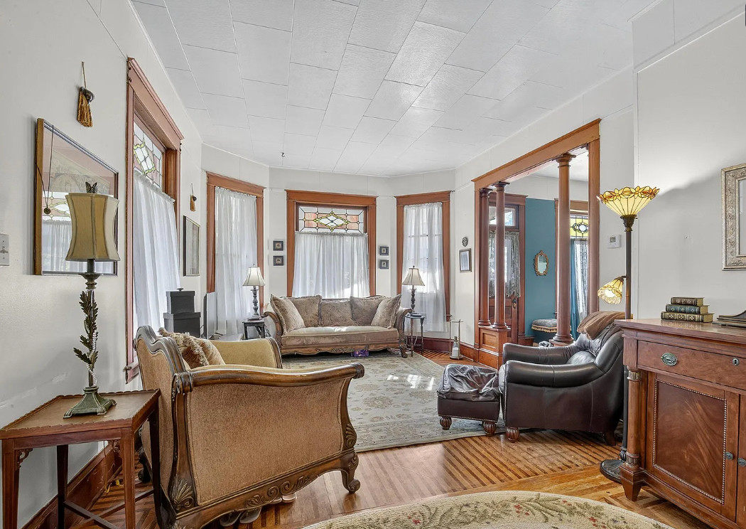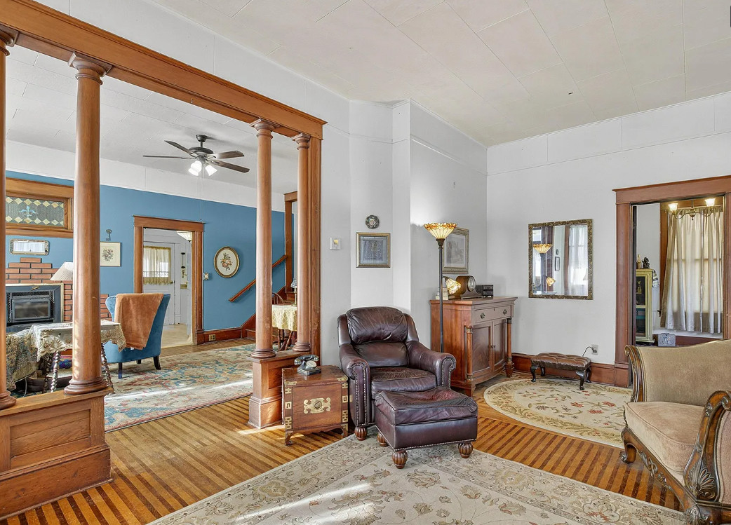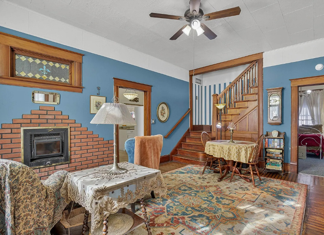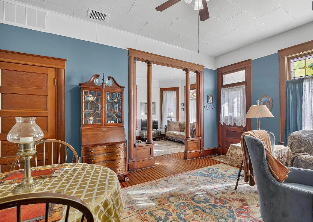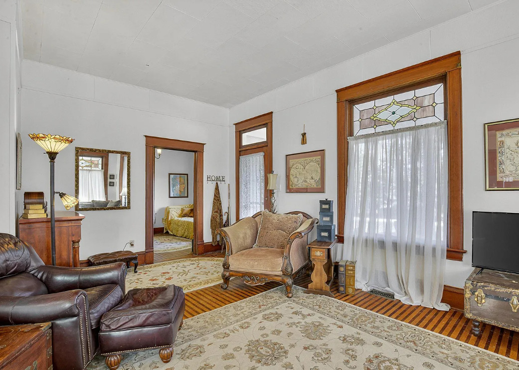 This house has unique wood floors! I love the porch and the staircase! The house was built in 1905. It is located in Asotin, Washington. The house features a pretty wrap around front porch, unique wood floors, stained glass transom windows, picture rails, nice staircase, unpainted woodwork, wide baseboards, vintage light fixtures and solid wood doors. If you pull up street view you can see the house has pretty scenery. Four bedrooms, one bathroom and 1,842 square feet. $335,000