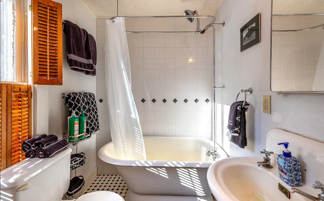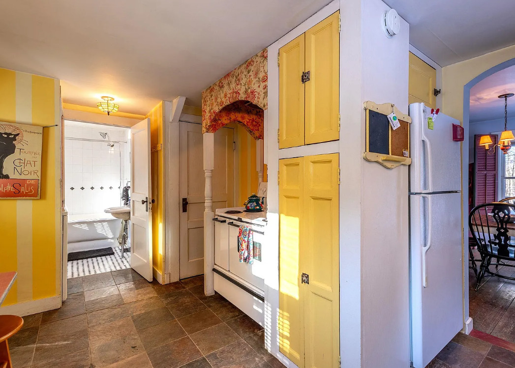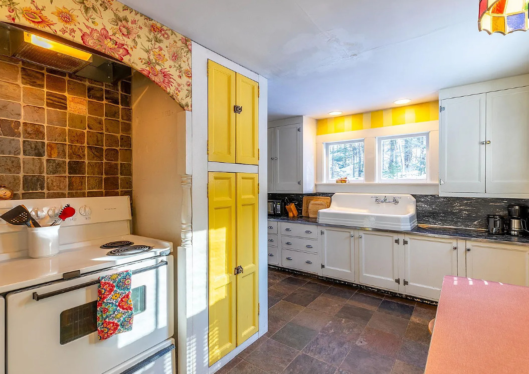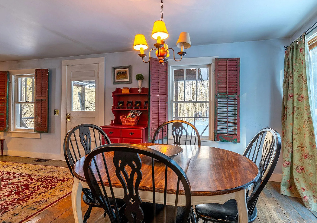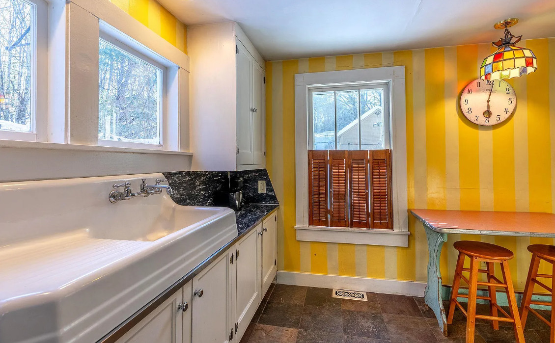 Love this house! The kitchen is perfect! The house was built in 1940. It is located on 1.23 acres in South Londonberry, Vermont. The house features wainscoting, soaking tub, vintage kitchen sink, vintage stove, wood floors, brick fireplace, baseboards, screened in porch and indoor shutters. There is a detached garage on the property. Two bedrooms, two bathrooms and 976 square feet. $325,000
