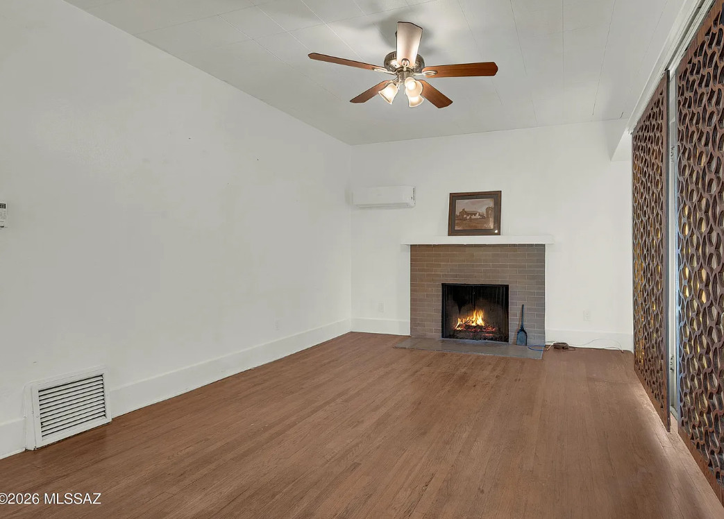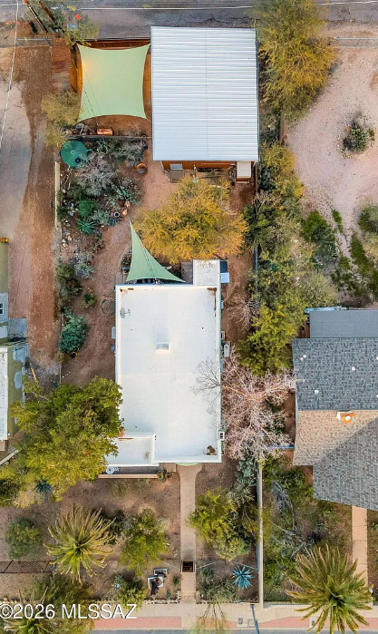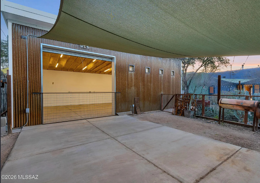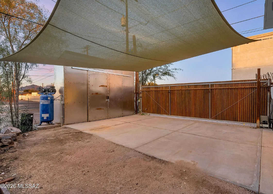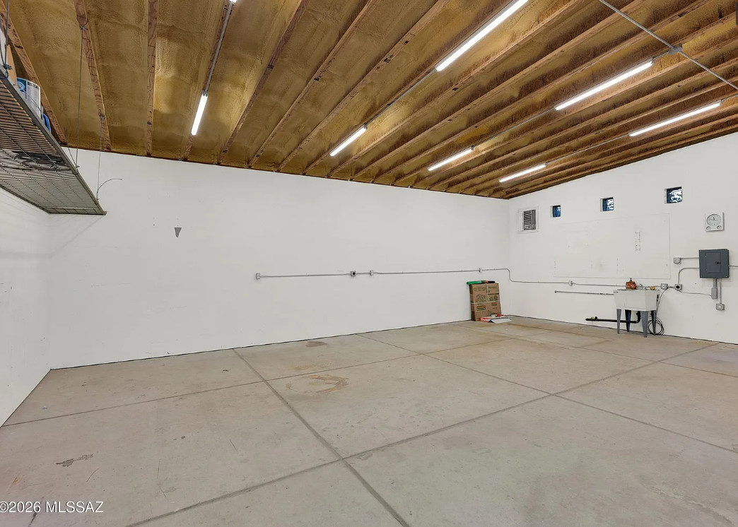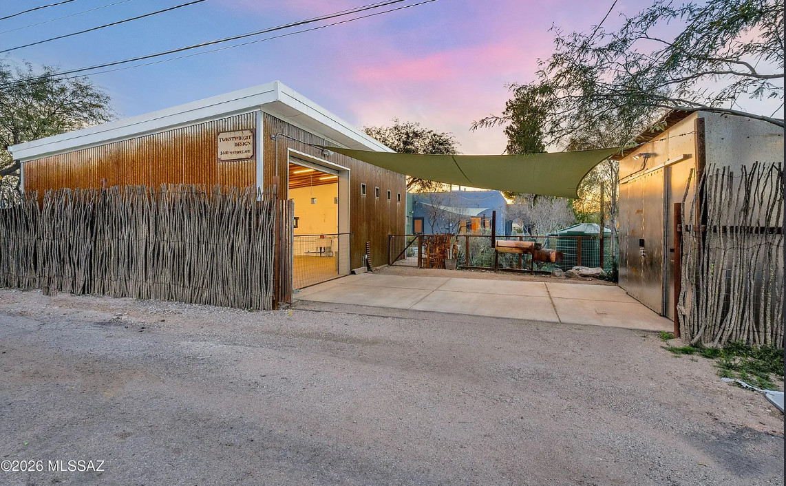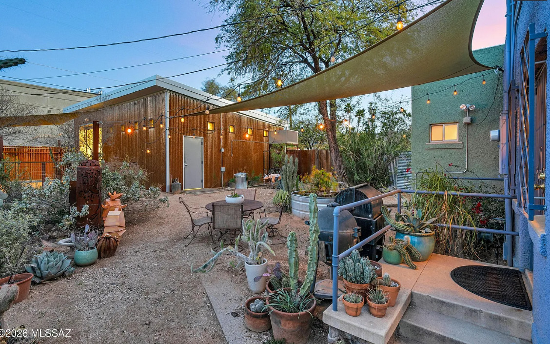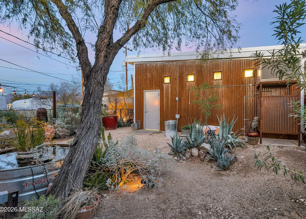 This charming 1920s home will SURPRISE you at every turn. Updated plumbing and electrical w/ C-3 commercial zoning and a 759 sq ft ICF WORKSHOP/GARAGE built in 2021 that is swamp-cooled w/ 10-12ft ceiling height, and equipped with a utility sink, a compressor, 100amp subpanel, and a 10×10 ft metal roll-up door. The back yard features a remote-controlled rolling gate leading to 2 shade covered parking spaces, a steel storage shed, and an inviting back yard that wraps around the home, complete with a stock tank pond/water feature, rainwater harvesting, and an outdoor shower. The INTERIOR of the home has been thoughtfully preserved, yet beautifully improved upon. There’s even a 558 sq ft FULLY FINISHED BASEMENT! Bustling Stone Ave location is a short walk to downtown, University of Arizona, and Pima Community College. See Features List and photo captions.