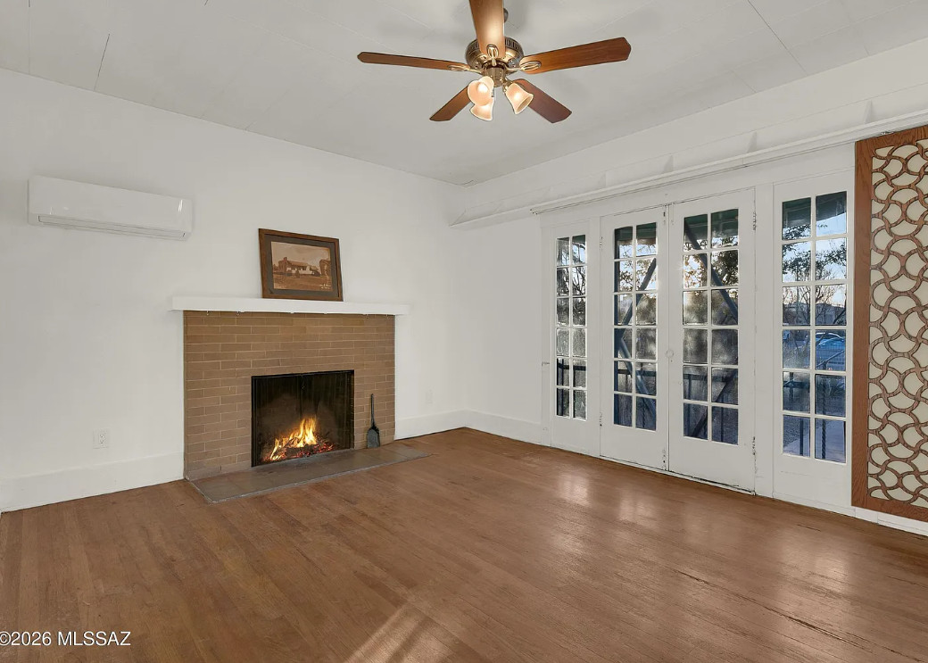 This is cute! I love the exterior and the yard! The house was built in 1923. It is located in Tucson, Arizona. The house features a covered porch, large patio, wood floors, brick fireplace, french doors, arched entryways and baseboards. The house has a finished basement. There is a large workshop/garage on the property and an outdoor shower. Two bedrooms, two bathrooms and 1,686 square feet. $375,000