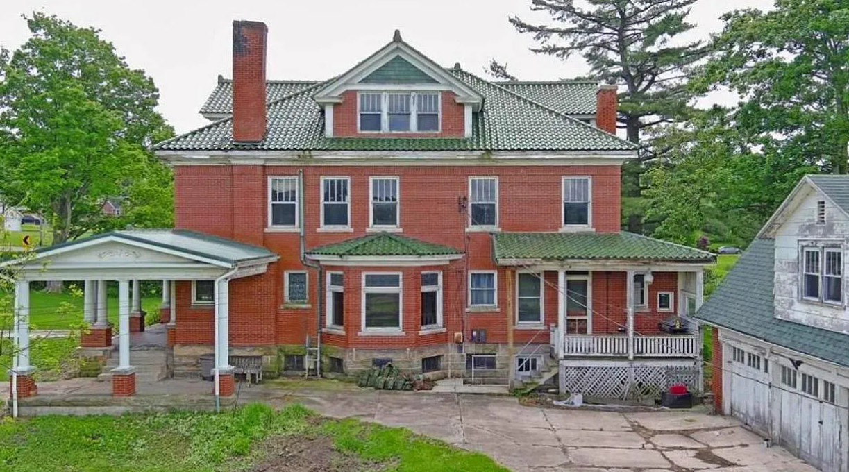 This is a big house with nine bedrooms and four bathrooms. There is also a detached guest apartment. The house was built in 1920. It is located on one acre in Salisbury, Pennsylvania. The house features a covered front porch, porte cochere, great sunroom, wood floors, tall ceilings, crown moulding, stained glass windows, french doors, vintage light fixtures and unpainted woodwork. There is a detached three car garage with a guest apartment above it. Just getting the house cleaned out would go a long way. Nine bedrooms, four bathrooms and 3,321 square feet. $220,000