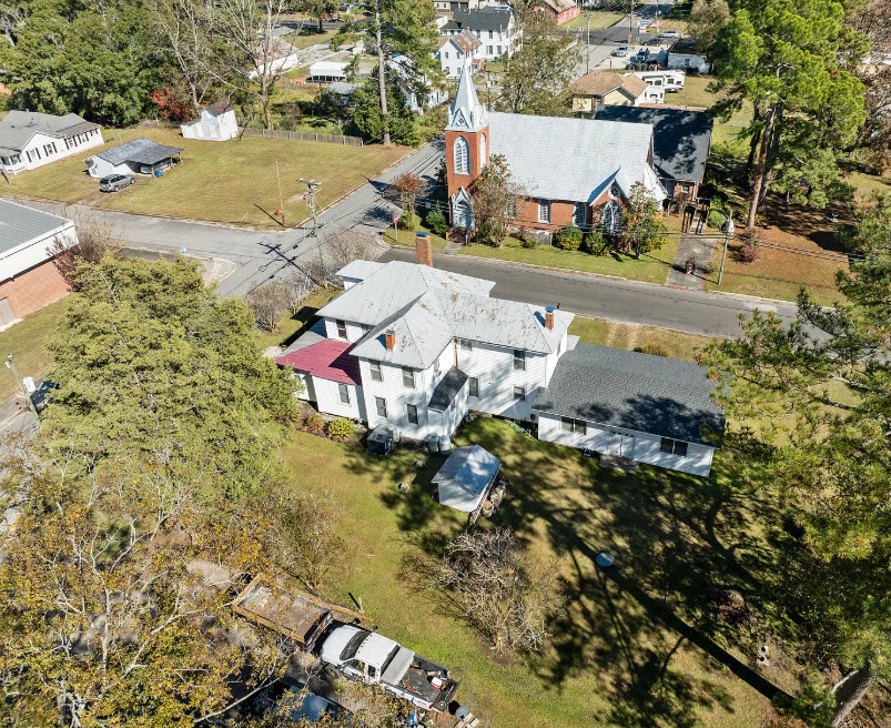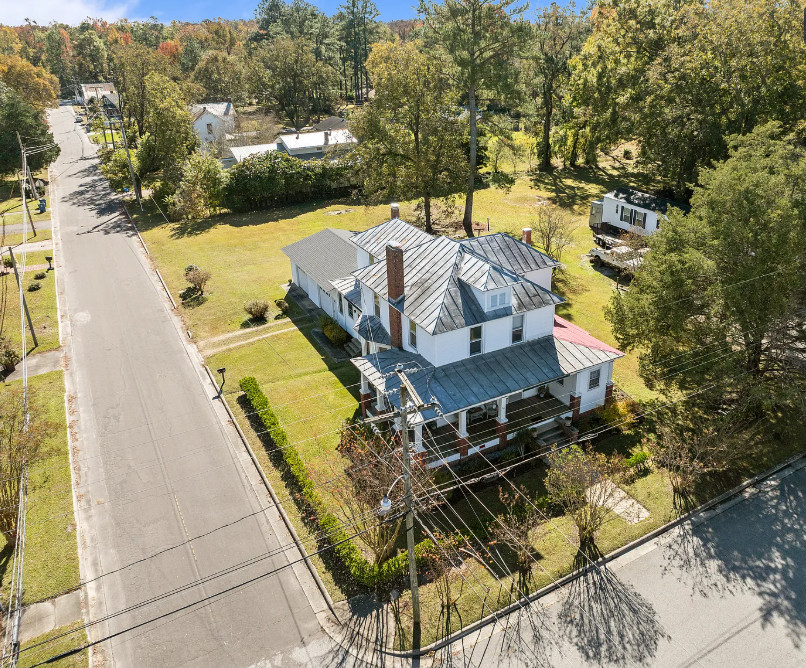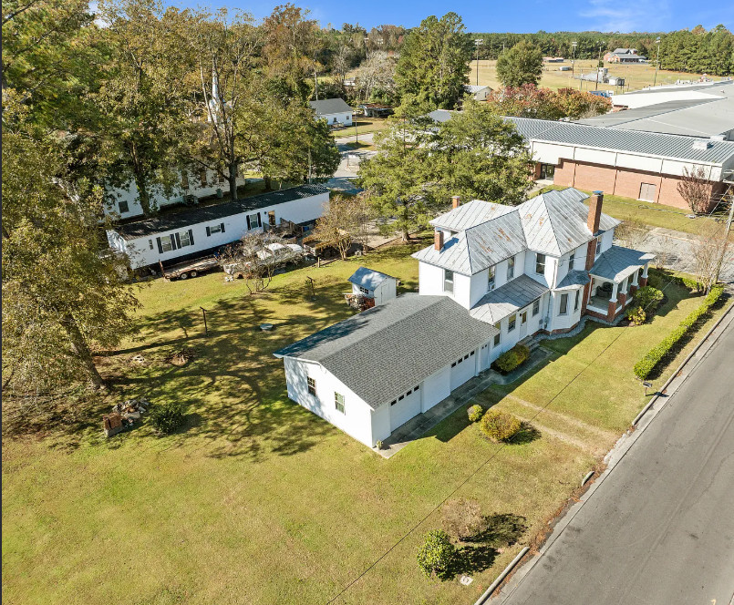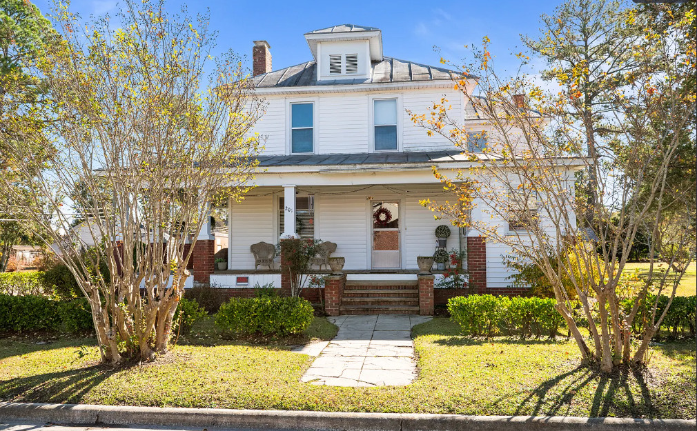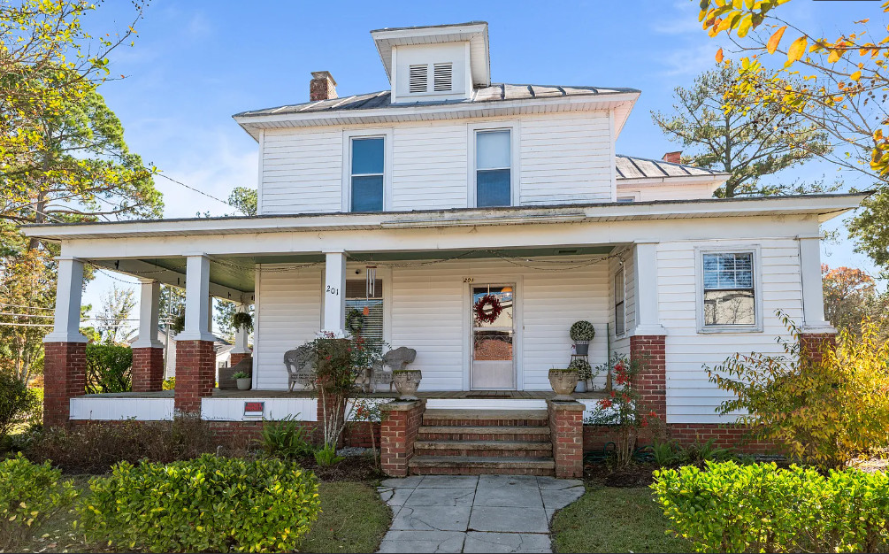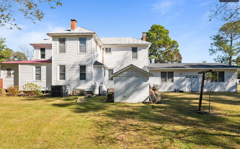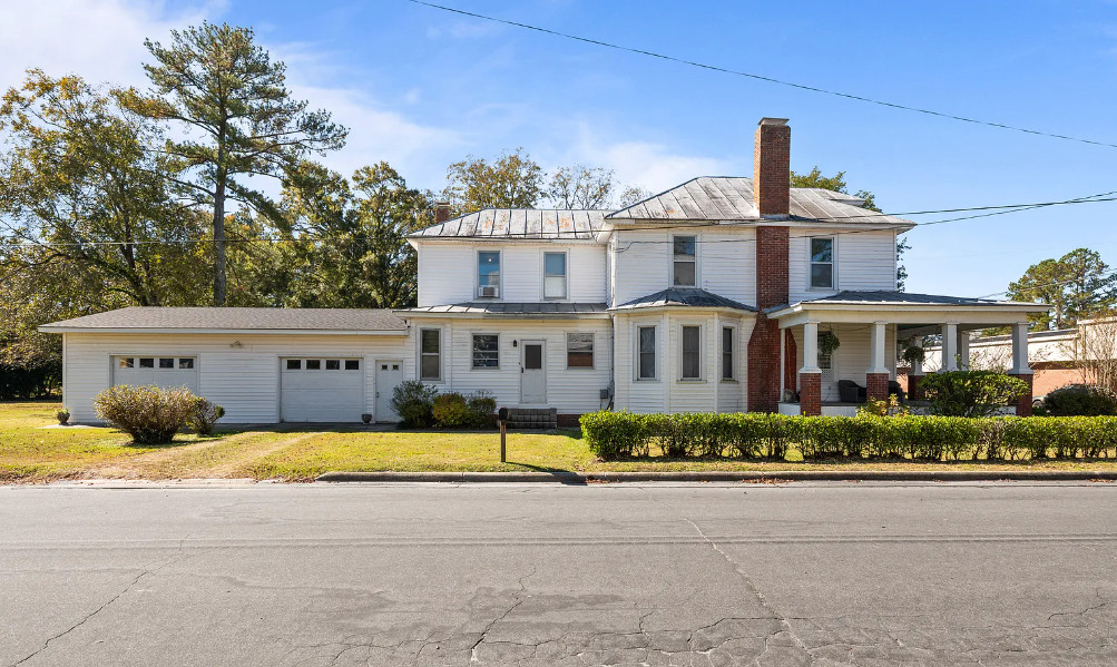 Under an hour to the Outer Banks! That’s a big porch! The house looks like it spans a half a block. The house was built in 1901. It is located on .3 acre in Creswell, North Carolina. The house features a large wrap around front porch, wood floors, nice staircase, french doors, baseboards, picture rails, vintage light fixtures, crown moulding, brick fireplace and a large built-in corner cabinet. There is an attached two car garage. The interior could use some color, but it is like a blank slate. Six bedrooms, two bathrooms and 2,727 square feet. $170,000