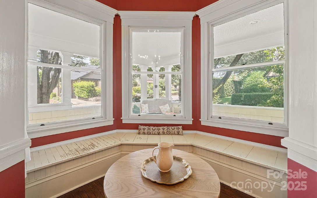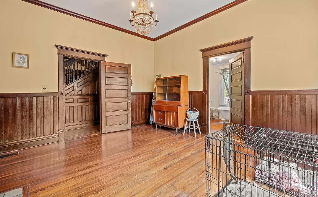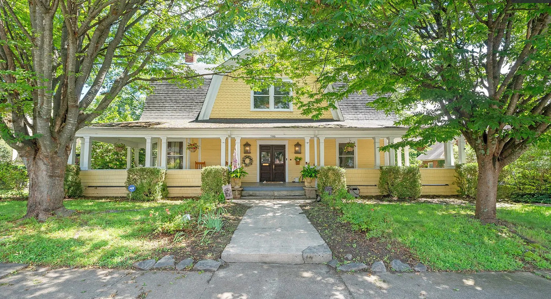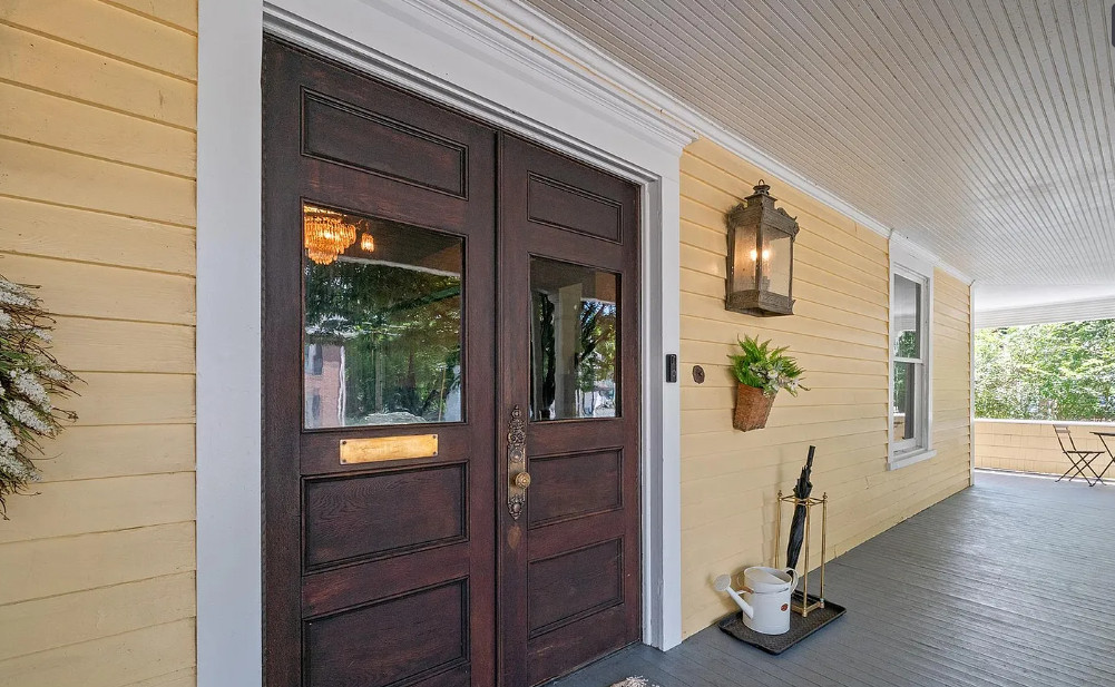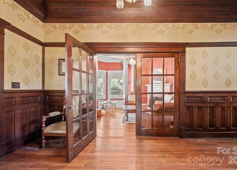This is such a pretty house! I love the yellow exterior and such a nice porch. The house was built in 1906. It is located on .53 acre in Lenoir, North Carolina. The house features a large covered front porch, pretty front door, beautiful foyer, wood floors, grand staircase, wainscoting, crown moulding, picture rails, bead board ceilings, french doors, wide baseboards, built-in seating, solid wood doors with original hardware, original mantels, claw foot tub, crystal chandelier, built-in china cabinet, spacious kitchen and leaded glass. There is a pretty backyard with mature landscaping. Four bedrooms, two bathrooms and 3,168 square feet. $385,000