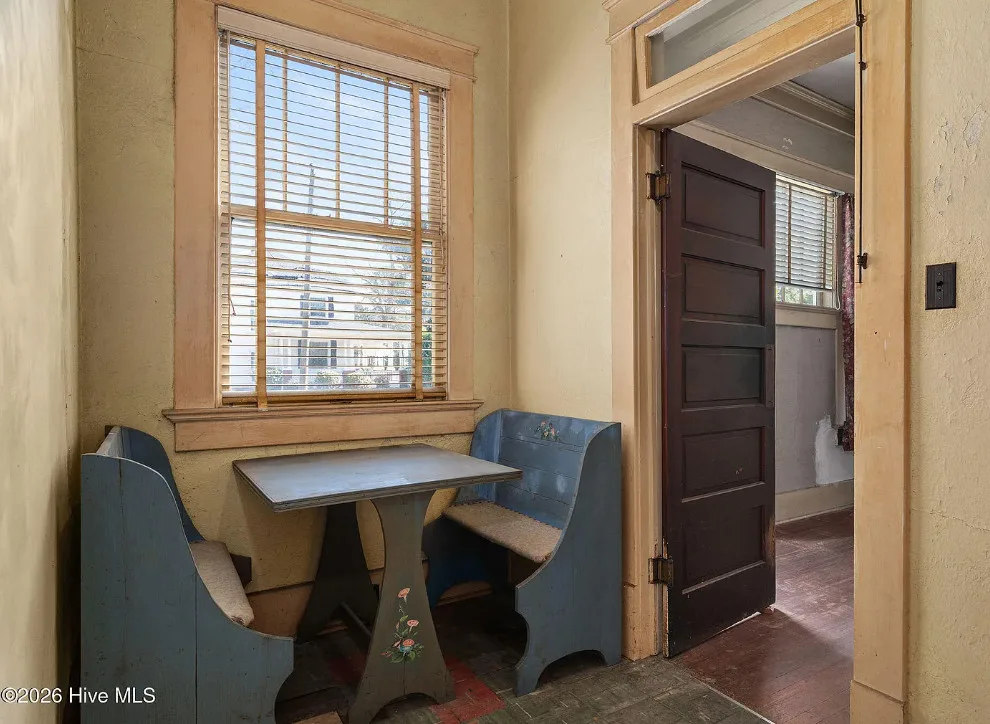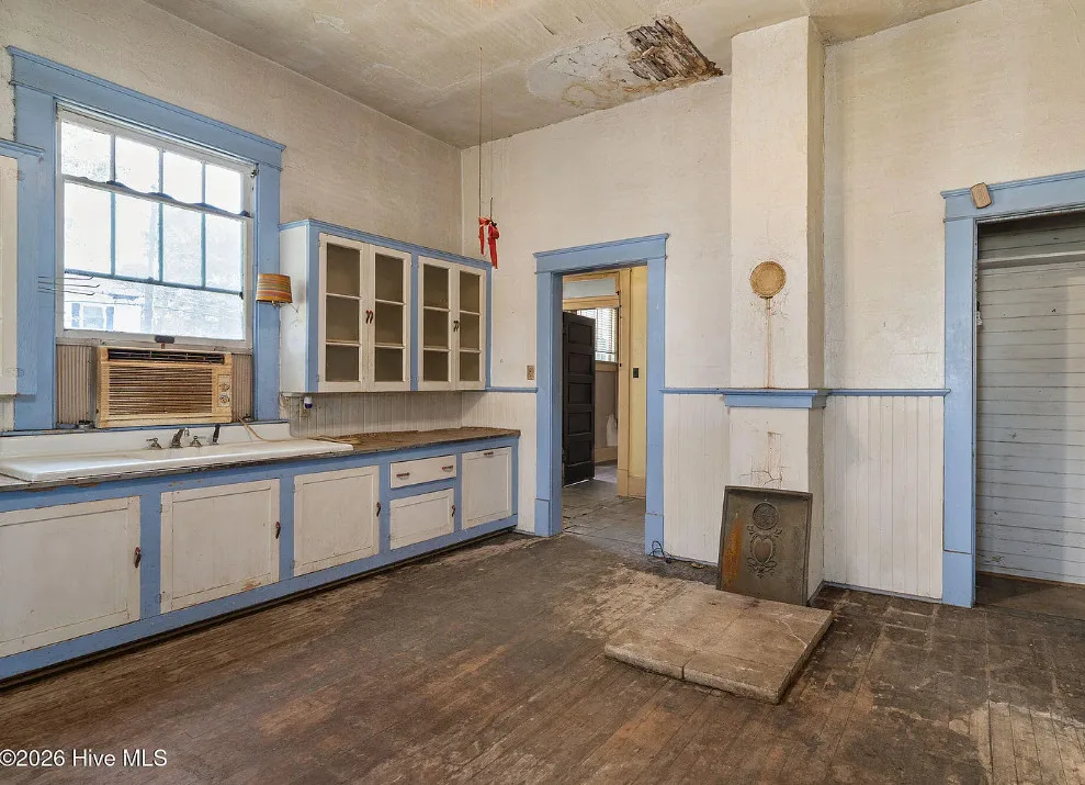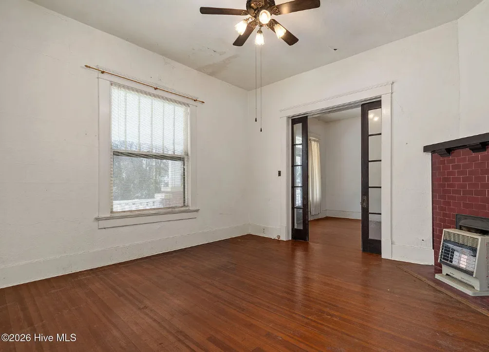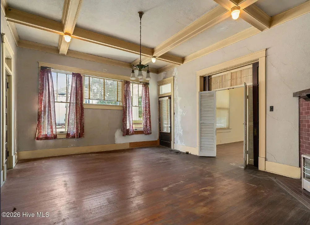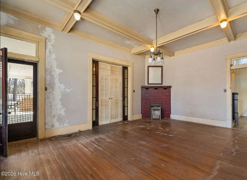 This house has some really nice details! I love the porch and the coffered ceiling! The house was built in 1928. It is located on .74 acre in Warsaw, North Carolina. The house features a large covered porch, a porte cochere, wood floors, pocket doors, coffered ceiling, brick fireplace, leaded glass window, transom windows, wide baseboards, nice butler’s pantry and picture rails. This house has a lot of potential! Three bedrooms, two bathrooms and 2,721 square feet. $199,000