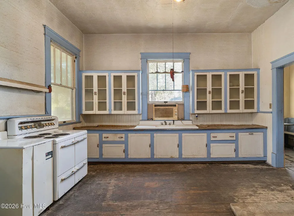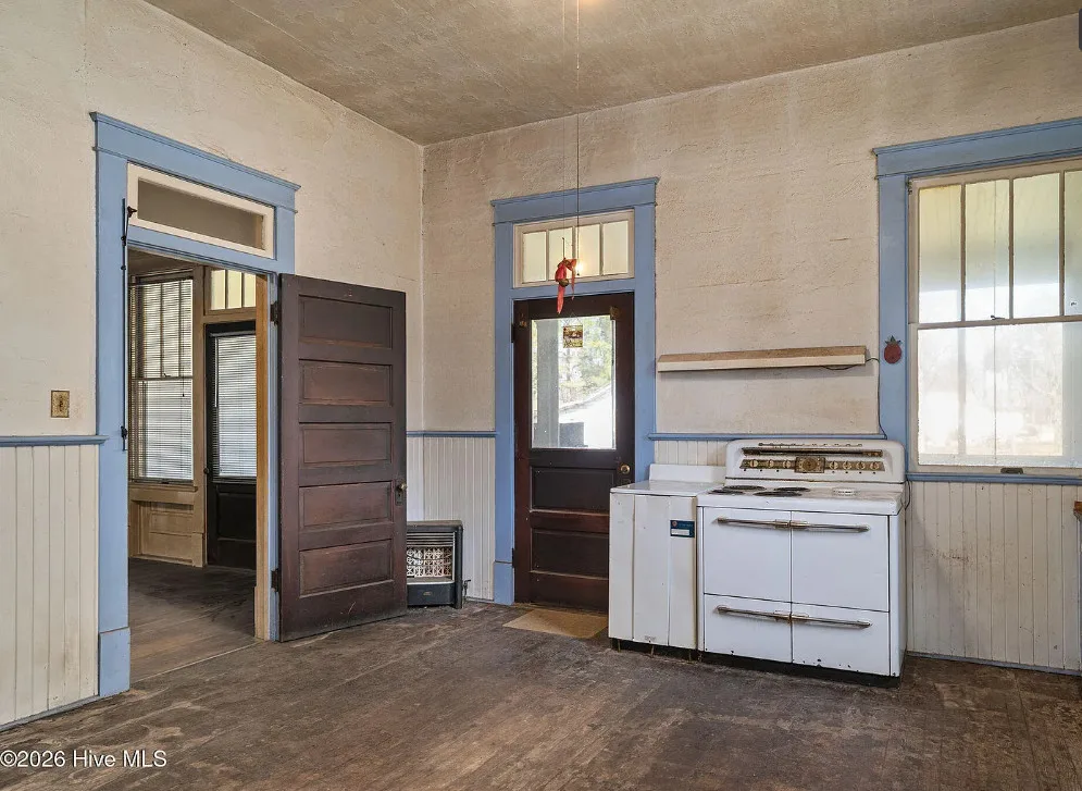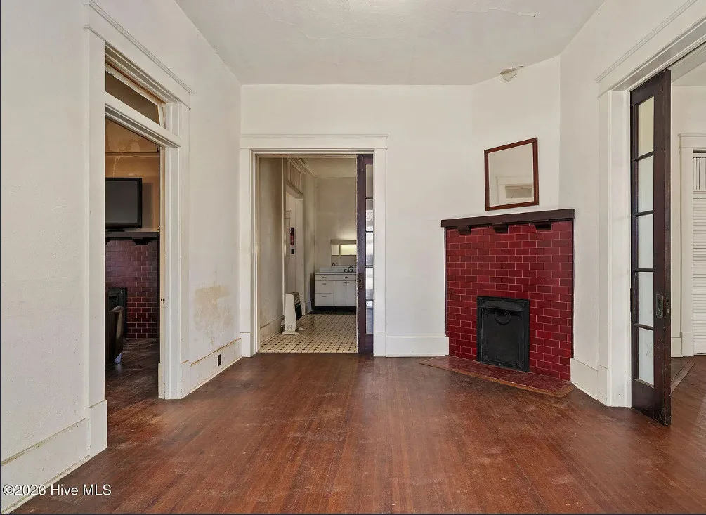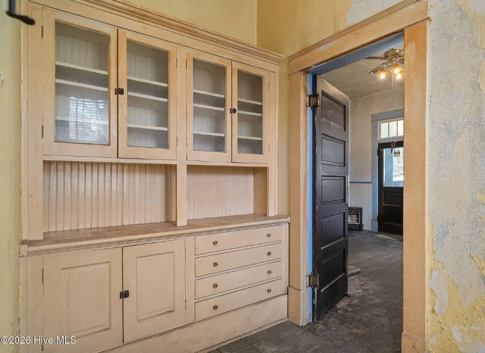 This house has some really nice details! I love the porch and the coffered ceiling! The house was built in 1928. It is located on .74 acre in Warsaw, North Carolina. The house features a large covered porch, a porte cochere, wood floors, pocket doors, coffered ceiling, brick fireplace, leaded glass window, transom windows, wide baseboards, nice butler’s pantry and picture rails. This house has a lot of potential! Three bedrooms, two bathrooms and 2,721 square feet. $199,000