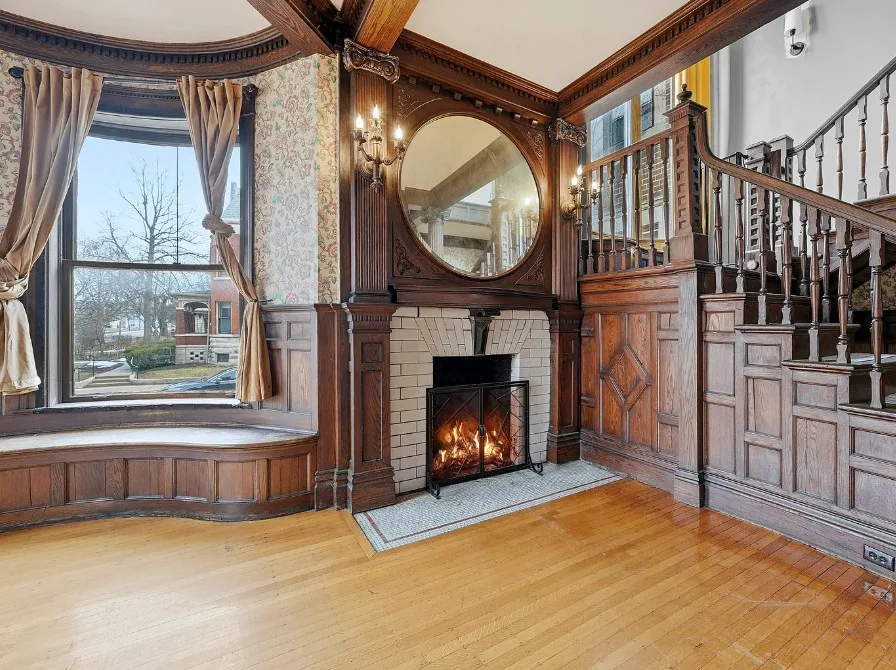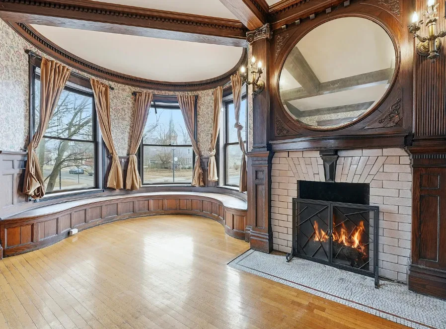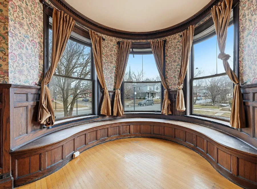 How about that staircase and entryway! This is a lot of house for the money. Almost 5,000 square feet. The house was built in 1876. It is located in Fort Wayne, Indiana. The house features a covered front porch, wood floors, baseboards, pocket doors, grand staircase, beautiful fireplace, built-in window seating, paneled wainscoting and a large back porch. Seems the second floor needs the most work, but the house is livable so someone could work room by room. Six bedrooms, five bathrooms and 4,736 square feet. $199,900