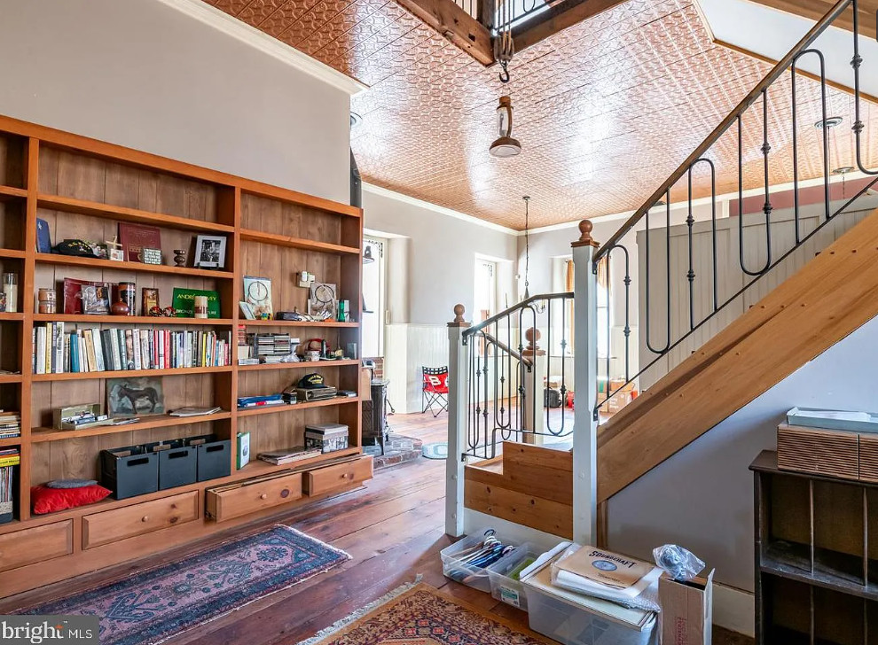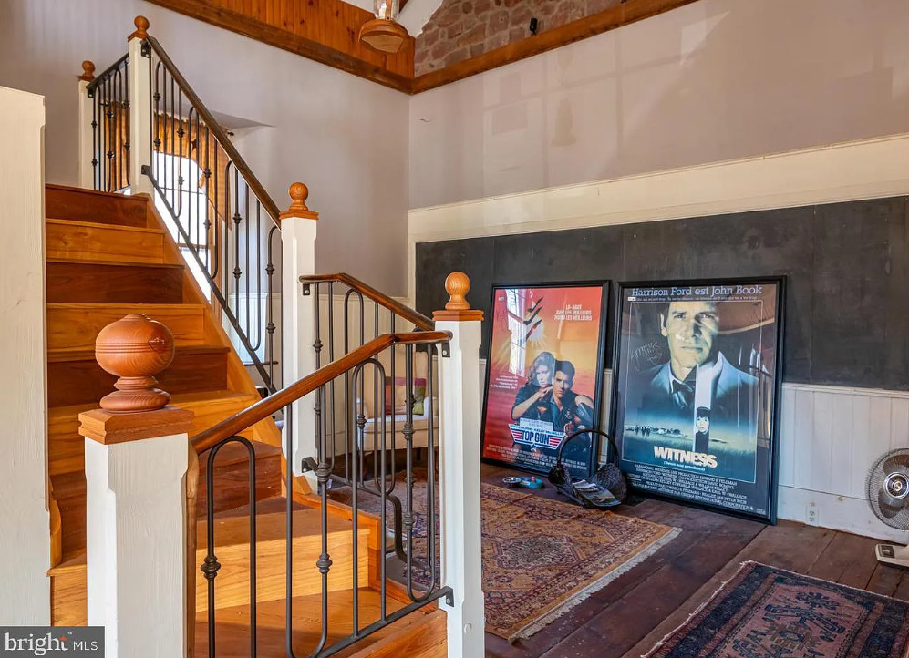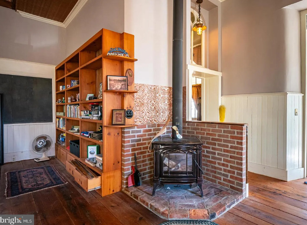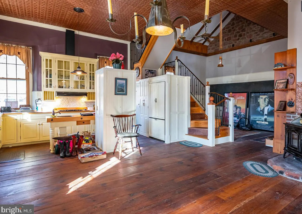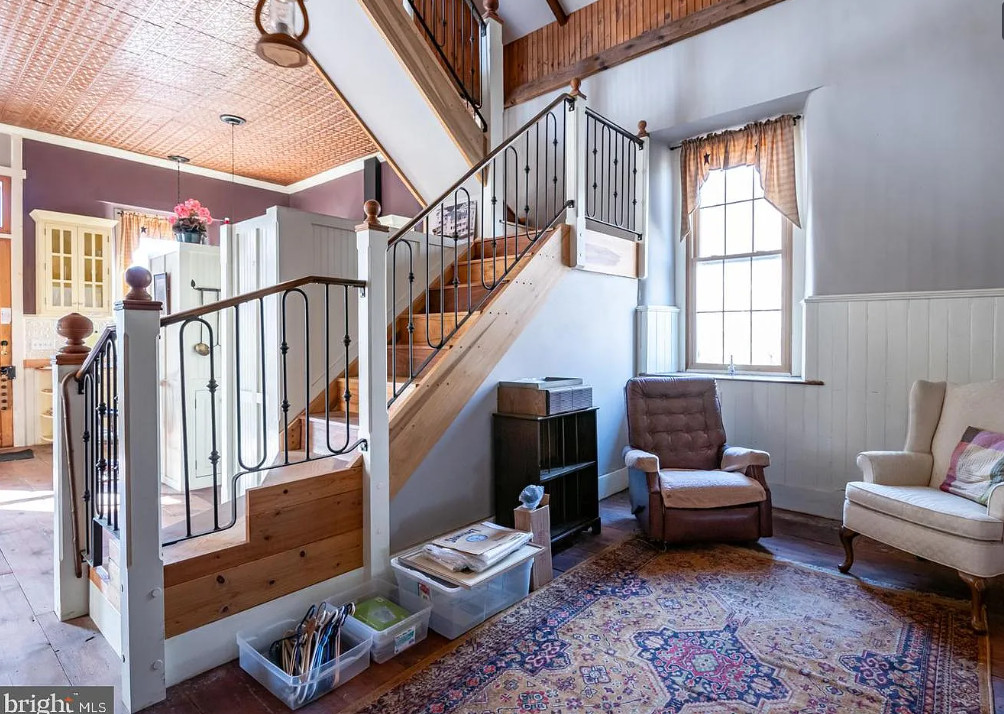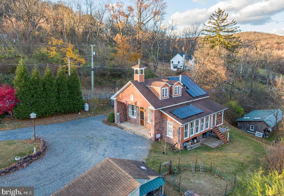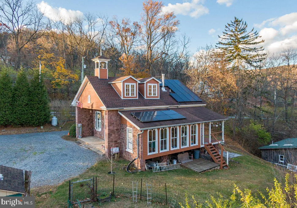 Completely Remodeled Schoolhouse on 1.45 Acres! Step into timeless charm with this beautifully renovated stone home, offering wide-plank hardwood floors and soaring ceilings throughout. The spacious living room is a true showstopper, featuring a cathedral ceiling with exposed wood beams, a cozy wood stove, and elegant wainscoting—perfect for gatherings and relaxation. The farmhouse-style kitchen is a chef’s dream, boasting a stunning tin ceiling, custom refrigerator, glass-front upper cabinets, and abundant natural light. A generous pantry provides ample storage, and the inviting breakfast nook is ideal for family meals. Also there is an island, 2nd sink, range and microwave. The main floor full bath offers a tin ceiling and corner shower. Upstairs, a graceful staircase leads to a bright and airy upper level with hardwood flooring, fireplace and plenty of space. The sunroom provides additional living space and could be a 2nd bedroom and has arched windows. Outside, enjoy multiple outbuildings, a carport, and a large deck designed for outdoor entertaining. Unique architectural details like arched and stained-glass windows add character, while owned solar panels offer energy efficiency. The additional lot (.80 acres) is buildable. This one-of-a-kind cottage blends historic charm with modern convenience—ready for its new owners to make it home!