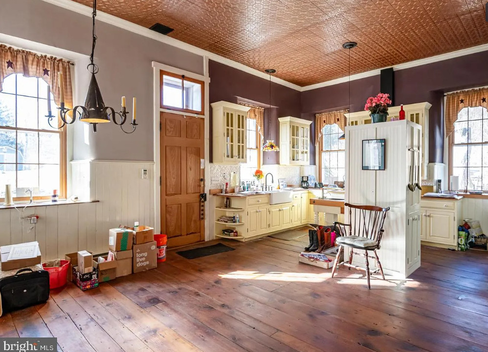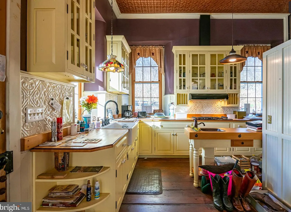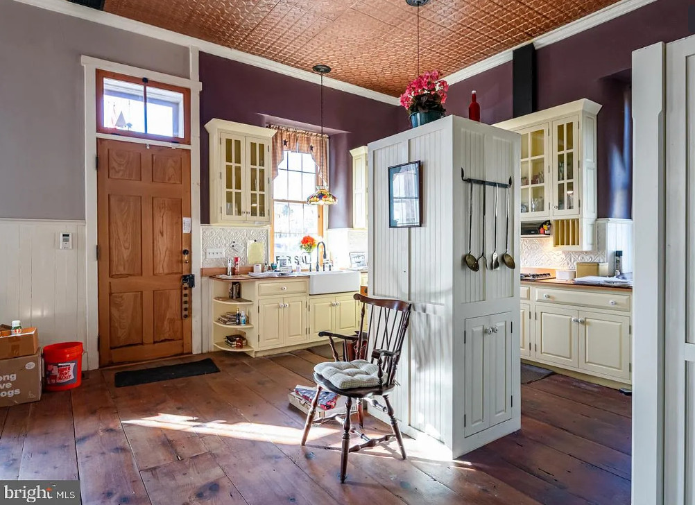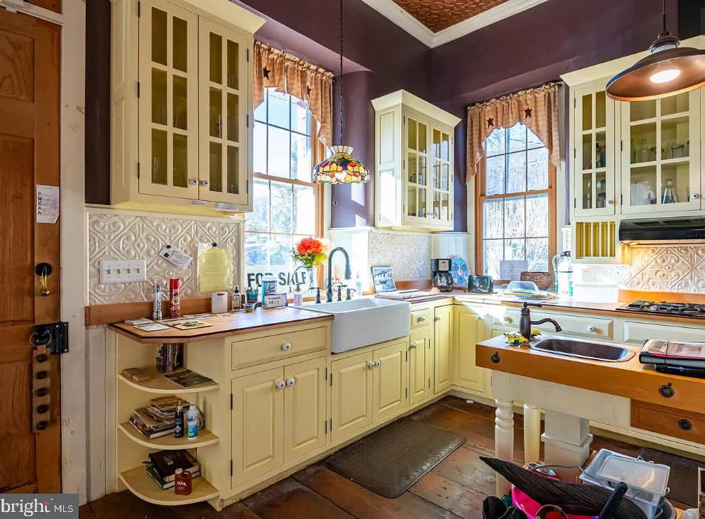 How about this schoolhouse transformation! They did a nice job. I like the yellow in the kitchen! The school was built in 1890. It is located on 1.45 acres in Reinholds, Pennsylvania. The house features a front porch, a screened in back porch, wood floors, old chalk boards, wainscoting, pressed tin ceiling, built-in bookshelves and a breakfast nook. There are a few outbuildings on the property. One bedroom, one bathroom and 1,543 square feet. $349,500