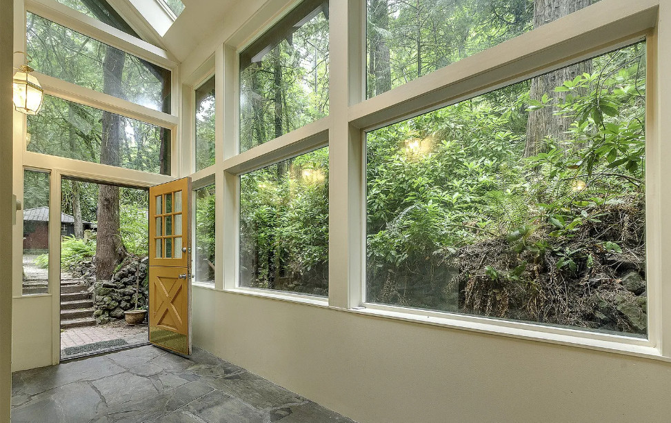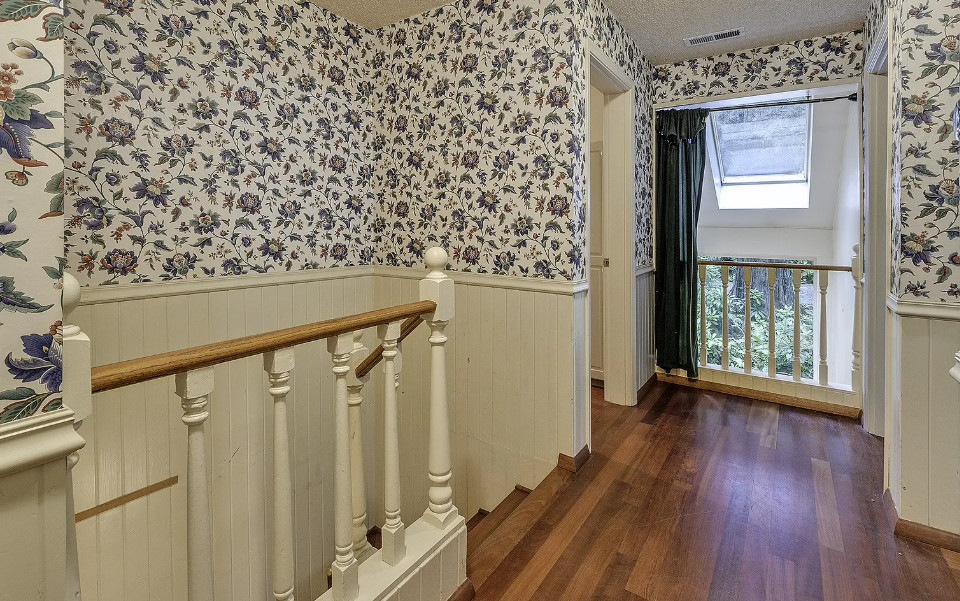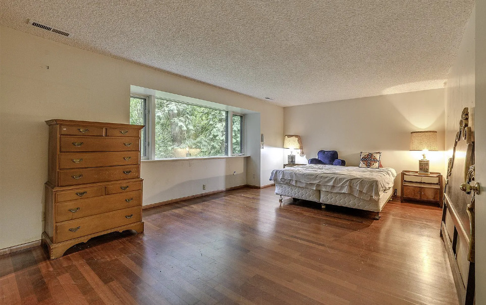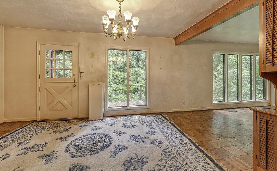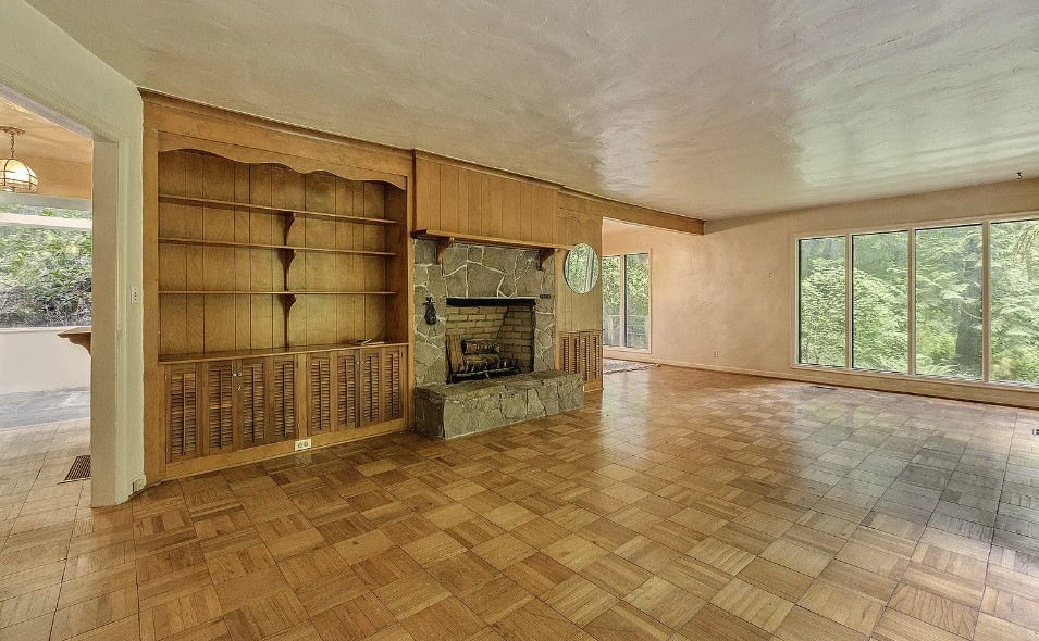 Take a look at that setting! Feel like you might see Bigfoot walking around in there. There is a guesthouse on the property. The house was built in 1940. It is located on 9.39 acres in Portland, Oregon. The house features a great entryway with soaring ceilings and a wall of windows, parquet flooring, built-in bookshelves, stone fireplace and a spacious kitchen. There is a large basement. The guesthouse has two bedrooms and one bathroom. Four bedrooms, two bathrooms and 2,958 square feet. $899,000