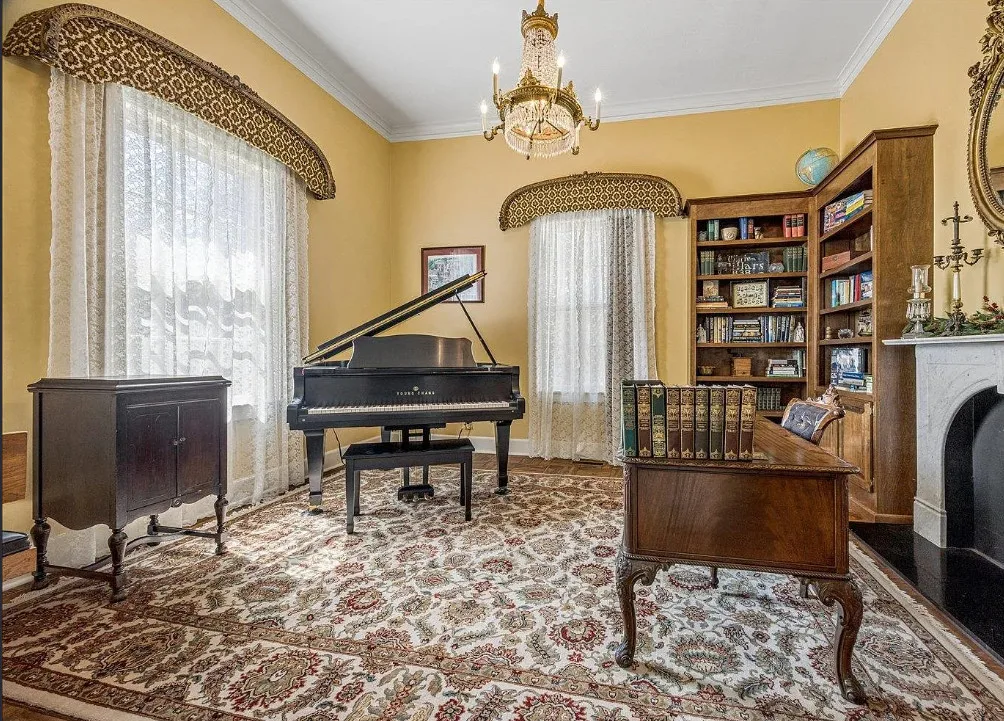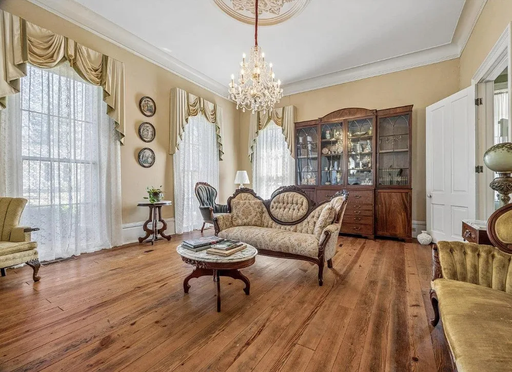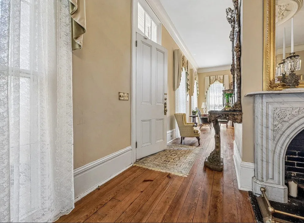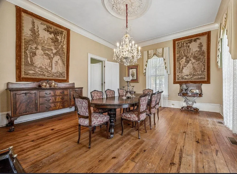 This is a pretty house! There are nice details inside! The home is known as “White Pillars”. It was built in 1838. White Pillars is located on .34 acre in Holly Springs, Mississippi. The house features double front porches, wood floors, ceiling medallions, wide baseboards, crown moulding, crystal chandelier, chair rails, french doors, updated kitchen and updated bathrooms. There is a screened in back porch and a large back patio. Four bedrooms, three bathrooms and 4,000 square feet. $375,000