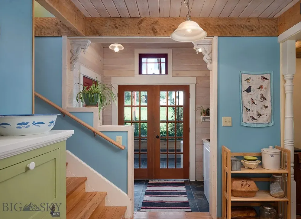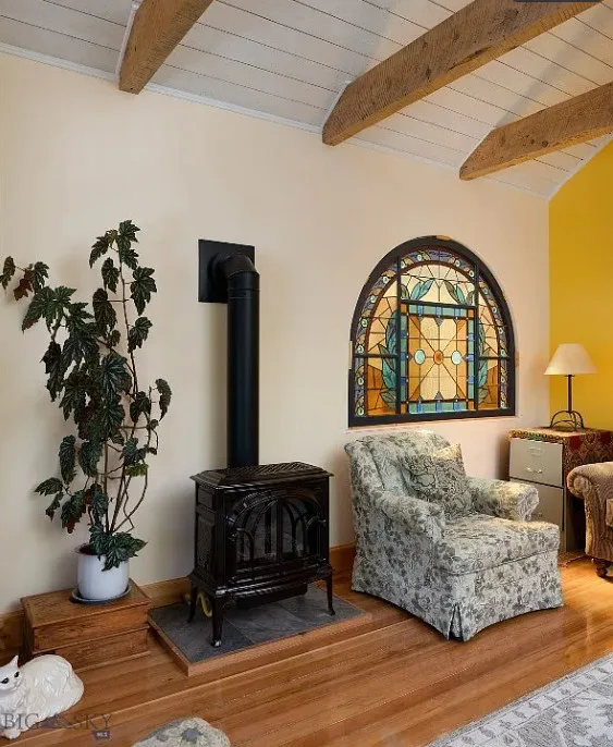Love this interior! That glass sunroom and the kitchen sink are perfect! This is known as the Samuel Russell House. It was built in 1900. The house is located in Virginia City, Montana. The house features a covered front porch, vaulted ceilings, exposed beams, wood floors, great kitchen sink, baseboards, french doors, glass sunroom and bead board. There is a detached storage building on the property. Two bedrooms, two bathrooms and 1,455 square feet. $445,000