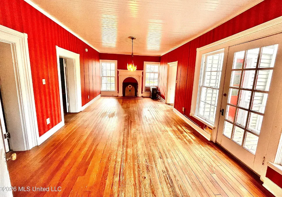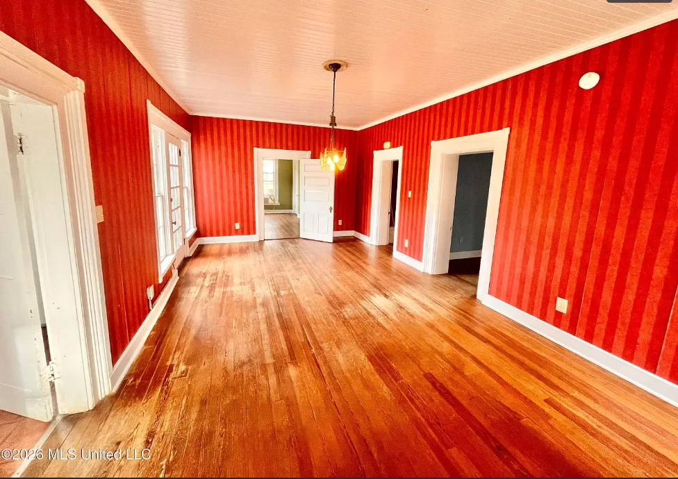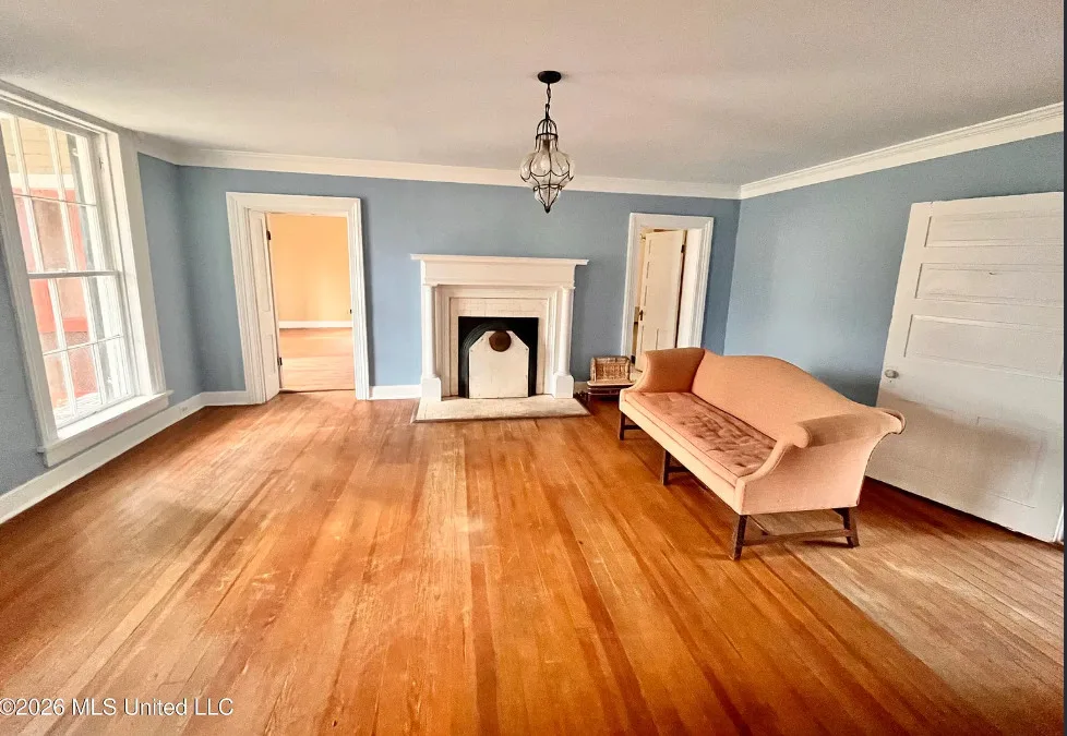 This house has a lot of pretty details! There is a lot of potential in this home. The house is known as “Alicia”. It was built in 1833. It is located on .49 acre in Holly Springs, Mississippi. The house features wrought iron fencing, brick walkway, a covered front porch, wood floors, picture rails, baseboards, crown moulding, french doors and built-ins. Two bedrooms, two bathrooms and 2,660 square feet. $175,000