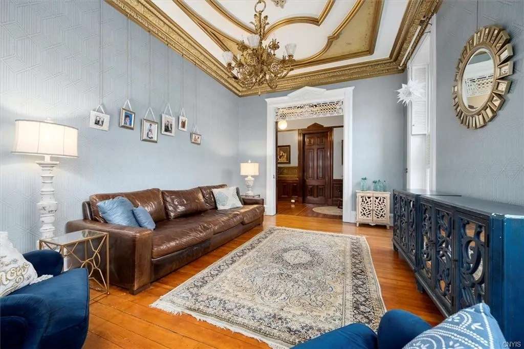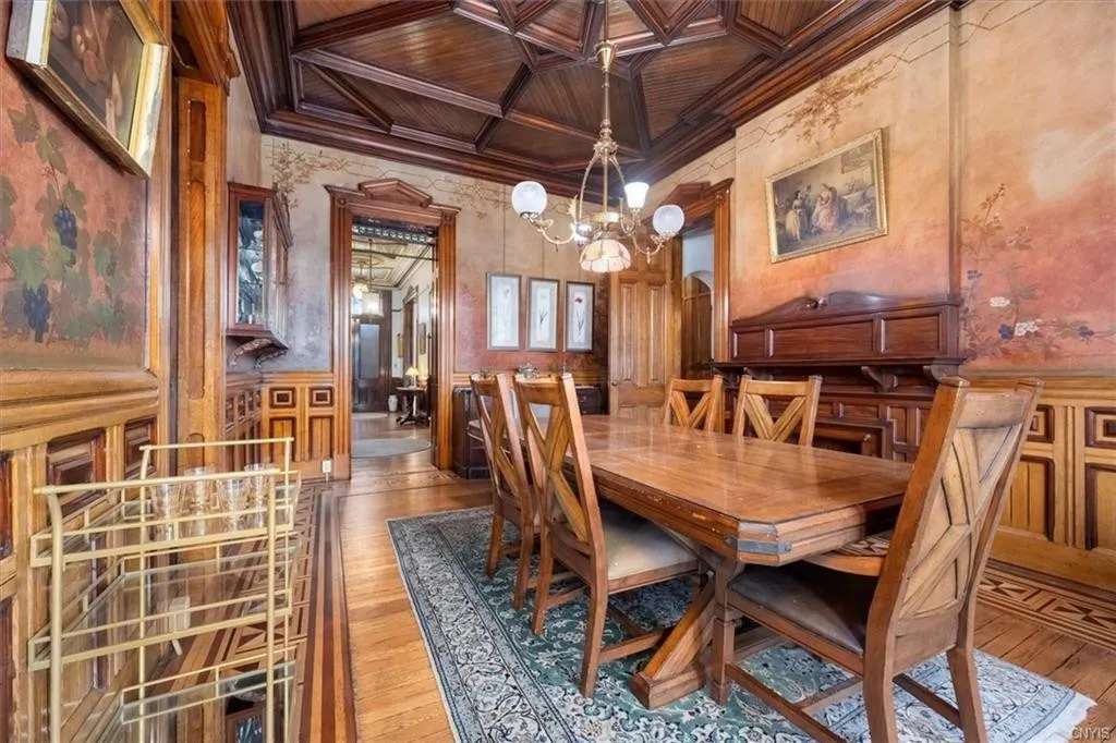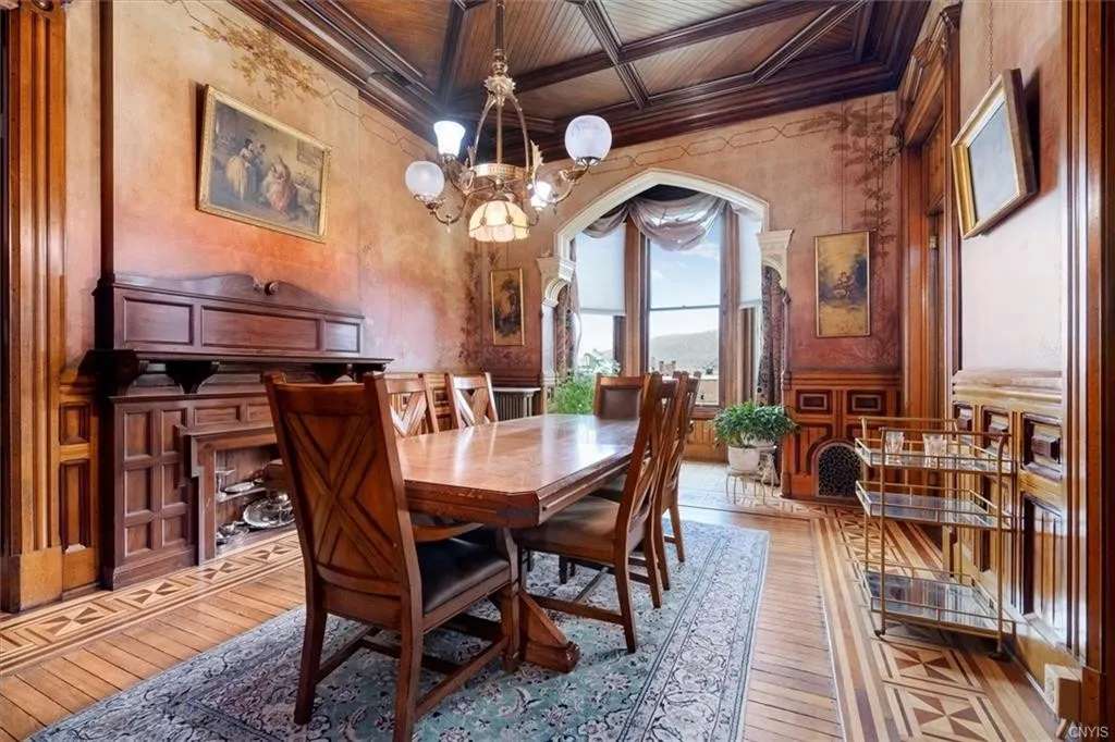 Grand Interior Spaces: The main floor boasts a spacious kitchen with an eat-in island, a formal dining room illuminated by an elegant chandelier, and multiple common areas adorned with intricate embellishments, reflecting the opulence of the late 19th century.