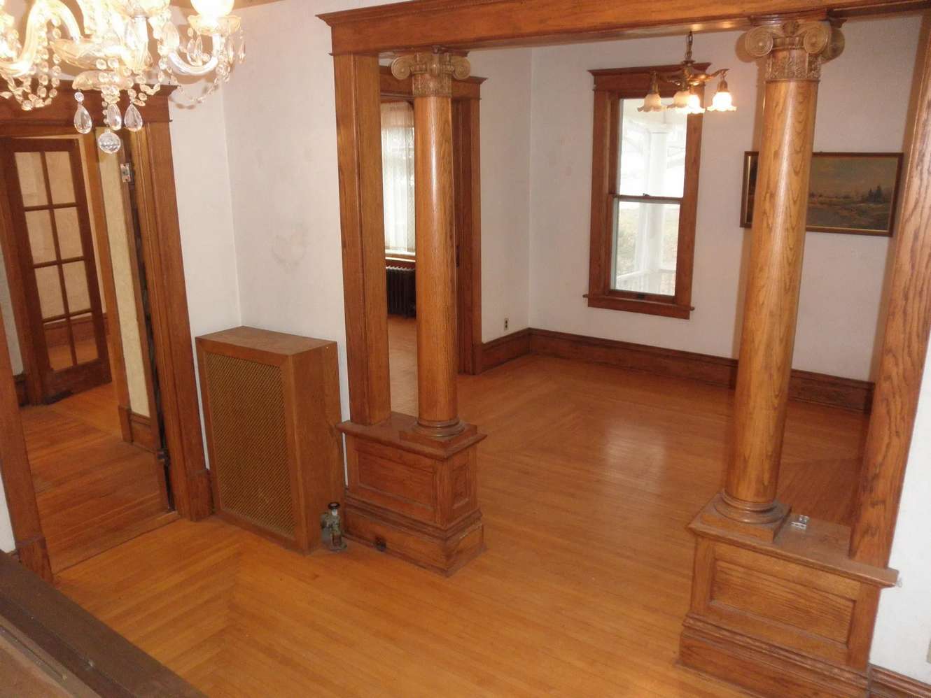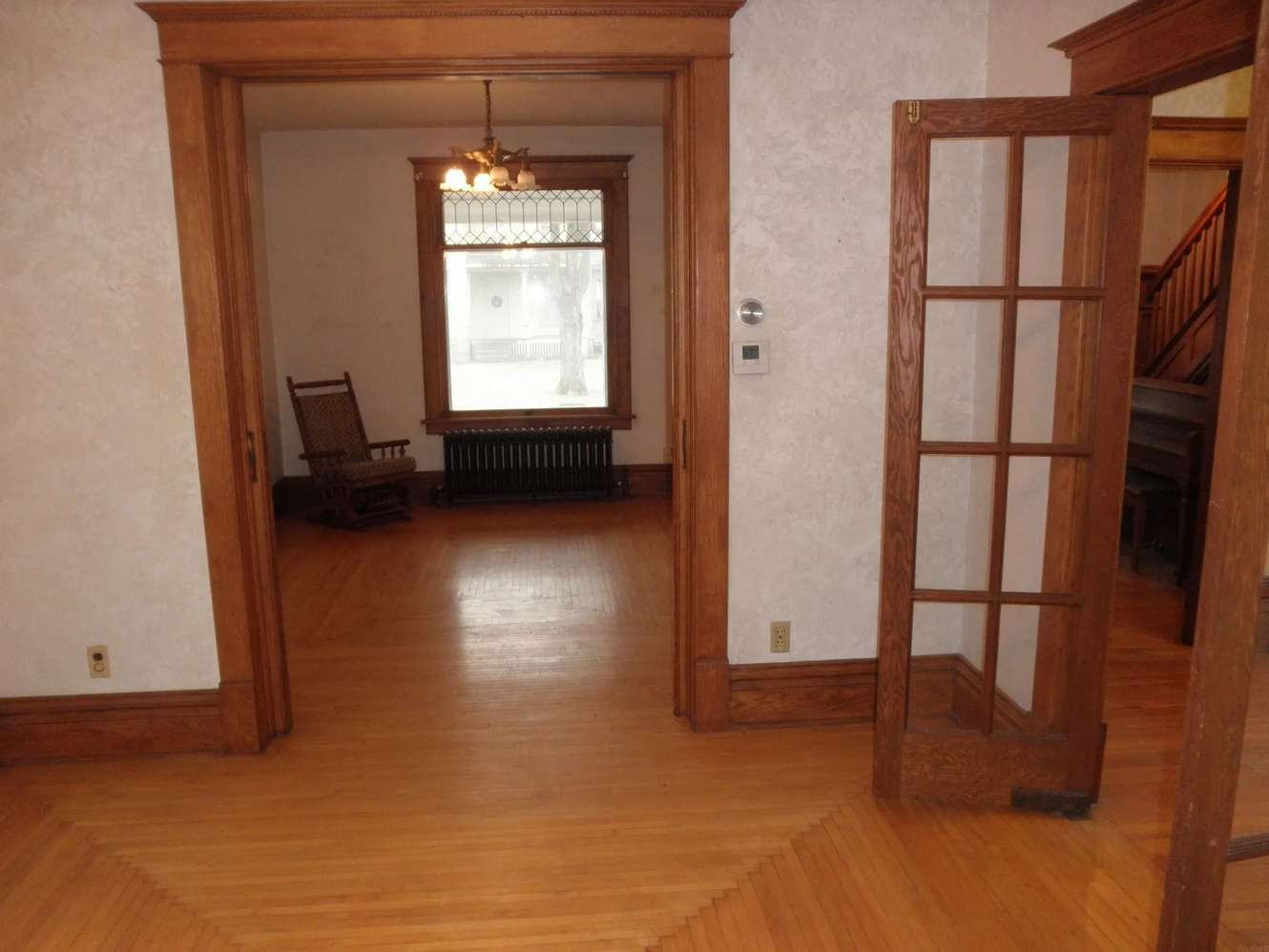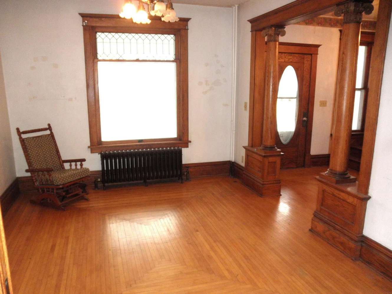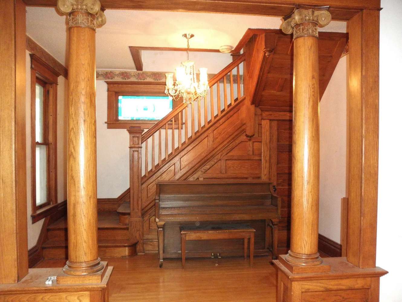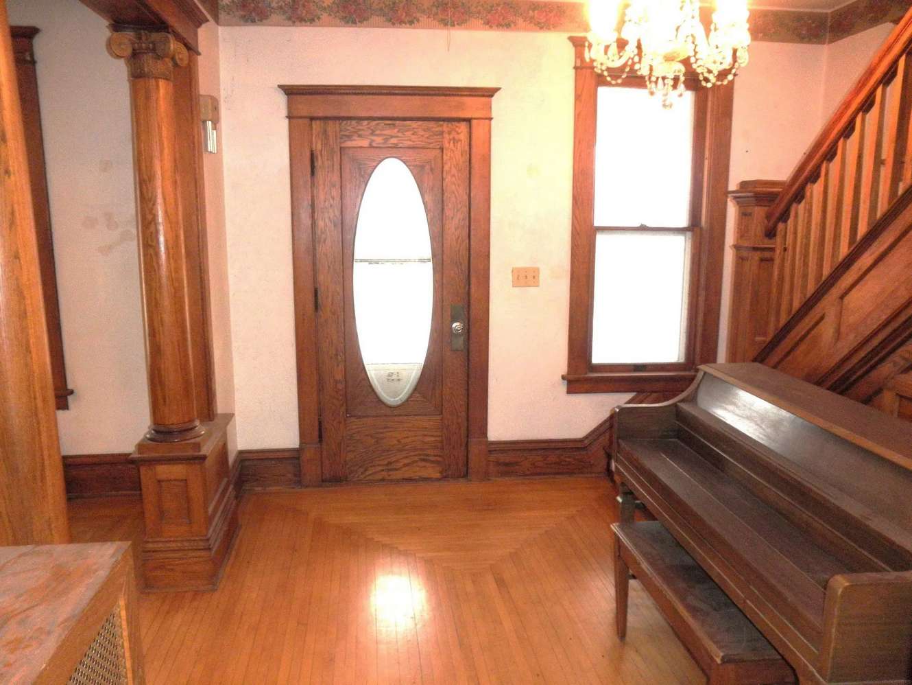 Interior Details: Upon entry, you're greeted by a beautiful natural wood open staircase, unique hardwood floors, and original colonnades separating the foyer from the formal living room. The home retains its natural wide baseboard trim and sliding wood doors between the living and dining rooms, showcasing the craftsmanship of the era.