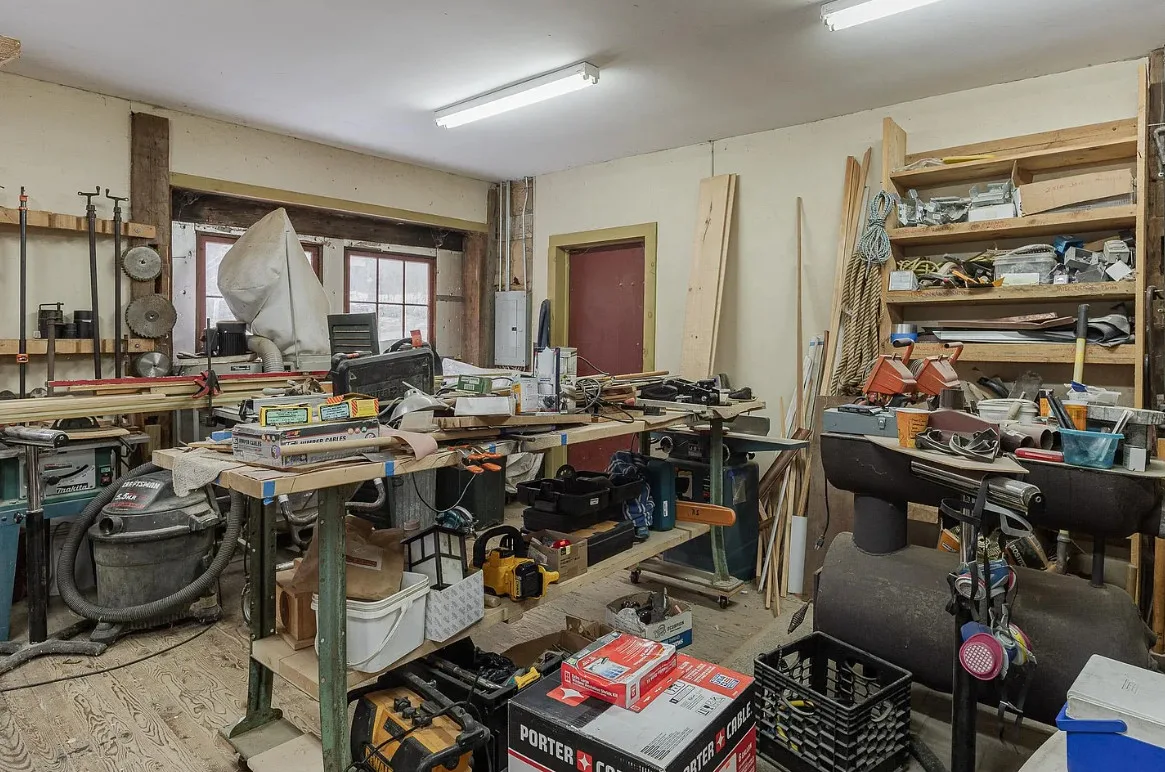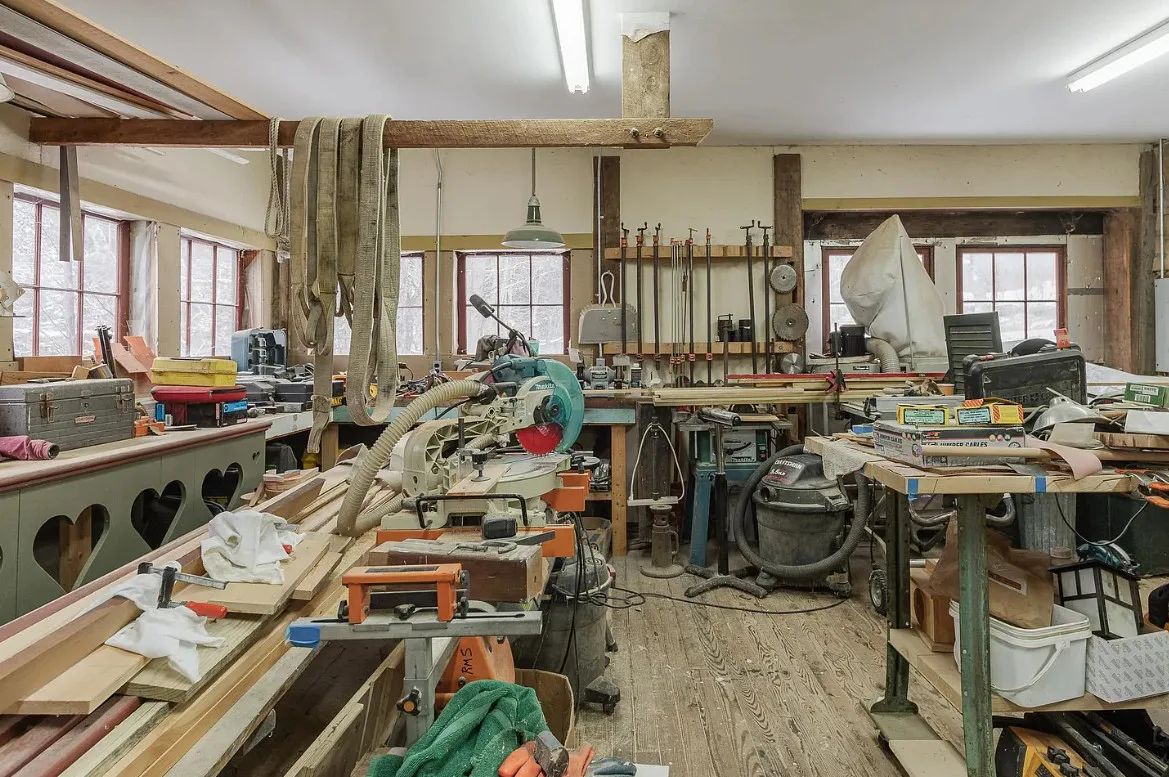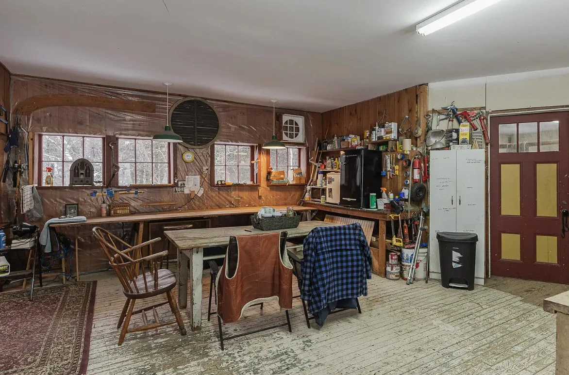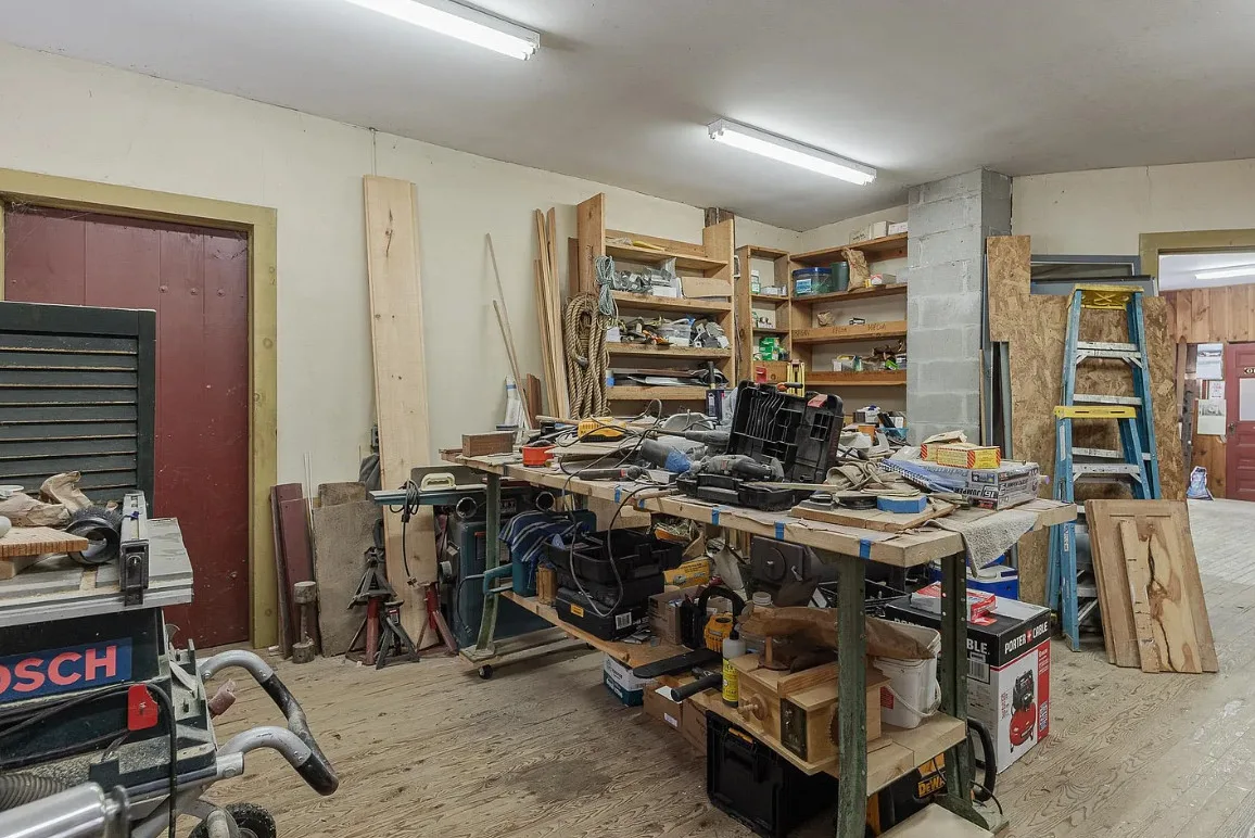 Versatile Interior:The main room features windows overlooking the river, providing ample natural light and a tranquil atmosphere. An additional large room is currently set up as a woodshop, complete with several workspaces and a dust collector, which can remain with the property.