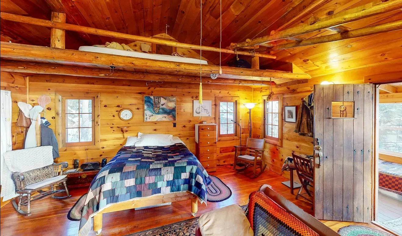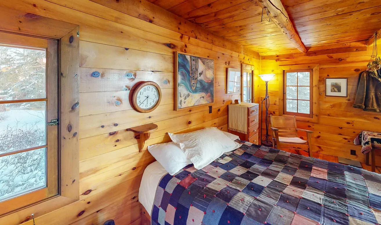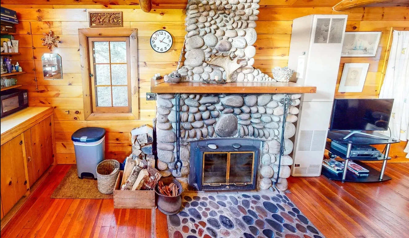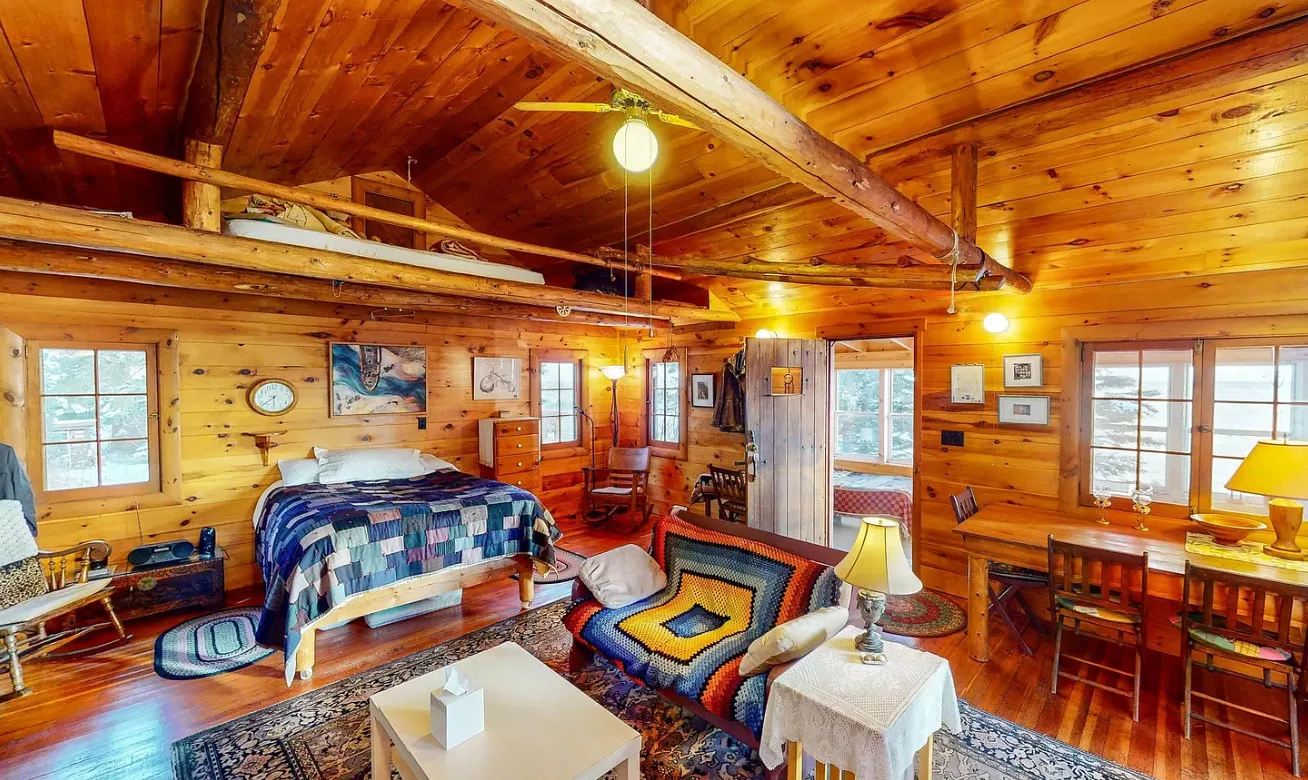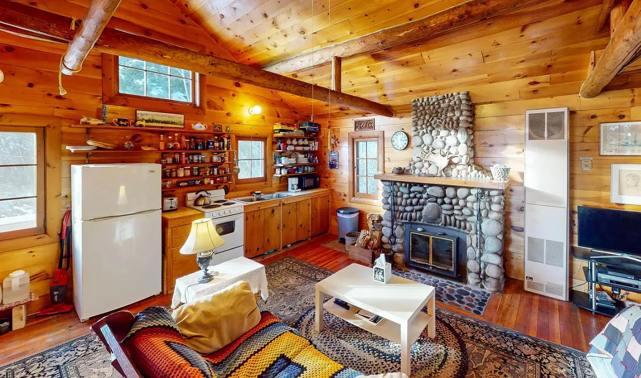Cozy Interior:The cabin features a stone fireplace, warm wood floors, and a compact loft for additional sleeping space.
