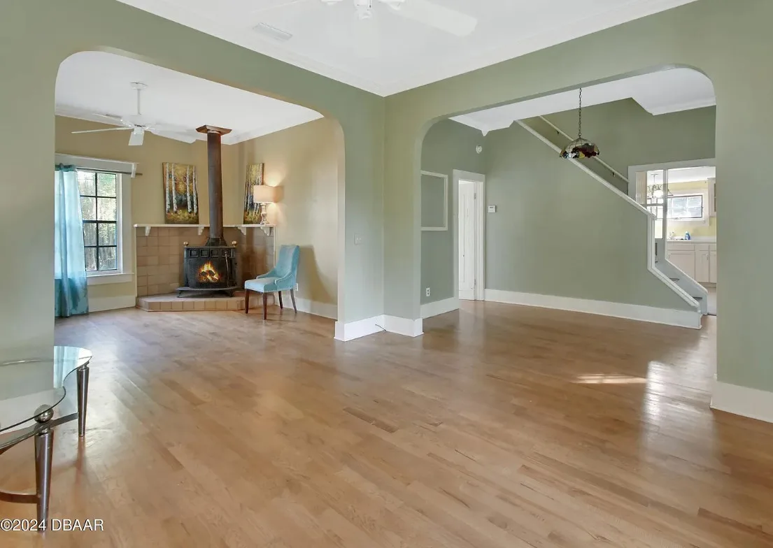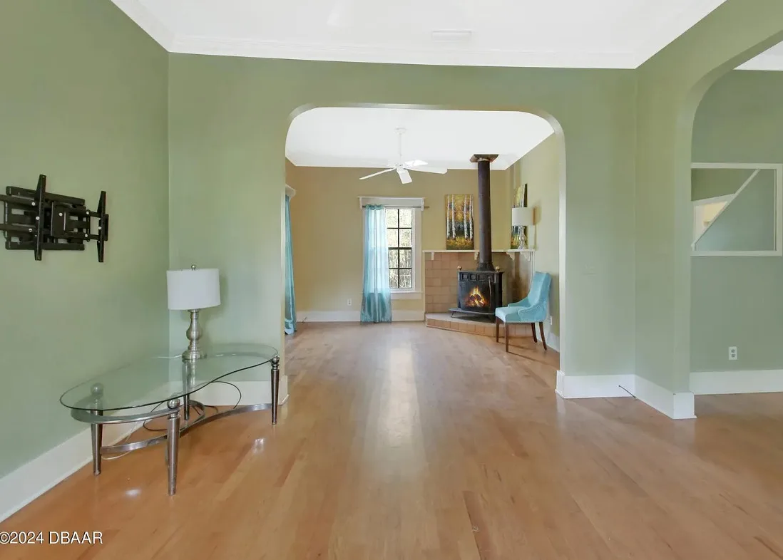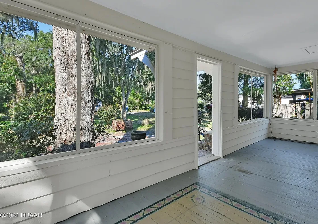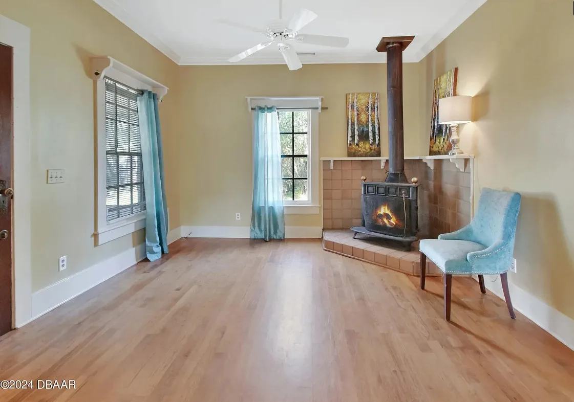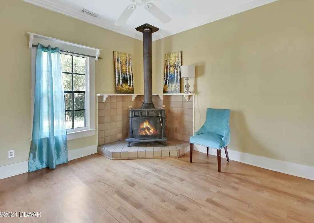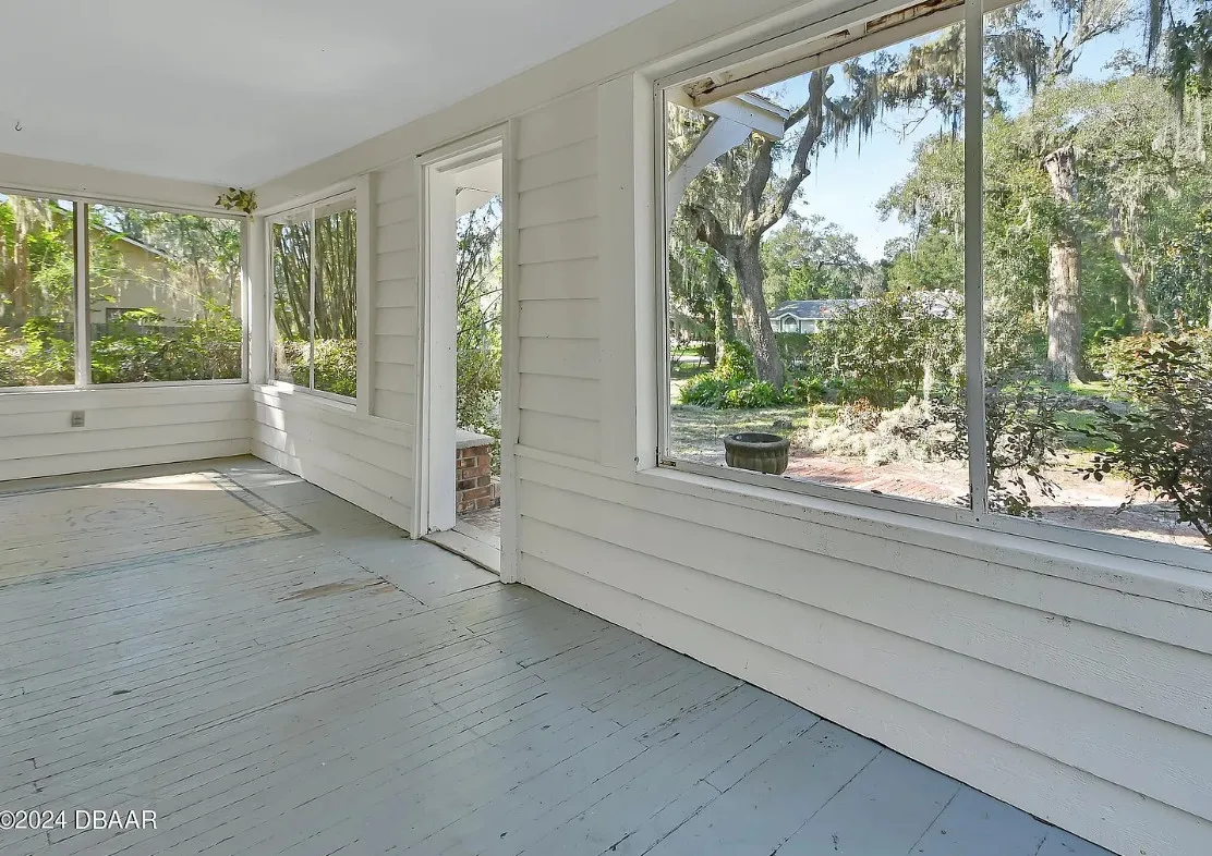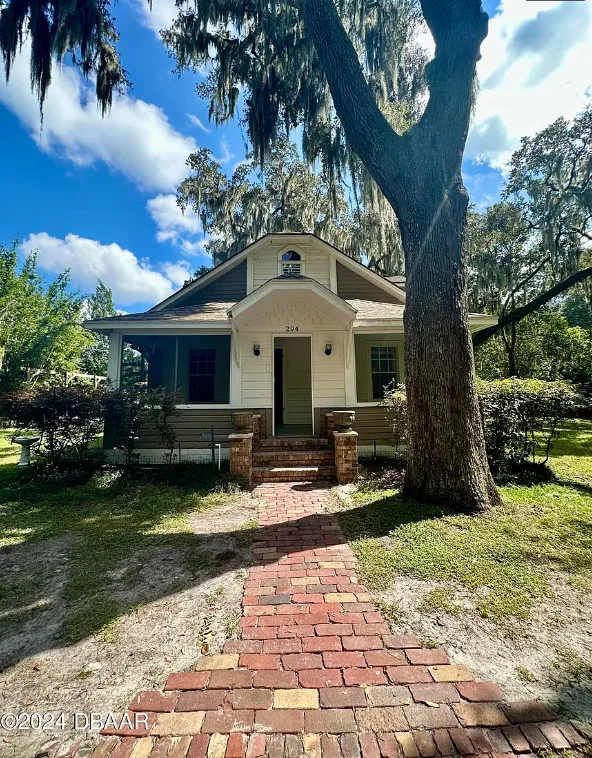 This is a pretty house in Florida! Love the big old trees! The house was built in 1924. It is located on .58 acre in Orange City, Florida. The house features a covered front porch, brick walkway, wood floors, a lot of natural light, wide baseboards and a wood stove. There is a large fenced in backyard. The property has a detached workshop with electric and water. Two bedrooms, three bathrooms and 1,324 square feet. $289,900