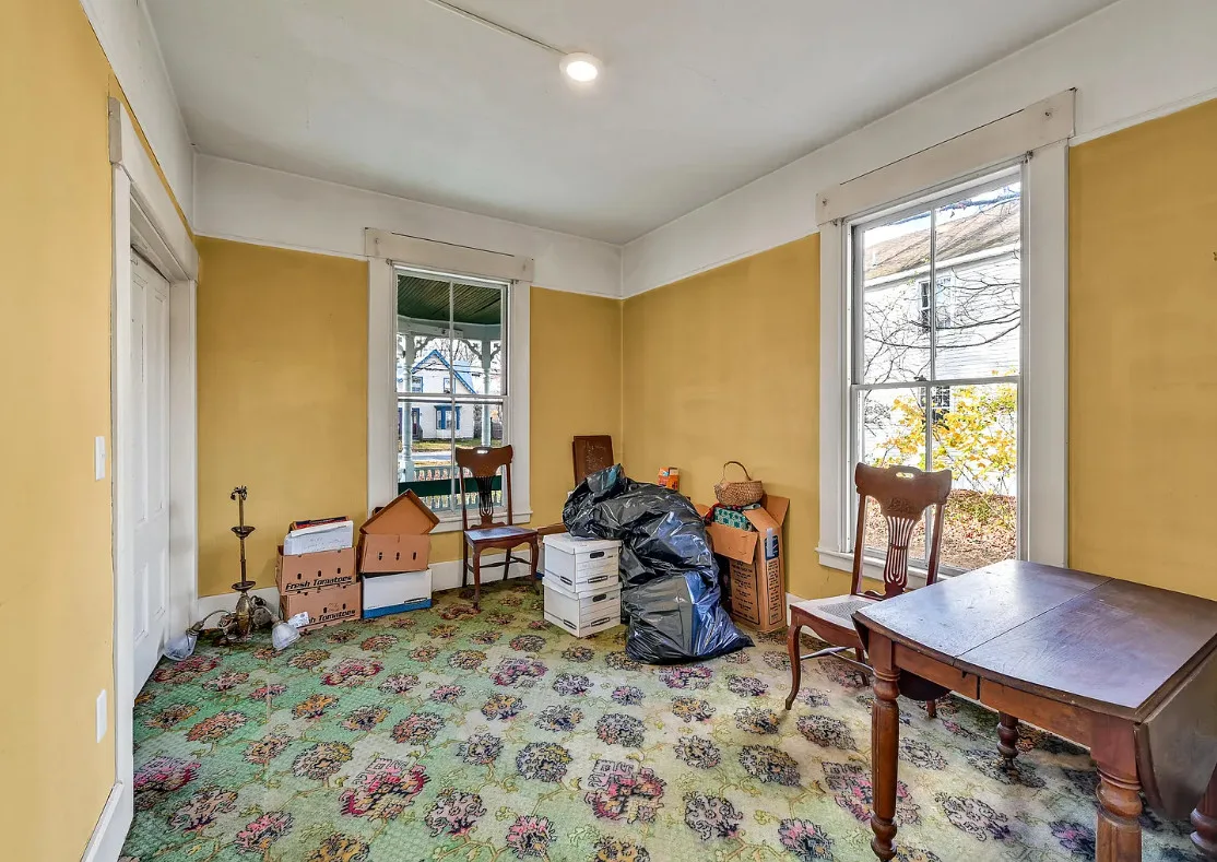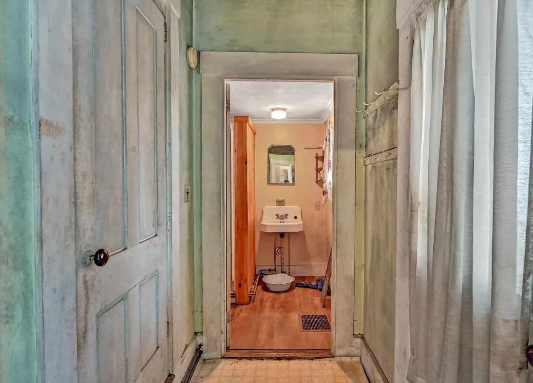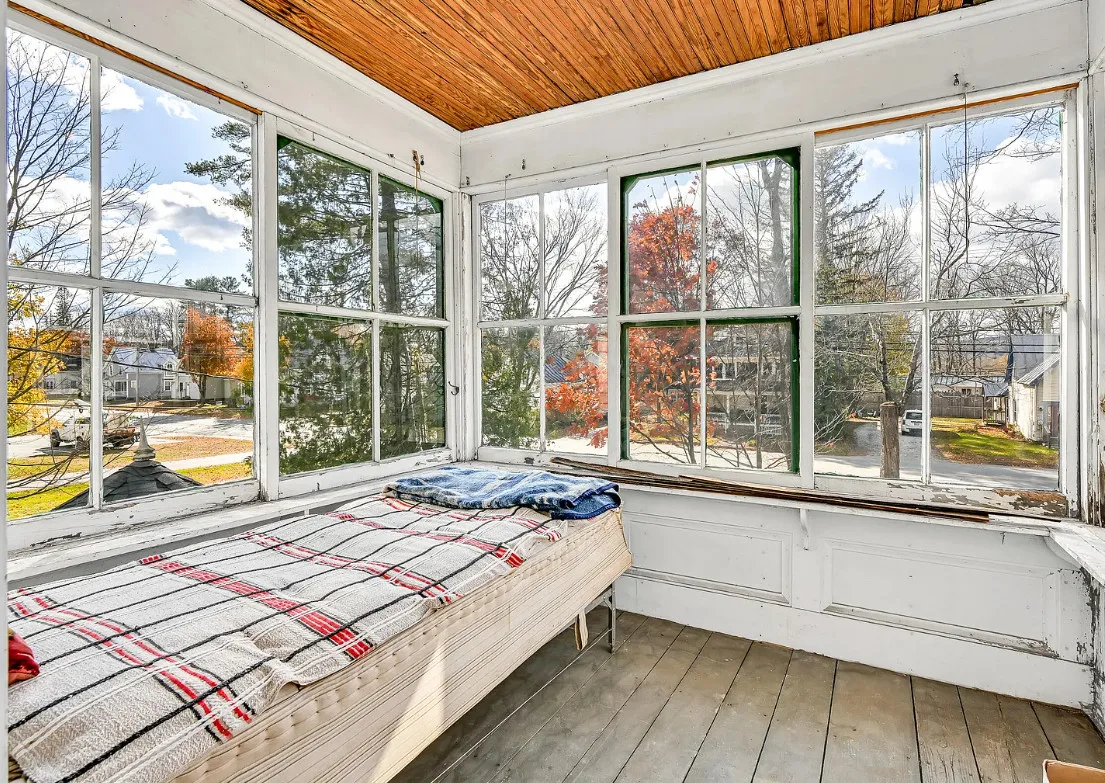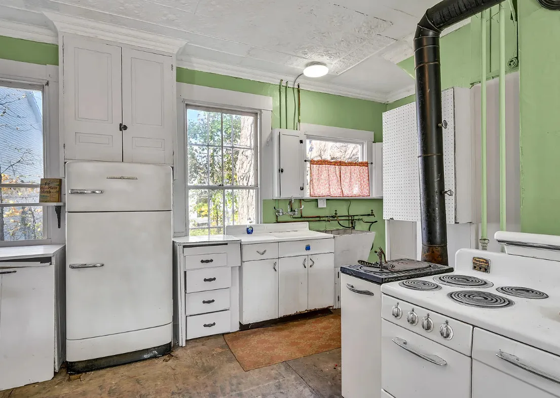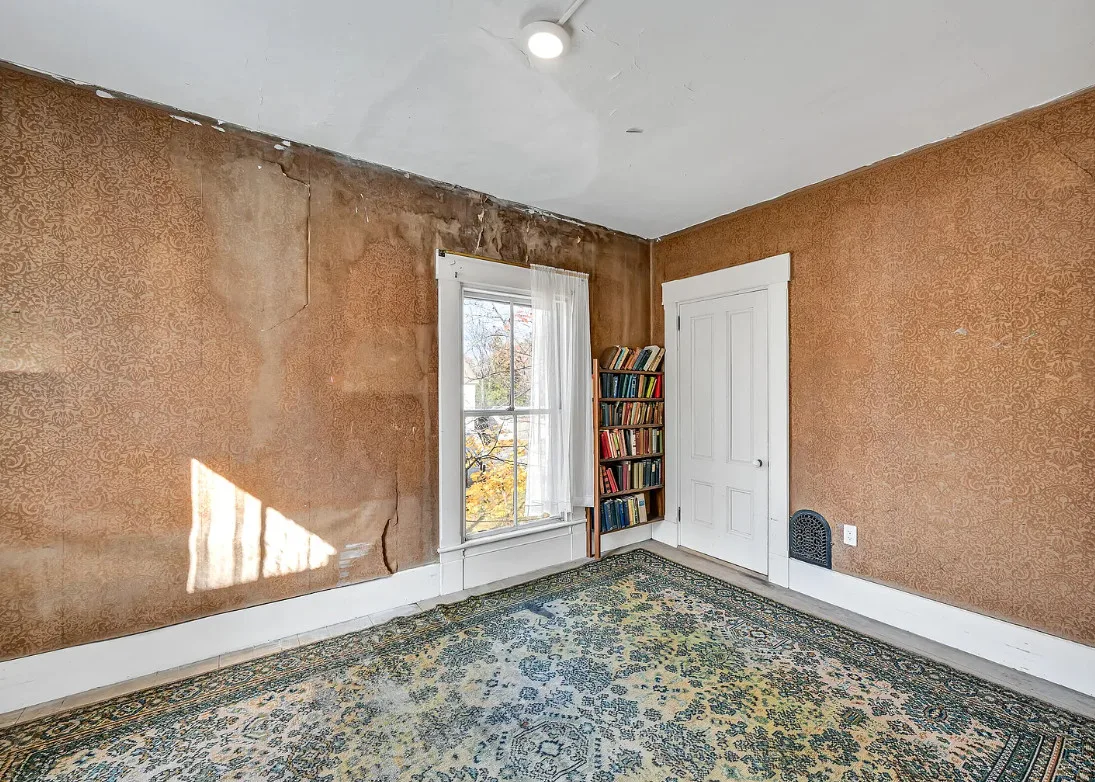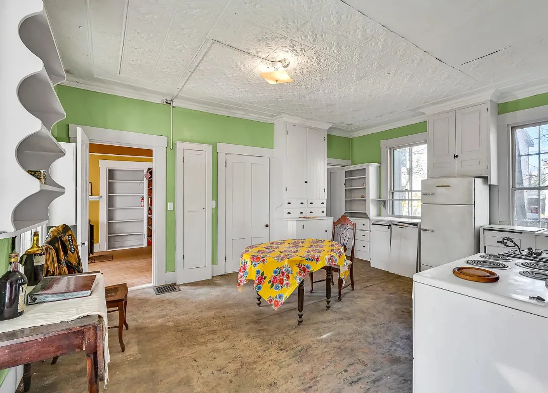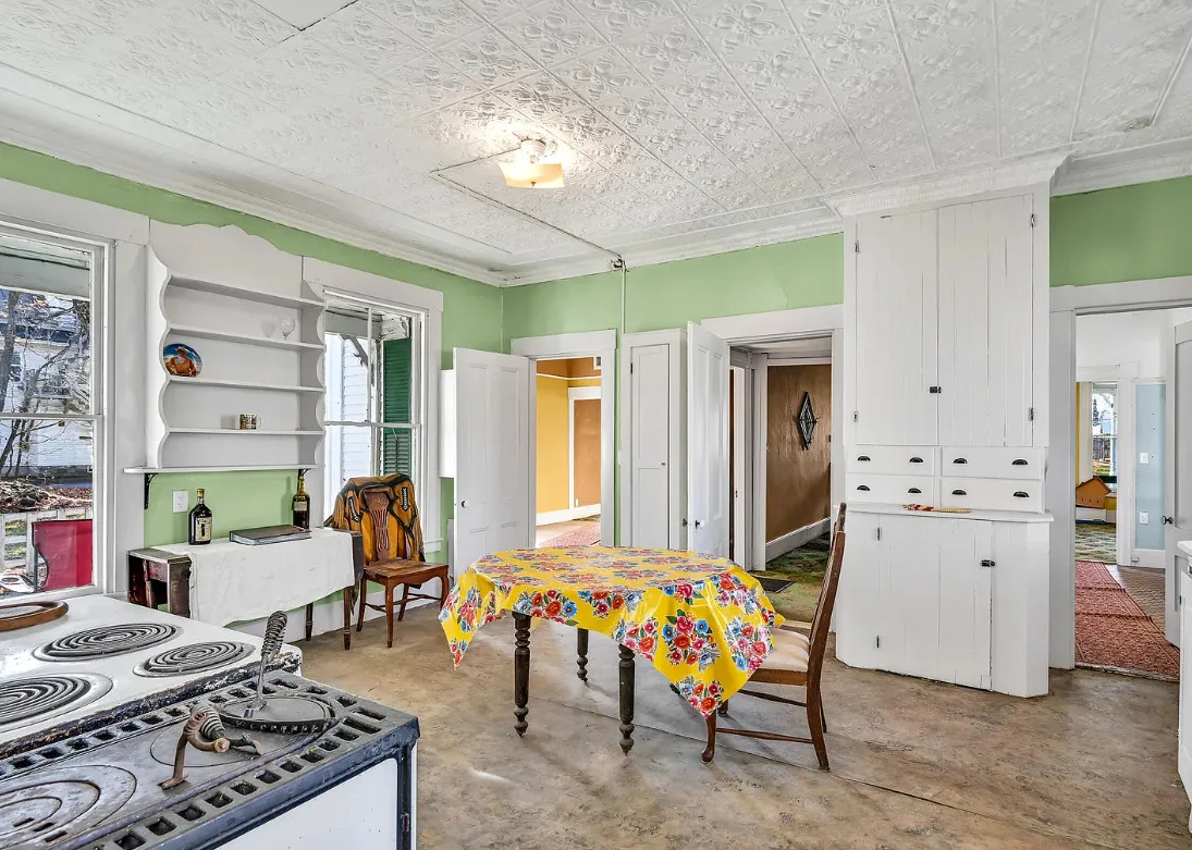 I want every book in that house! I love the kitchen stove! The house was built in 1890. It is located on .70 acre in Farmington, Maine. The house appears to have a bit of water damage on ceilings. The listing does say that roof work was done, so it could be old damage. The house features a covered front porch, upper screened in porch, wood floors, old linoleum floor cloths, pocket doors, picture rails, pressed tin ceiling, crown moulding, vintage light fixtures and wide baseboards. There is a large barn and a huge attic that brings total square footage to over 6,000 square feet. Five bedrooms, two bathrooms and 2,493 square feet. $265,000