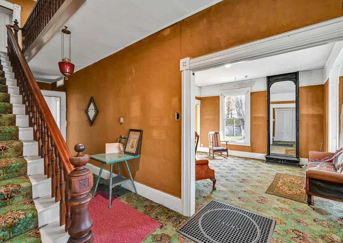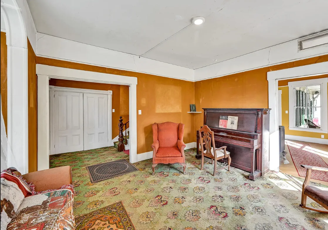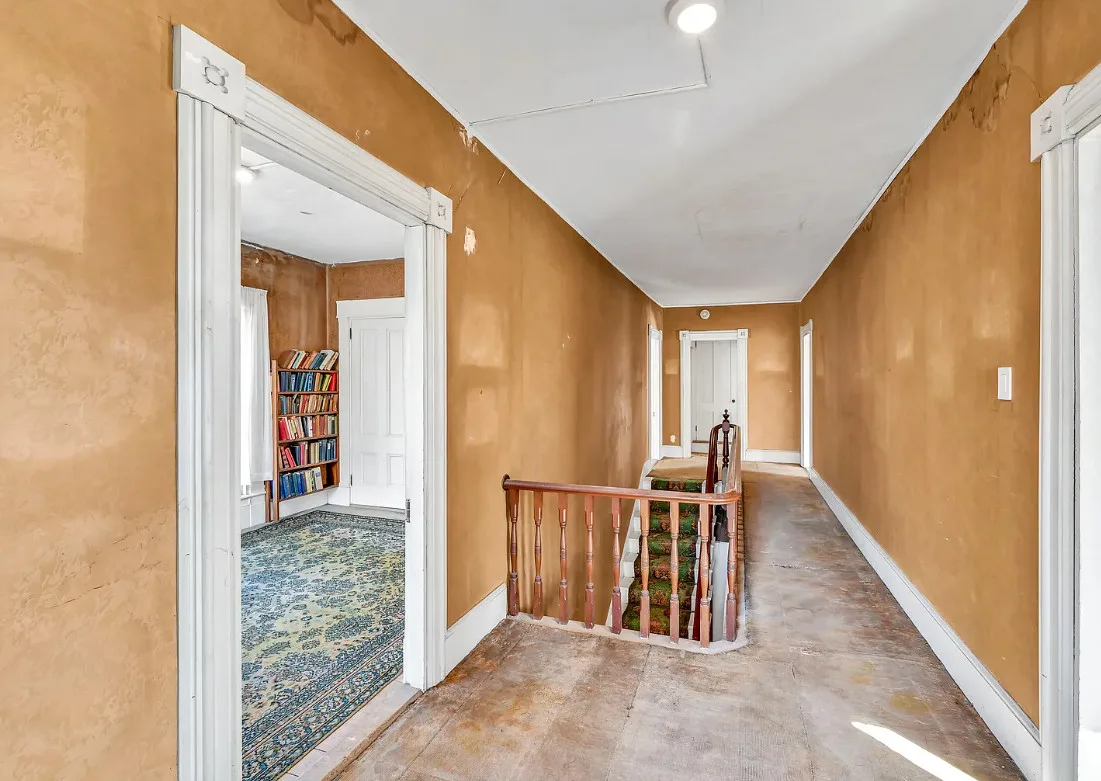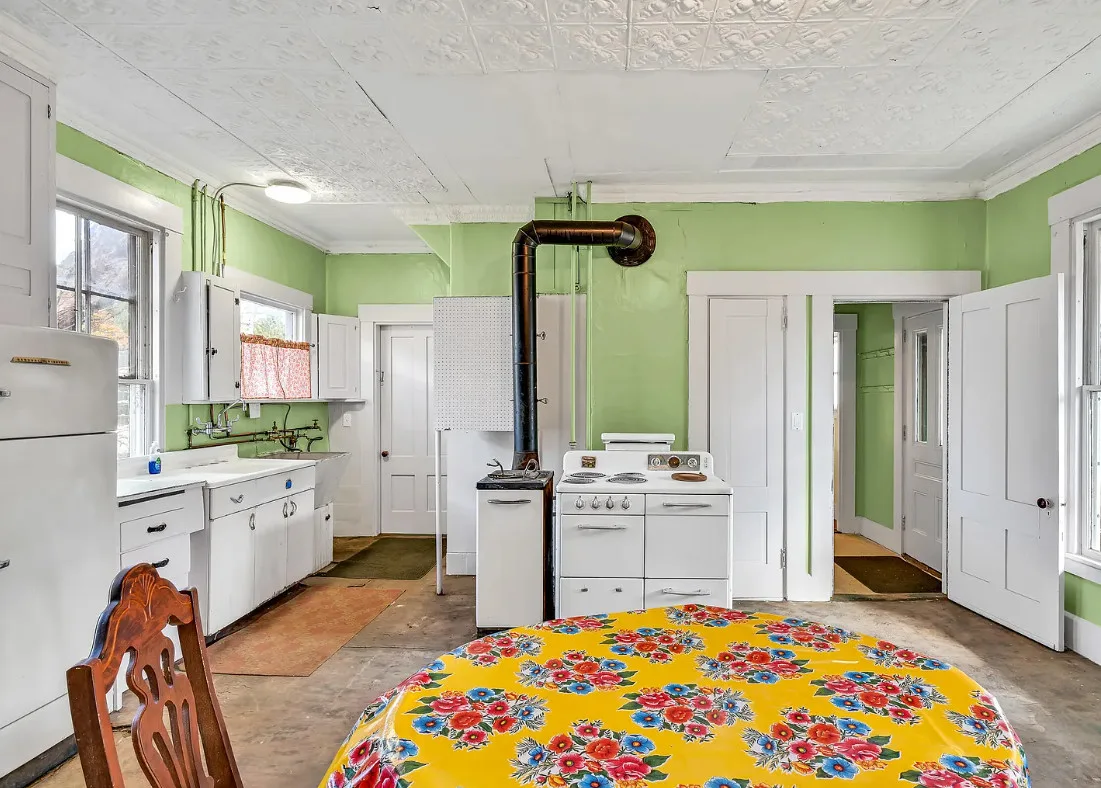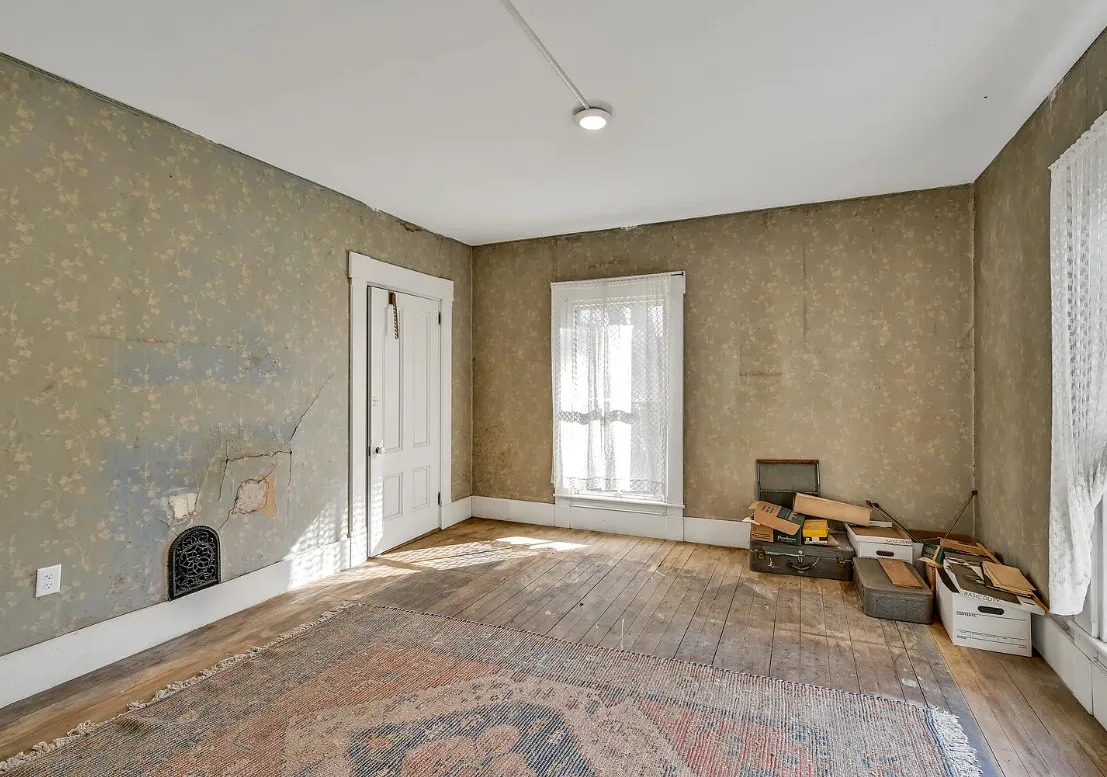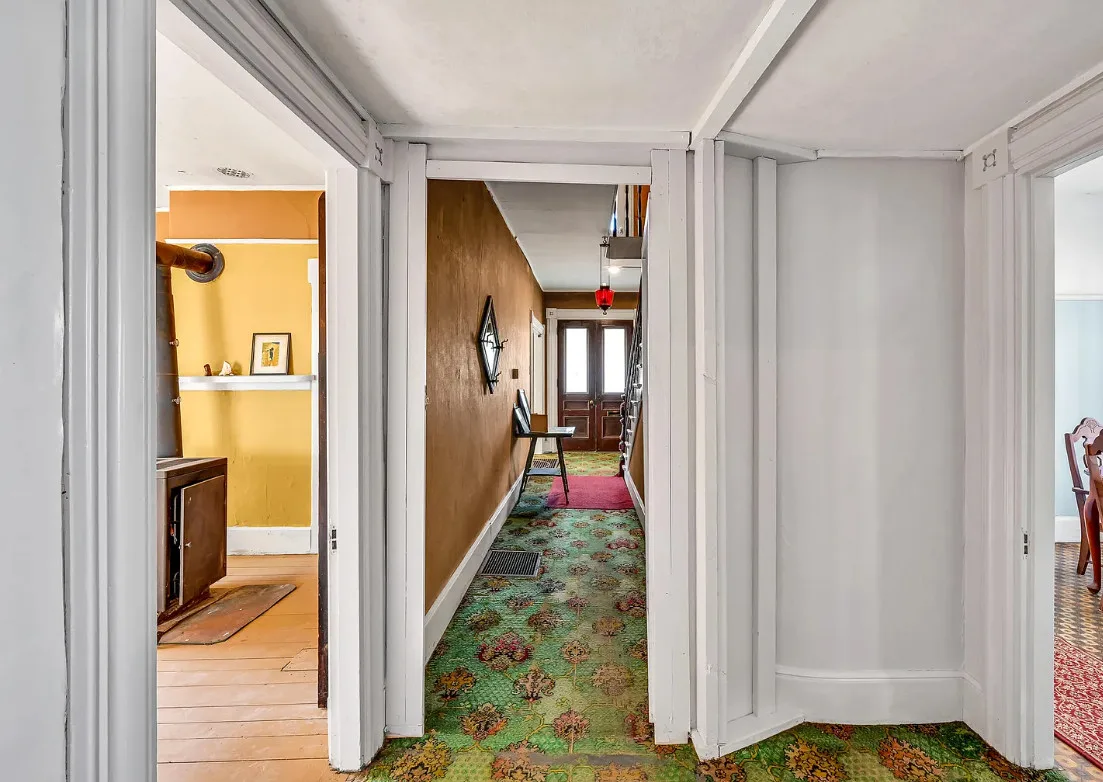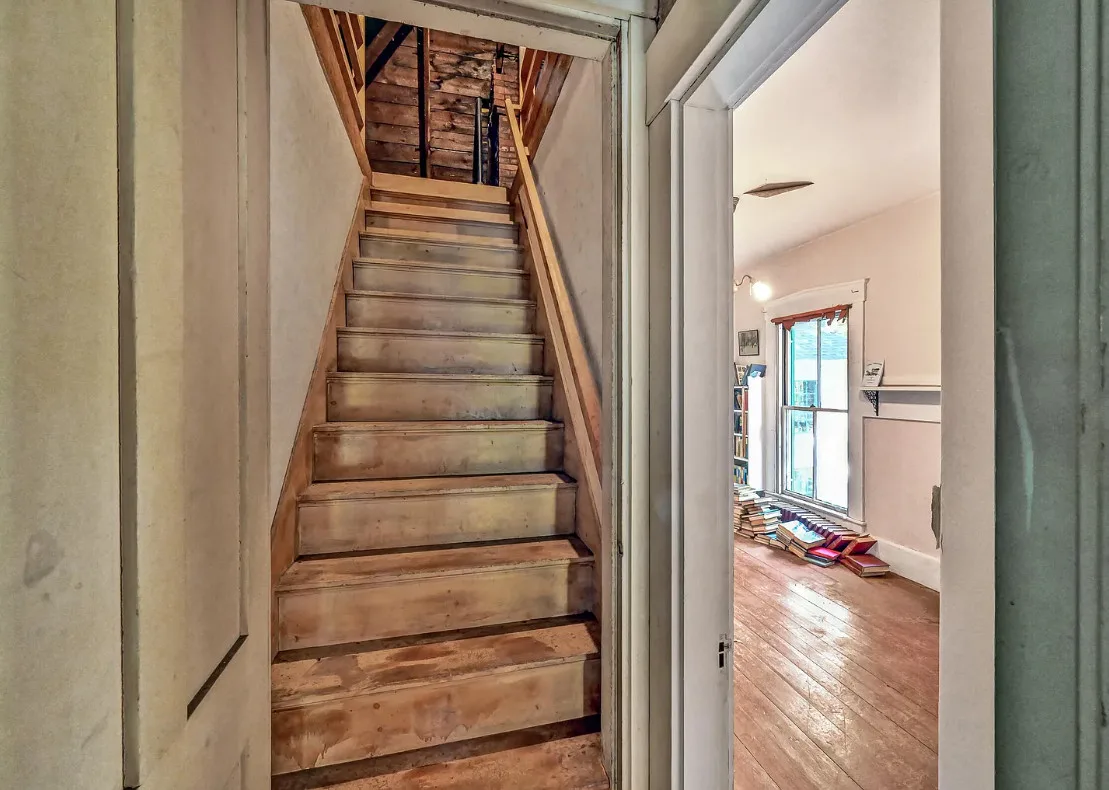 I want every book in that house! I love the kitchen stove! The house was built in 1890. It is located on .70 acre in Farmington, Maine. The house appears to have a bit of water damage on ceilings. The listing does say that roof work was done, so it could be old damage. The house features a covered front porch, upper screened in porch, wood floors, old linoleum floor cloths, pocket doors, picture rails, pressed tin ceiling, crown moulding, vintage light fixtures and wide baseboards. There is a large barn and a huge attic that brings total square footage to over 6,000 square feet. Five bedrooms, two bathrooms and 2,493 square feet. $265,000