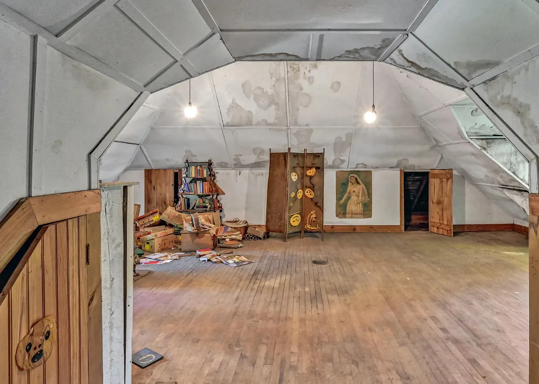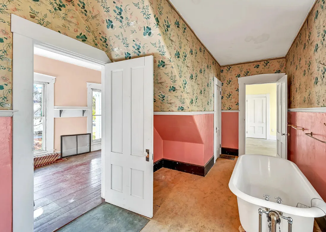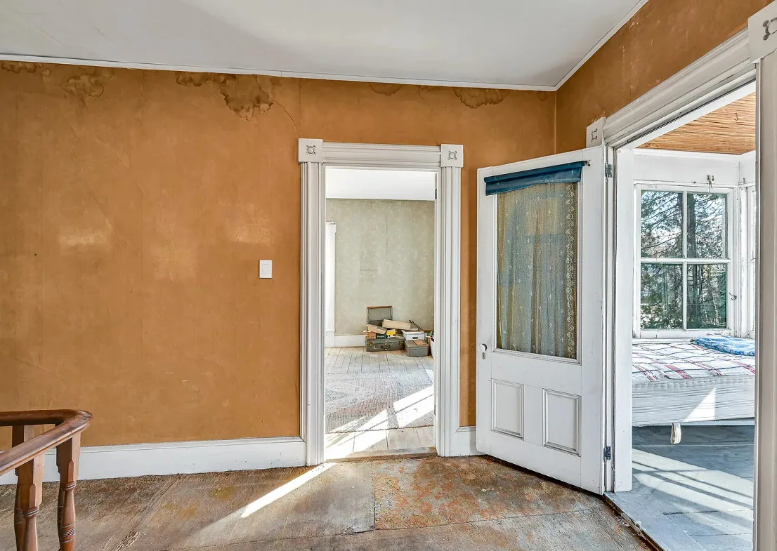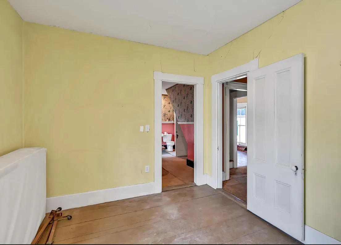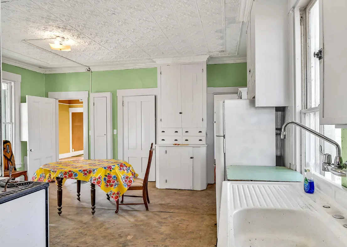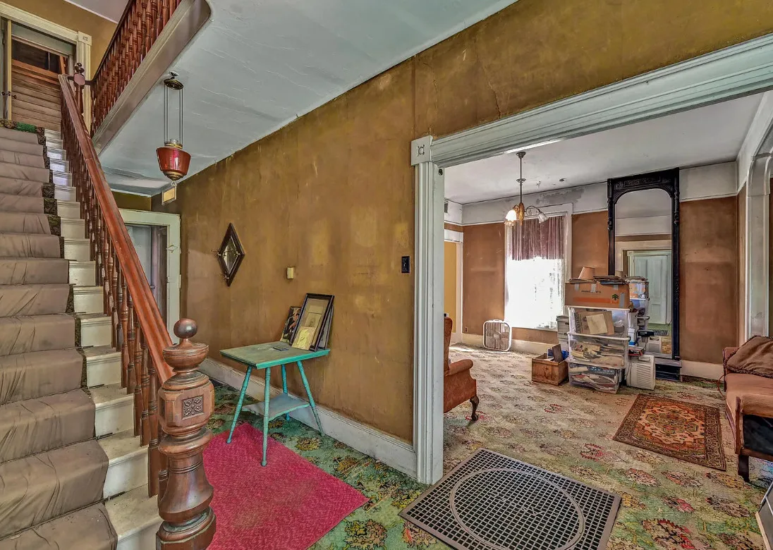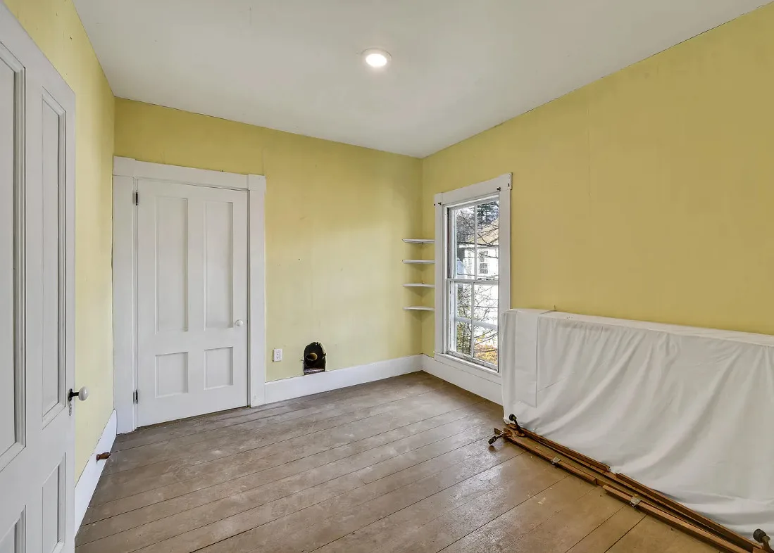 I want every book in that house! I love the kitchen stove! The house was built in 1890. It is located on .70 acre in Farmington, Maine. The house appears to have a bit of water damage on ceilings. The listing does say that roof work was done, so it could be old damage. The house features a covered front porch, upper screened in porch, wood floors, old linoleum floor cloths, pocket doors, picture rails, pressed tin ceiling, crown moulding, vintage light fixtures and wide baseboards. There is a large barn and a huge attic that brings total square footage to over 6,000 square feet. Five bedrooms, two bathrooms and 2,493 square feet. $265,000