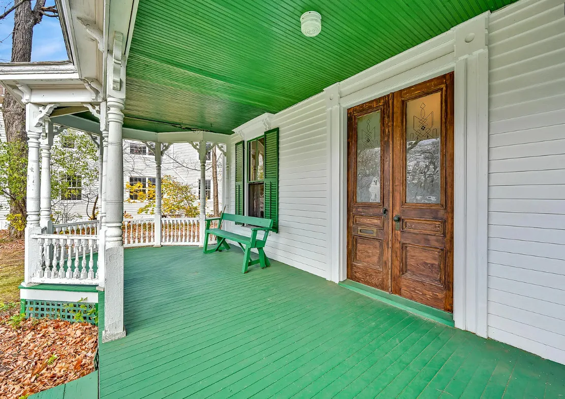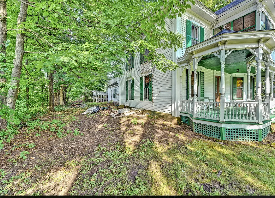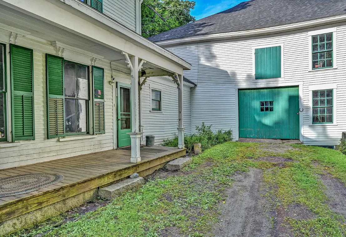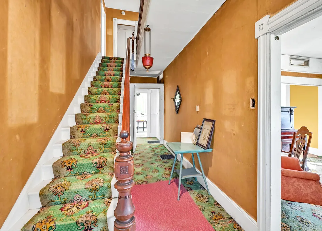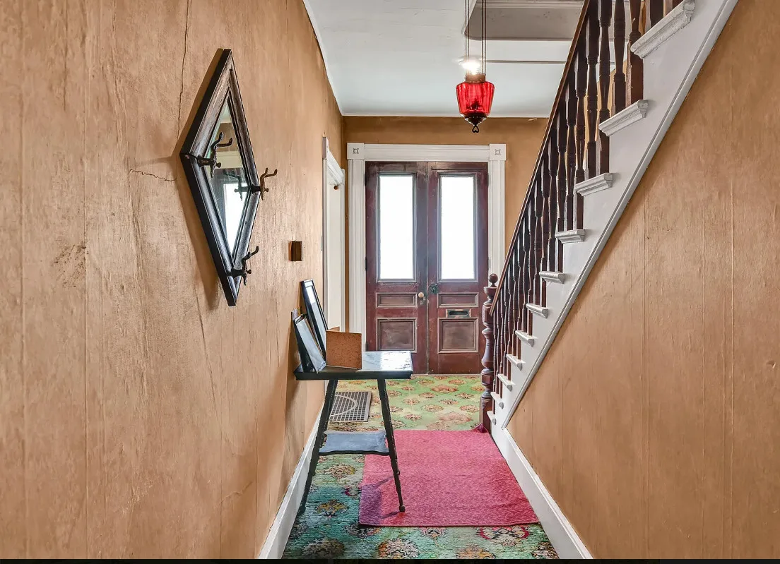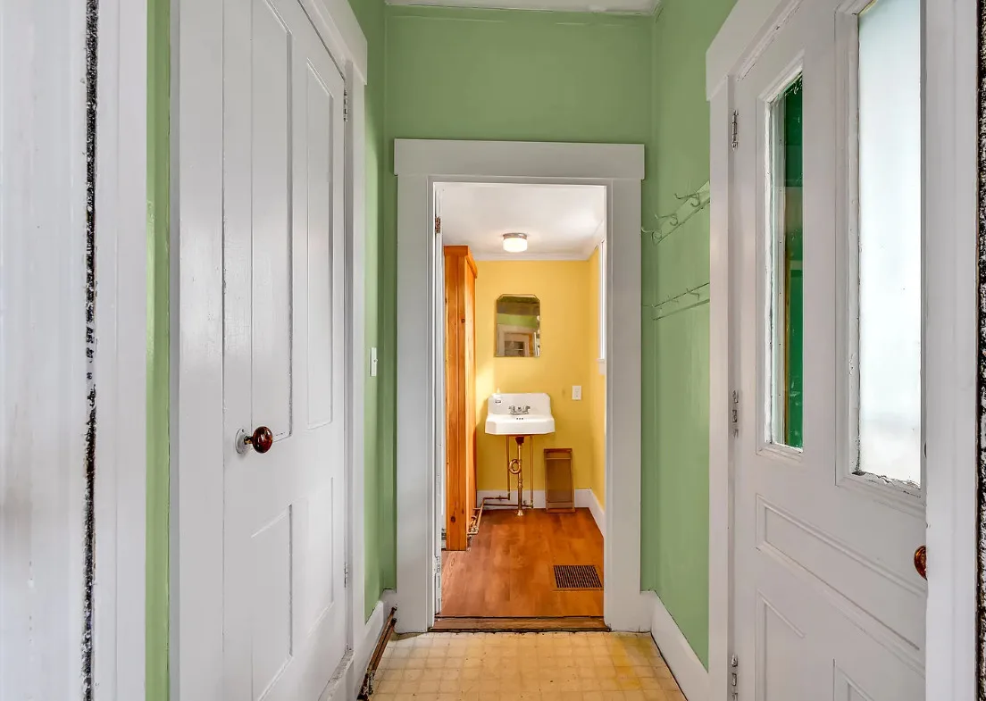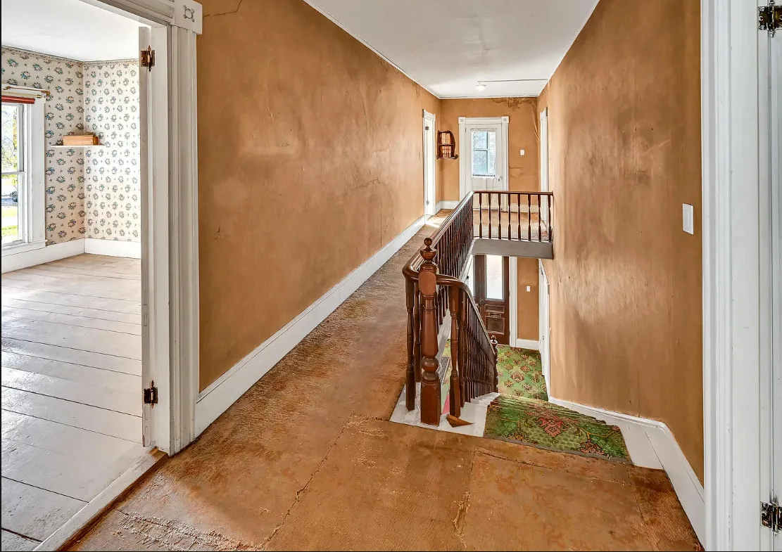 I want every book in that house! I love the kitchen stove! The house was built in 1890. It is located on .70 acre in Farmington, Maine. The house appears to have a bit of water damage on ceilings. The listing does say that roof work was done, so it could be old damage. The house features a covered front porch, upper screened in porch, wood floors, old linoleum floor cloths, pocket doors, picture rails, pressed tin ceiling, crown moulding, vintage light fixtures and wide baseboards. There is a large barn and a huge attic that brings total square footage to over 6,000 square feet. Five bedrooms, two bathrooms and 2,493 square feet. $265,000