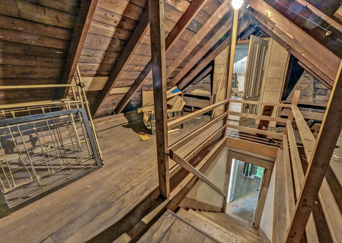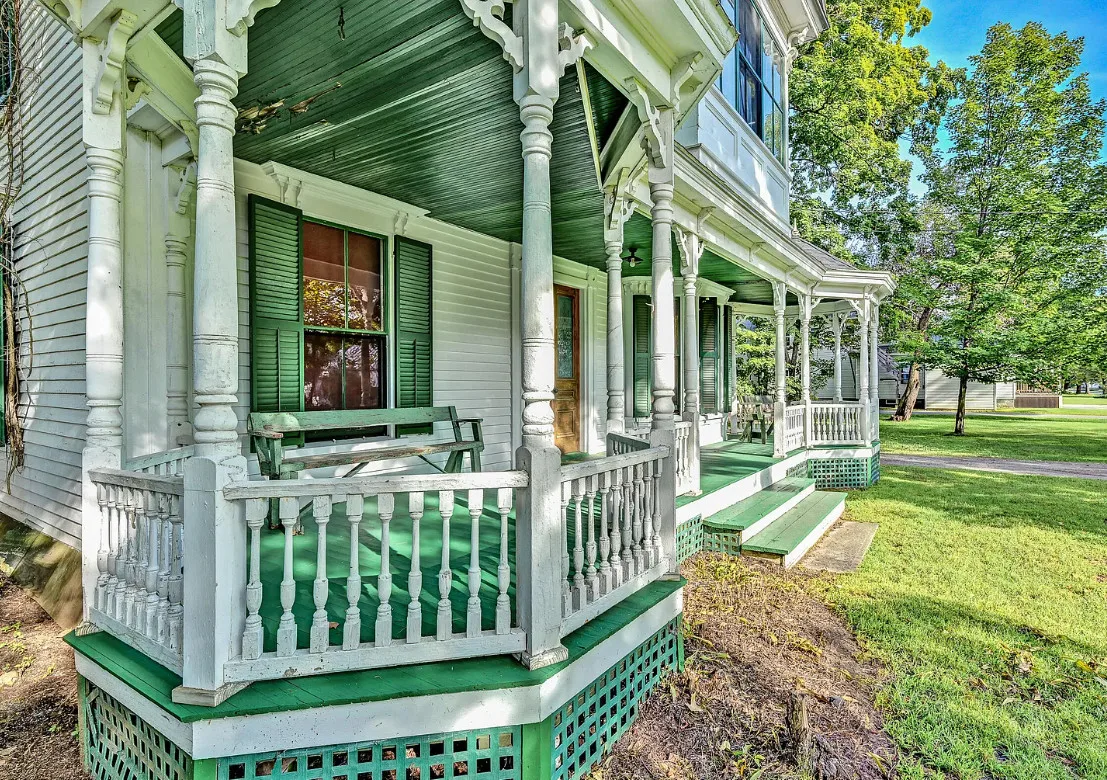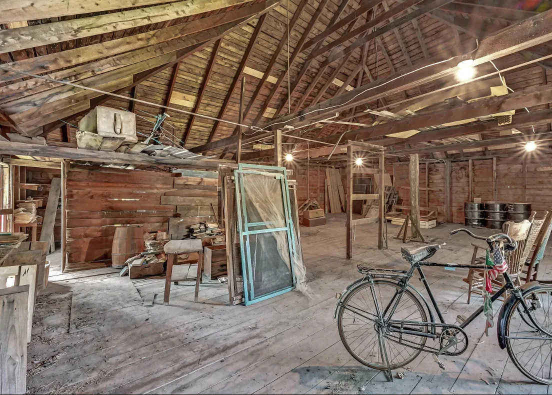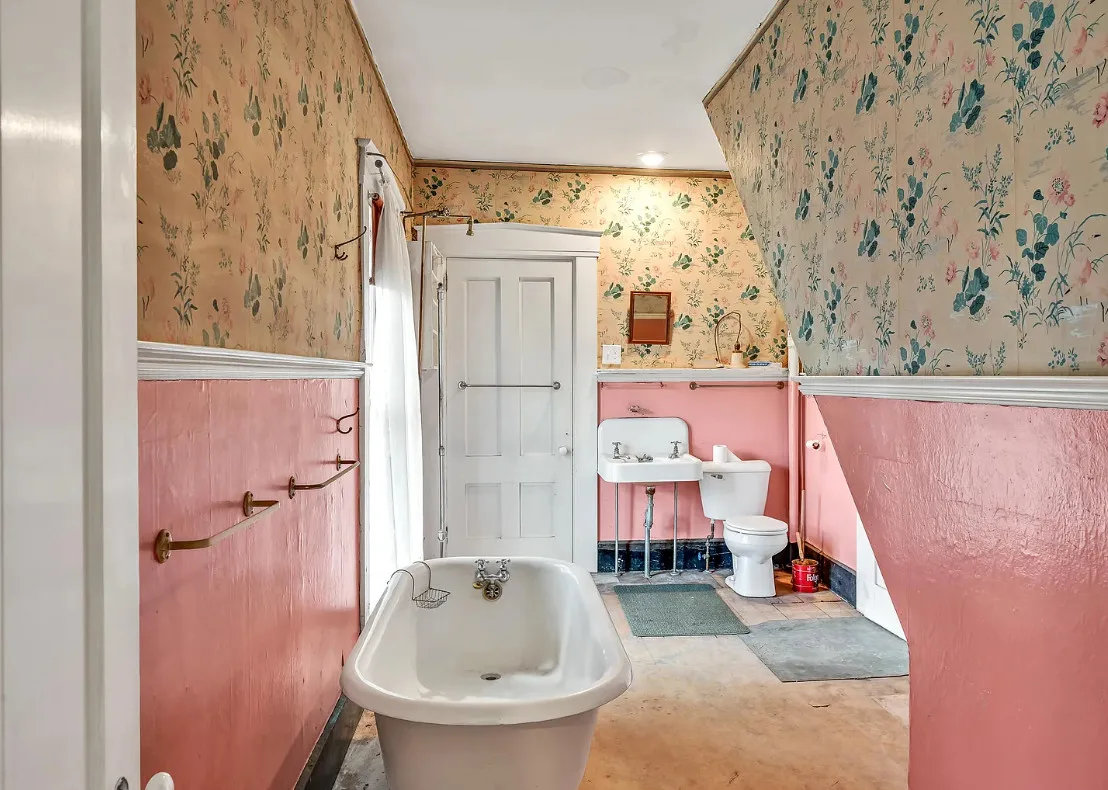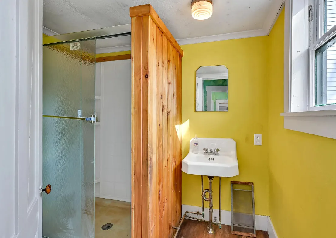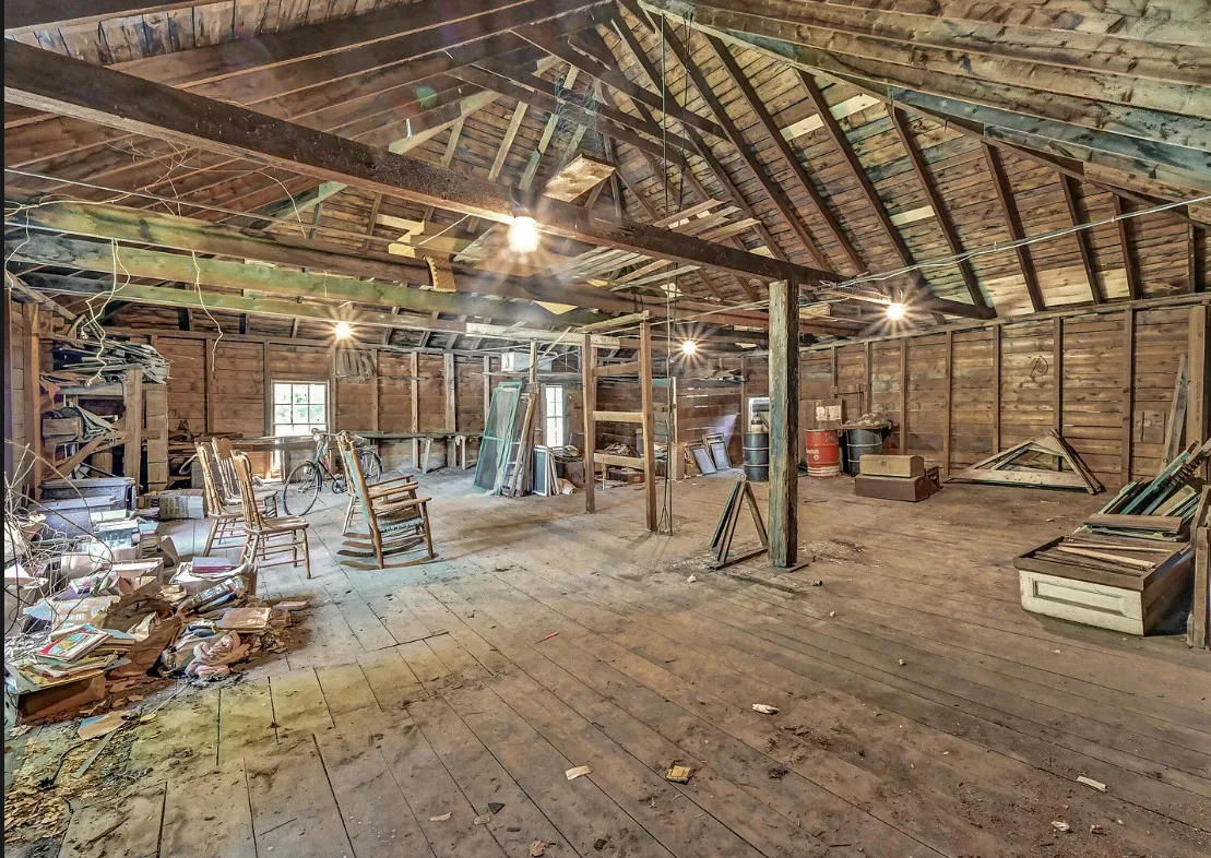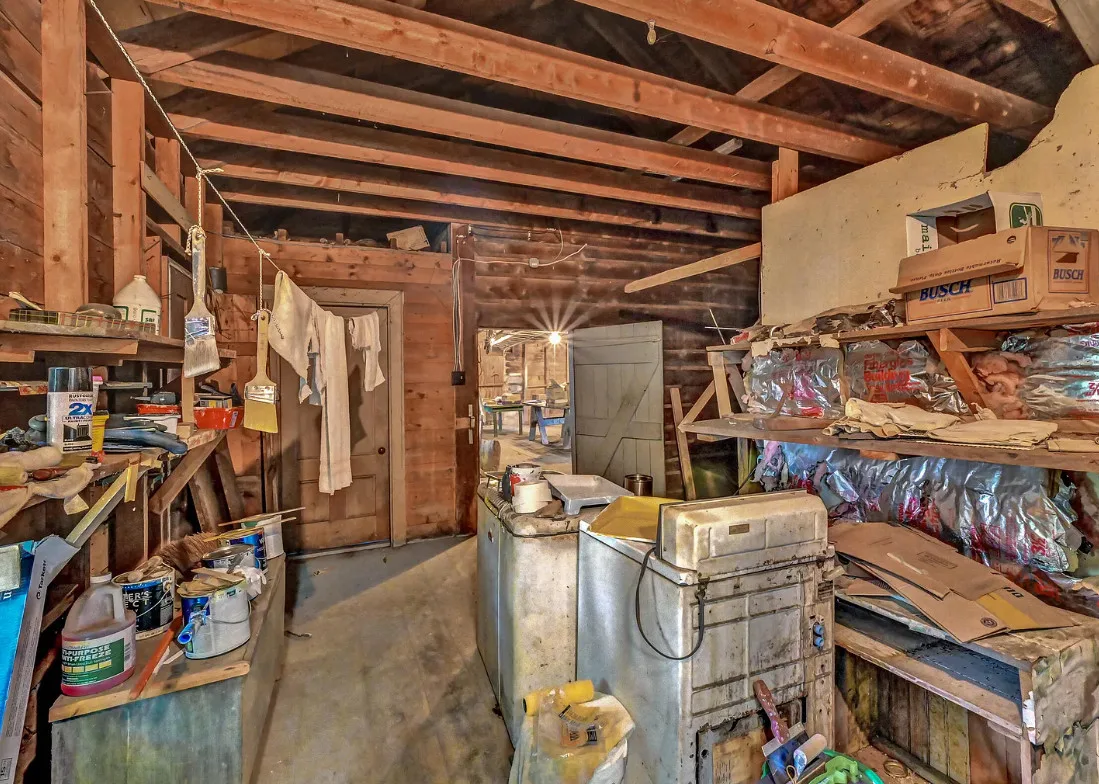 I want every book in that house! I love the kitchen stove! The house was built in 1890. It is located on .70 acre in Farmington, Maine. The house appears to have a bit of water damage on ceilings. The listing does say that roof work was done, so it could be old damage. The house features a covered front porch, upper screened in porch, wood floors, old linoleum floor cloths, pocket doors, picture rails, pressed tin ceiling, crown moulding, vintage light fixtures and wide baseboards. There is a large barn and a huge attic that brings total square footage to over 6,000 square feet. Five bedrooms, two bathrooms and 2,493 square feet. $265,000