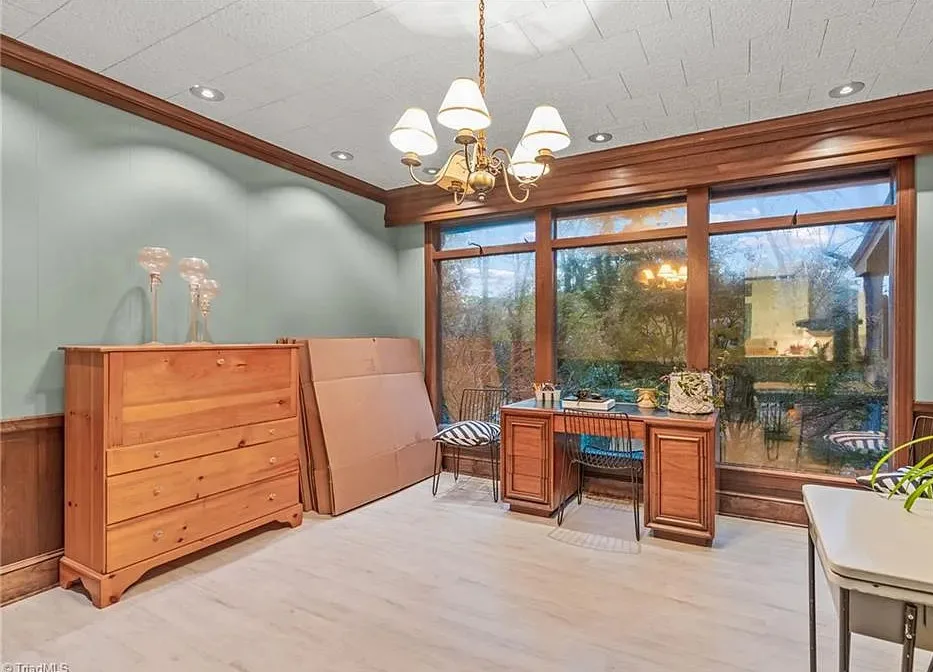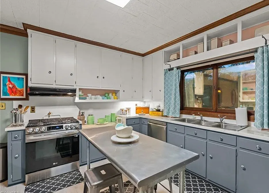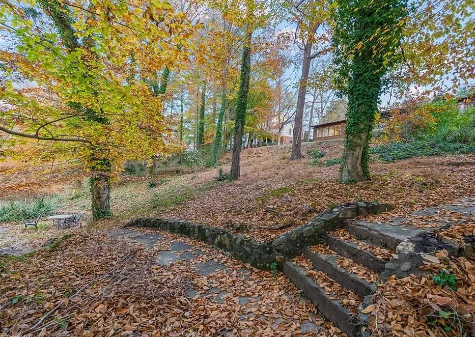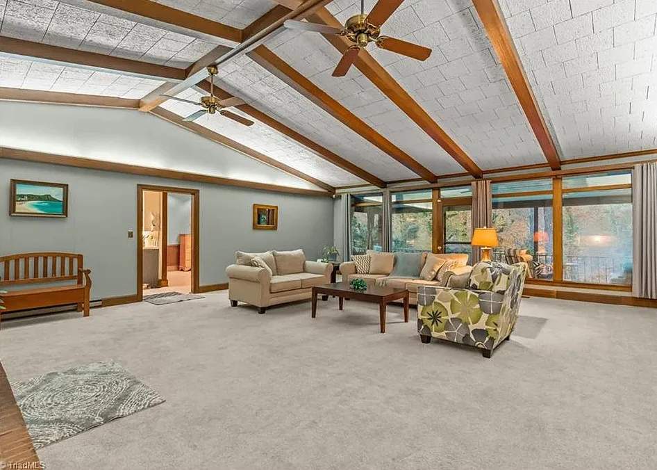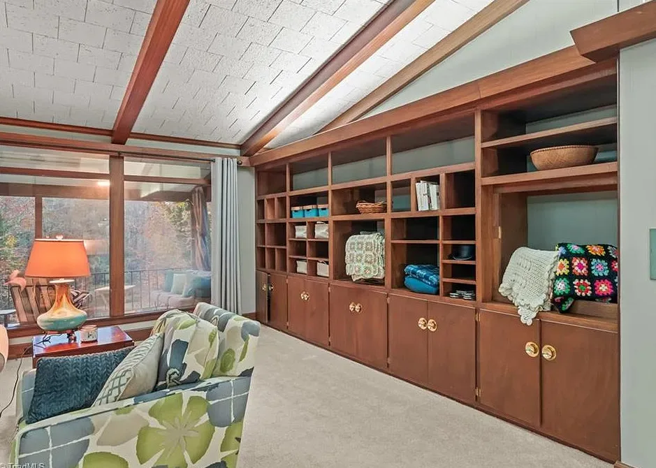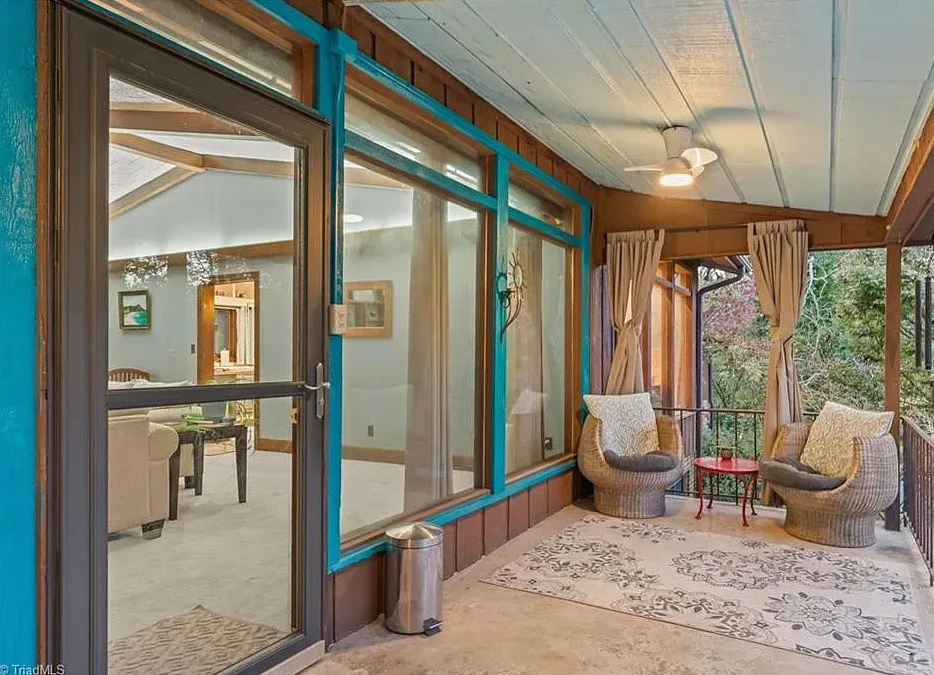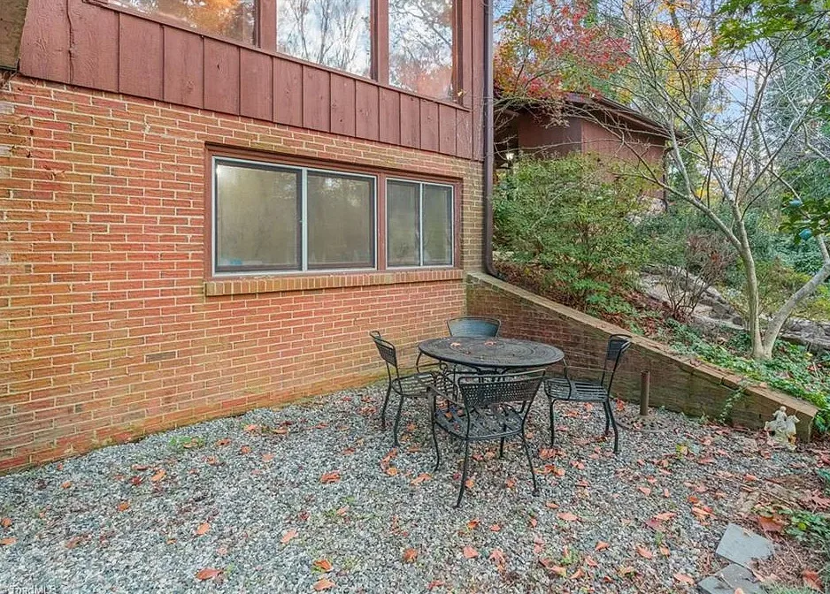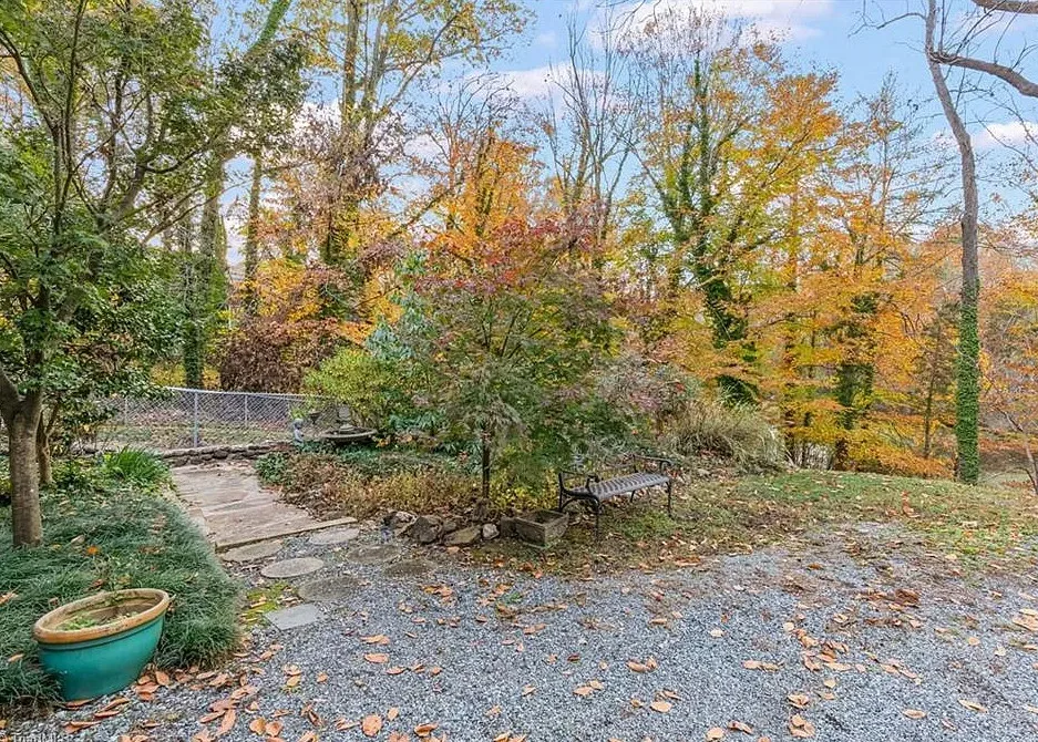 In love with that backyard space! What a great area to entertain guests! The house was built in 1955. It is located on 1.51 acres in Lexington, North Carolina. The house features a covered front porch, vaulted ceiling, exposed beams, built-ins, spacious kitchen and a lot of windows! There is a large back patio with an outdoor fireplace. There are stone walkways leading down to the pond where you will find another patio. Two bedrooms, two bathrooms and 2,333 square feet. $349,900
