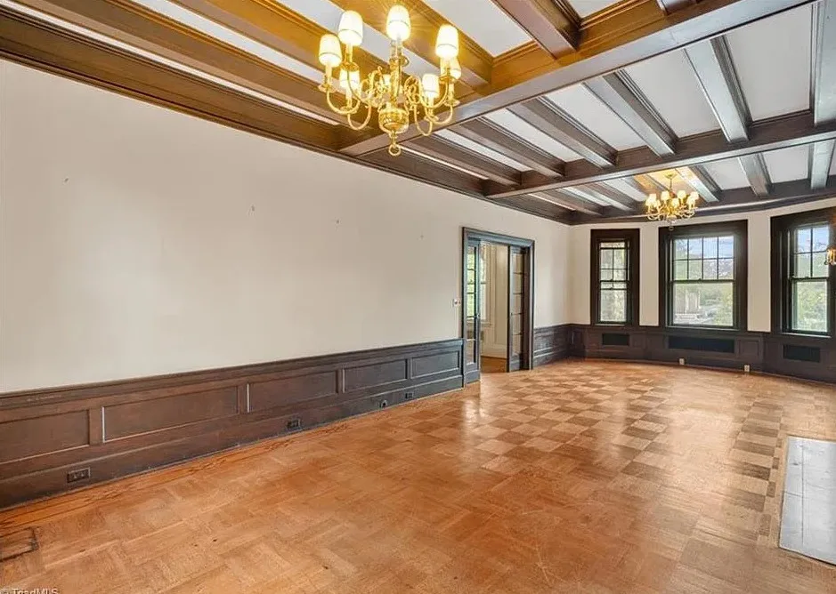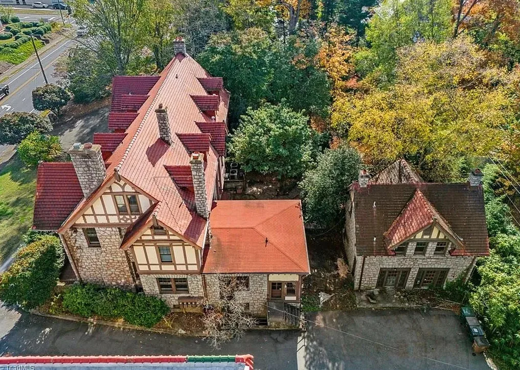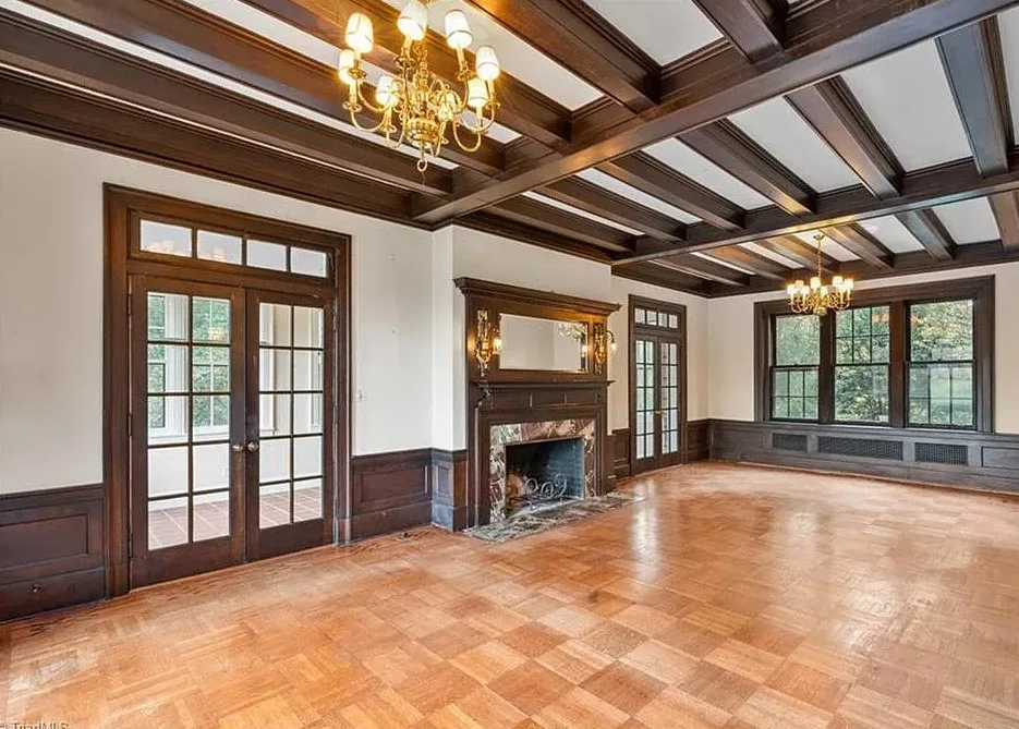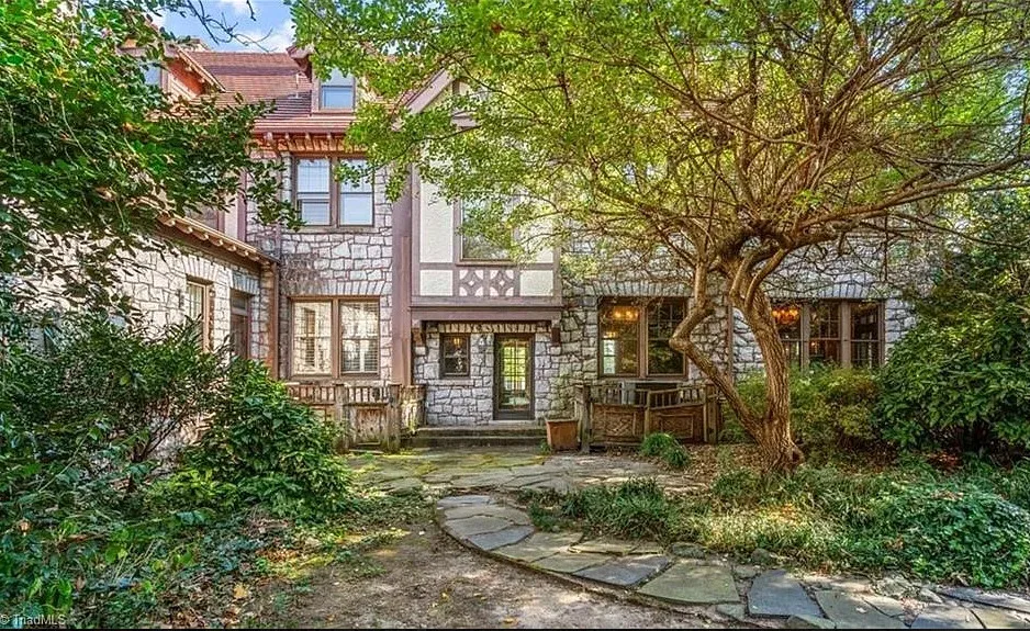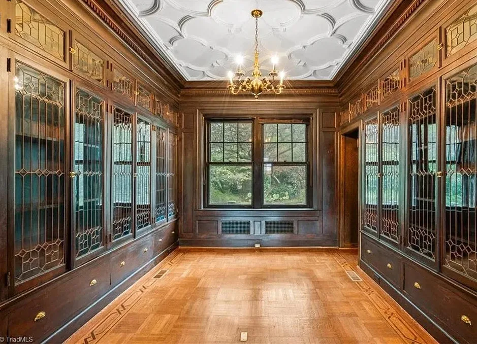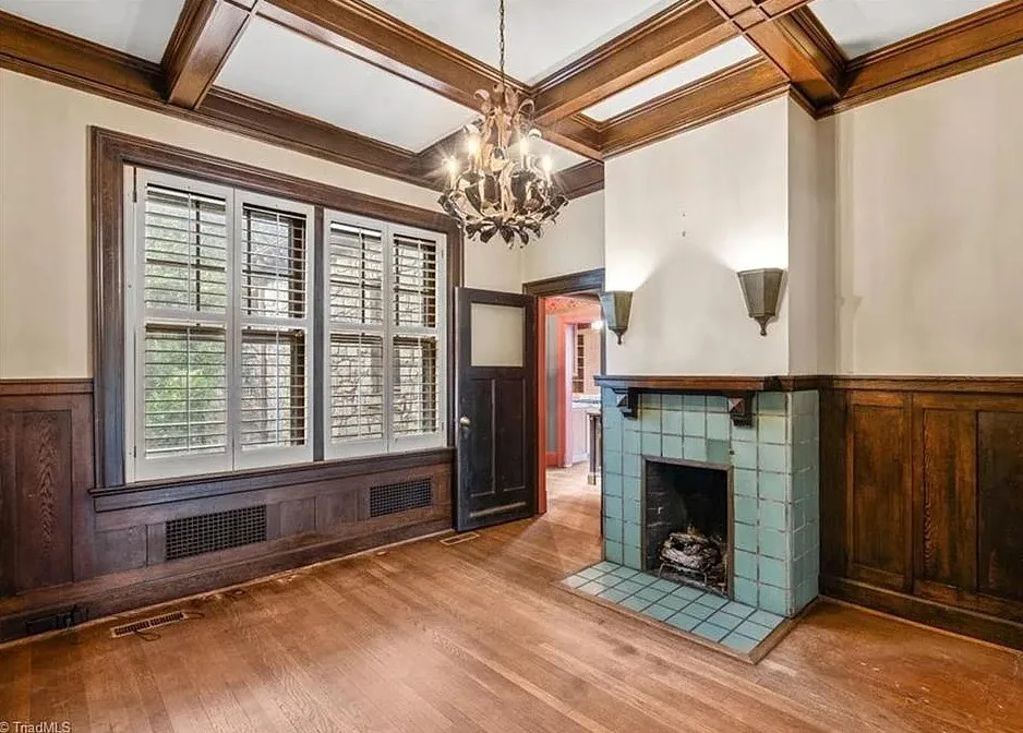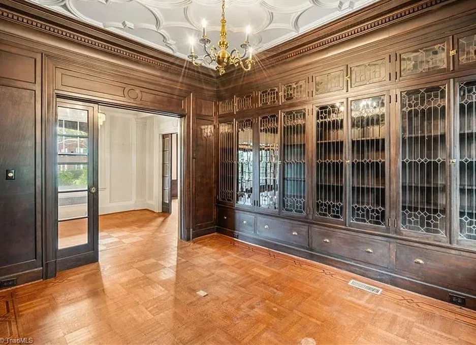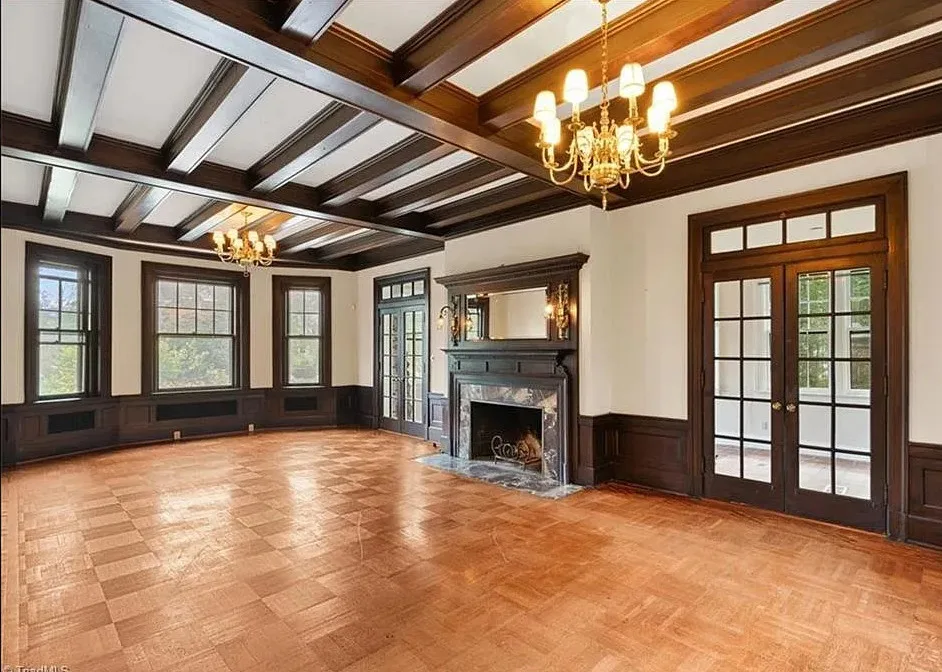Wow! This is a huge house! When I first saw it I thought it had to be in Asheville; it looks like a mini Grove Park Inn. The Galloway House was built in 1919. It is located on .69 acre in Greensboro, North Carolina. The tudor style house was designed by notable architect, Harry Barton. The house features a beautiful stone exterior, covered porch, parquet flooring, grand staircase, tall ceilings, pretty crown moulding, pocket doors, gorgeous built-in bookshelves, coffered ceiling, french doors and a sunroom. There is a matching carriage house on the property. The house is currently zoned office, which allows both commercial and residential opportunities. It’s unfortunate what is next door and I assume that is what is keeping the price under a million. Seven bedrooms, six bathrooms and 7,121 square feet. $950,000
