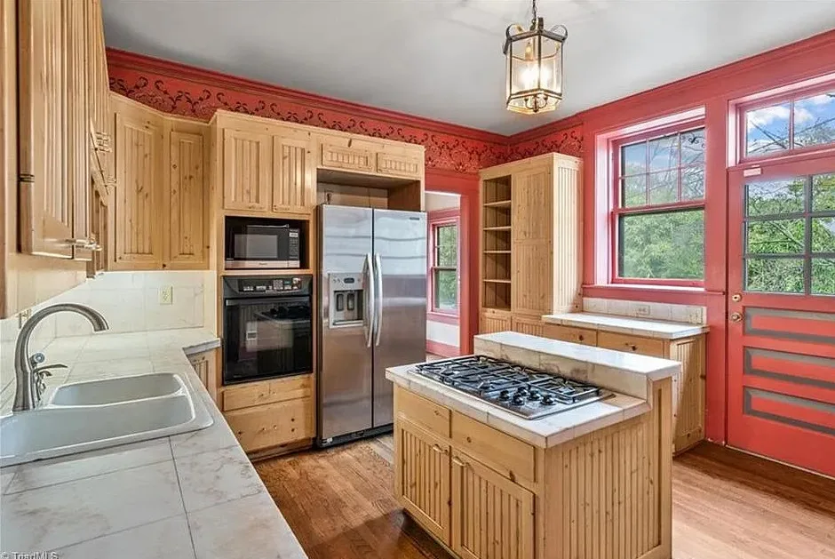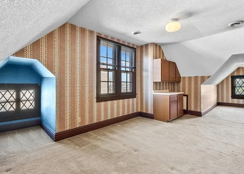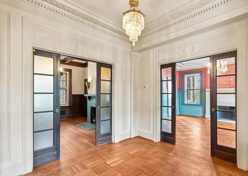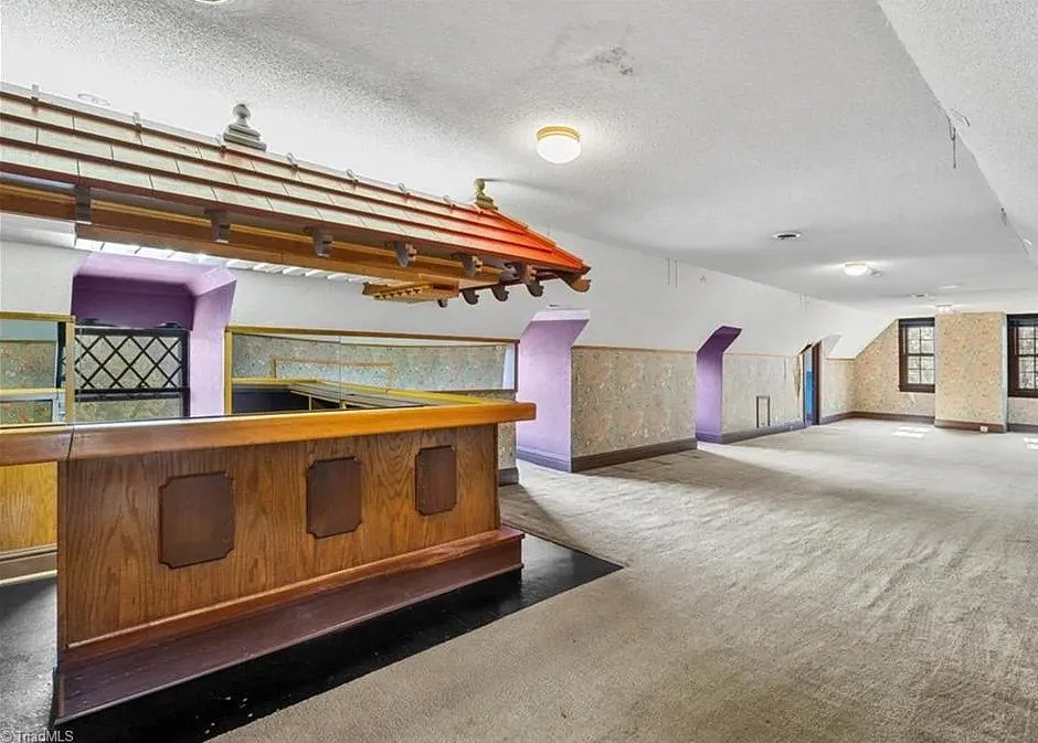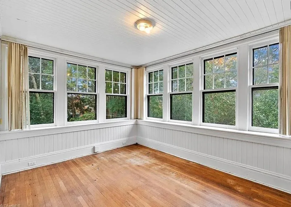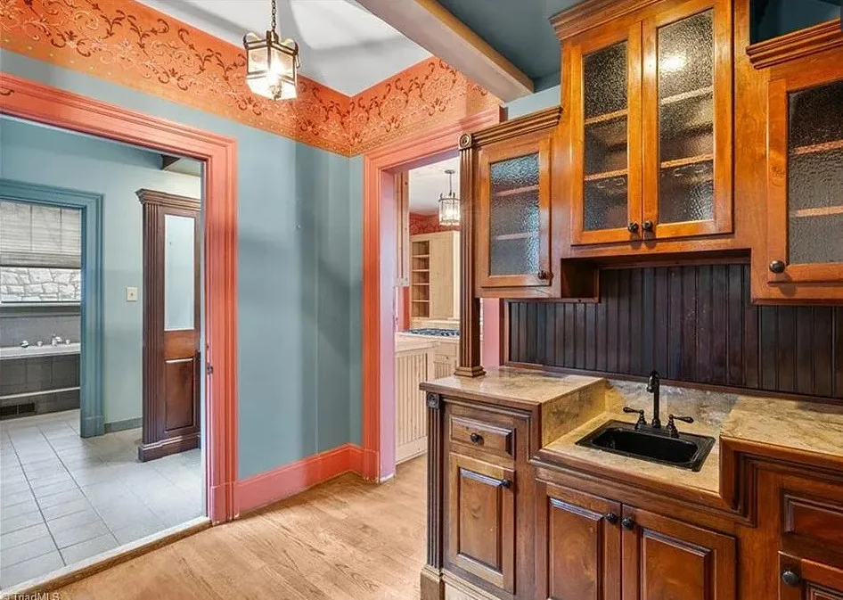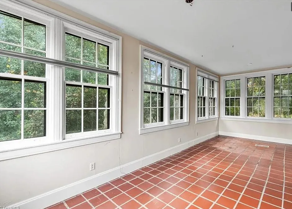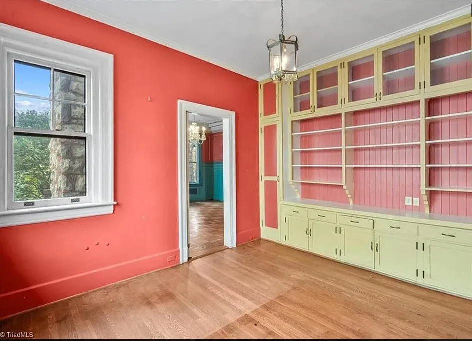 Wow! This is a huge house! When I first saw it I thought it had to be in Asheville; it looks like a mini Grove Park Inn. The Galloway House was built in 1919. It is located on .69 acre in Greensboro, North Carolina. The tudor style house was designed by notable architect, Harry Barton. The house features a beautiful stone exterior, covered porch, parquet flooring, grand staircase, tall ceilings, pretty crown moulding, pocket doors, gorgeous built-in bookshelves, coffered ceiling, french doors and a sunroom. There is a matching carriage house on the property. The house is currently zoned office, which allows both commercial and residential opportunities. It’s unfortunate what is next door and I assume that is what is keeping the price under a million. Seven bedrooms, six bathrooms and 7,121 square feet. $950,000