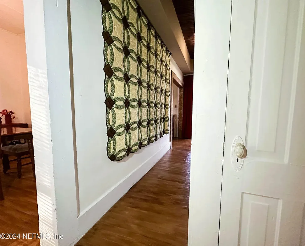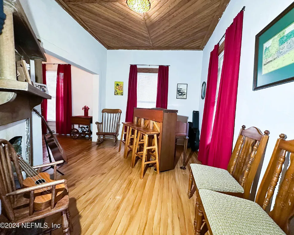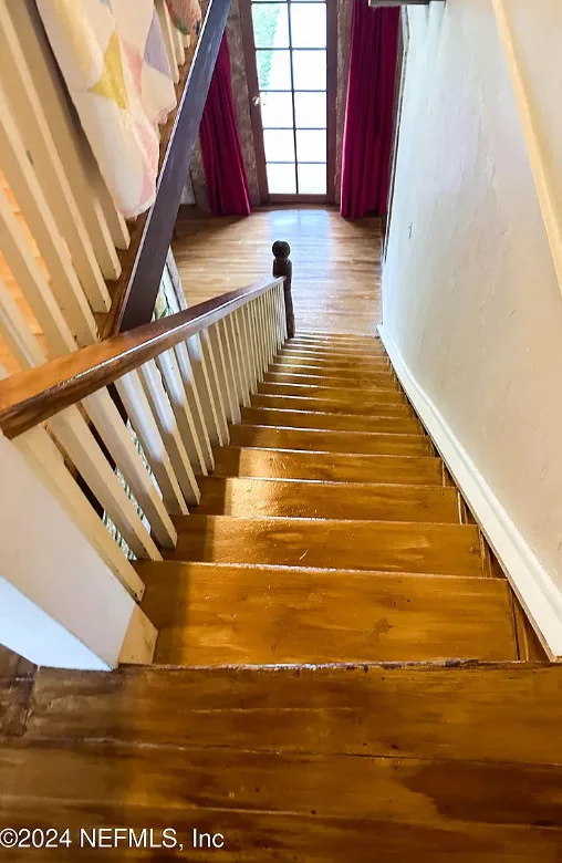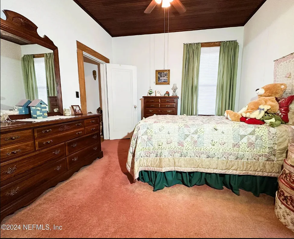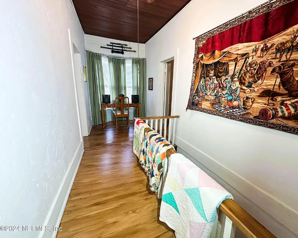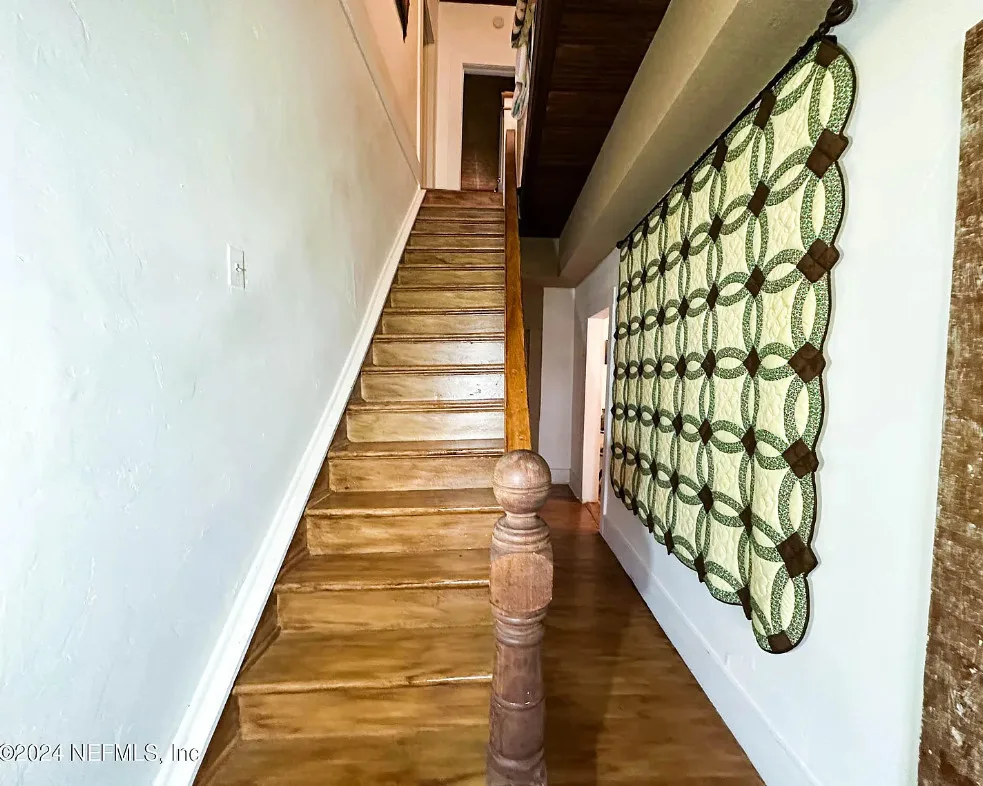 This house has some nice details! The street looks quiet. The house was built in 1930. It is located in Starke, Florida. The house features a covered front porch, wood floors, nice staircase, wood ceiling, crown moulding, tall windows and baseboards. There is a fenced in backyard with a storage shed. Four bedrooms, two bathrooms and 2,008 square feet. $249,900