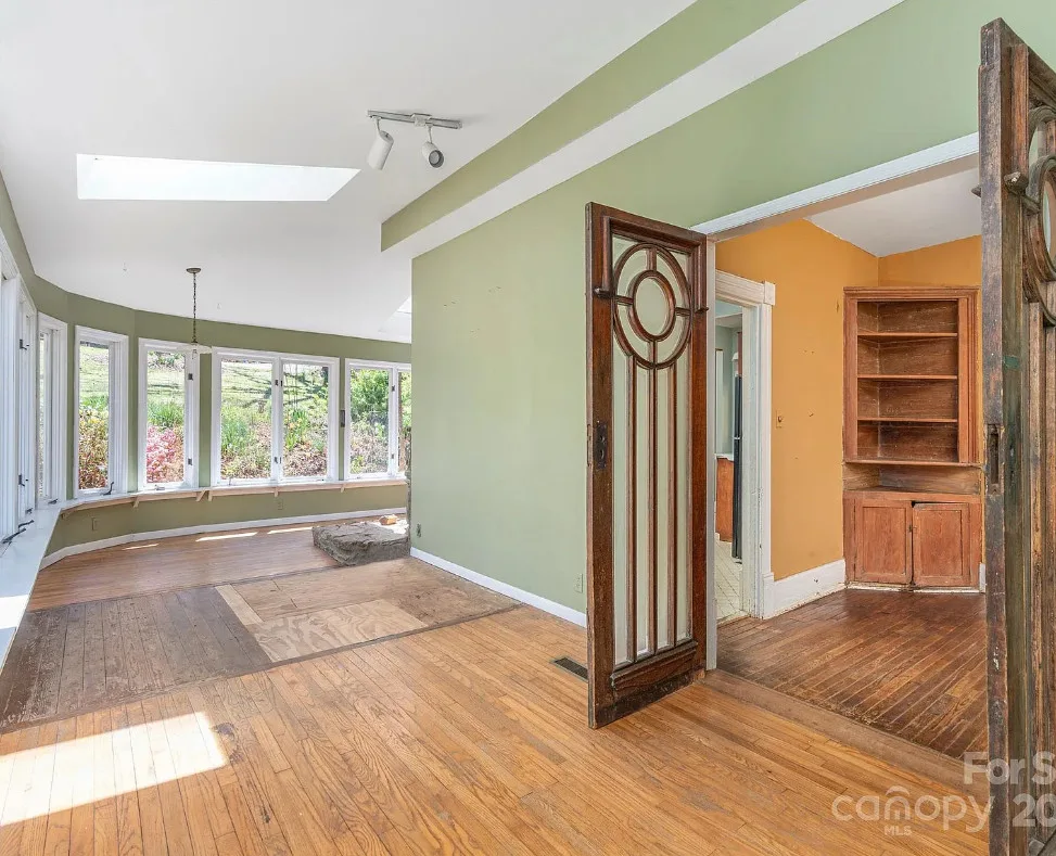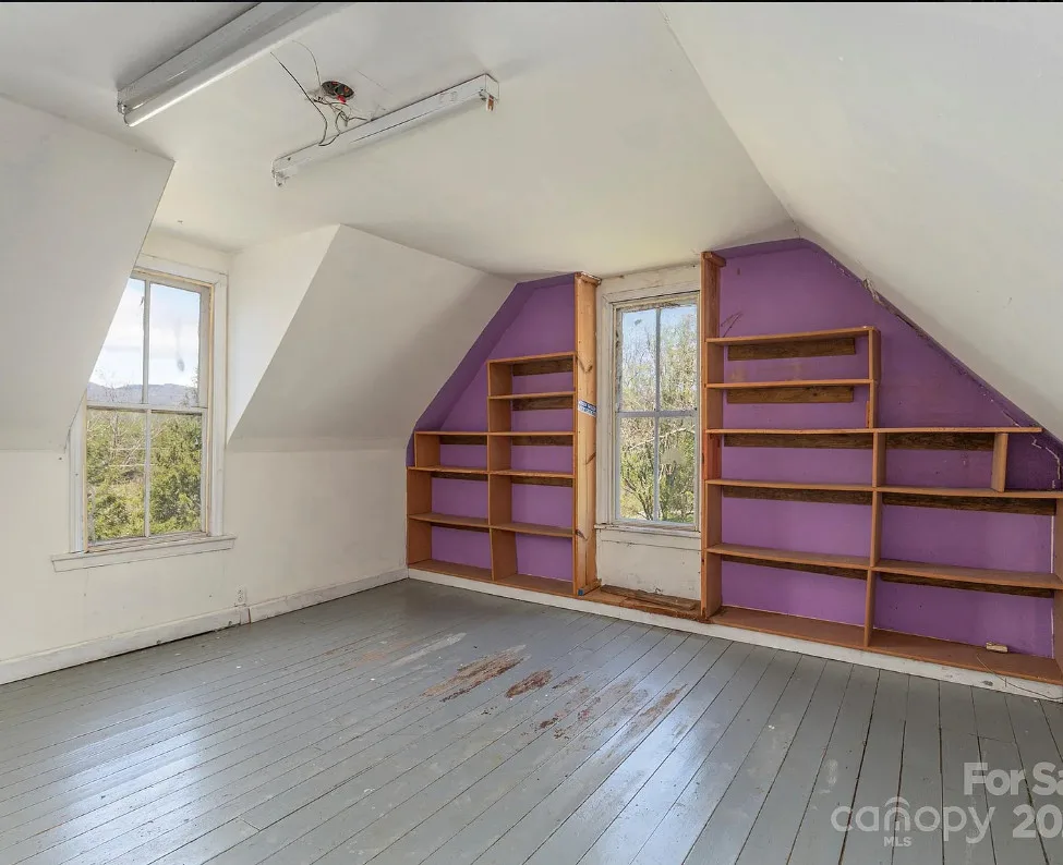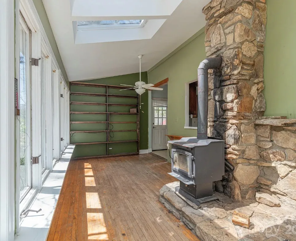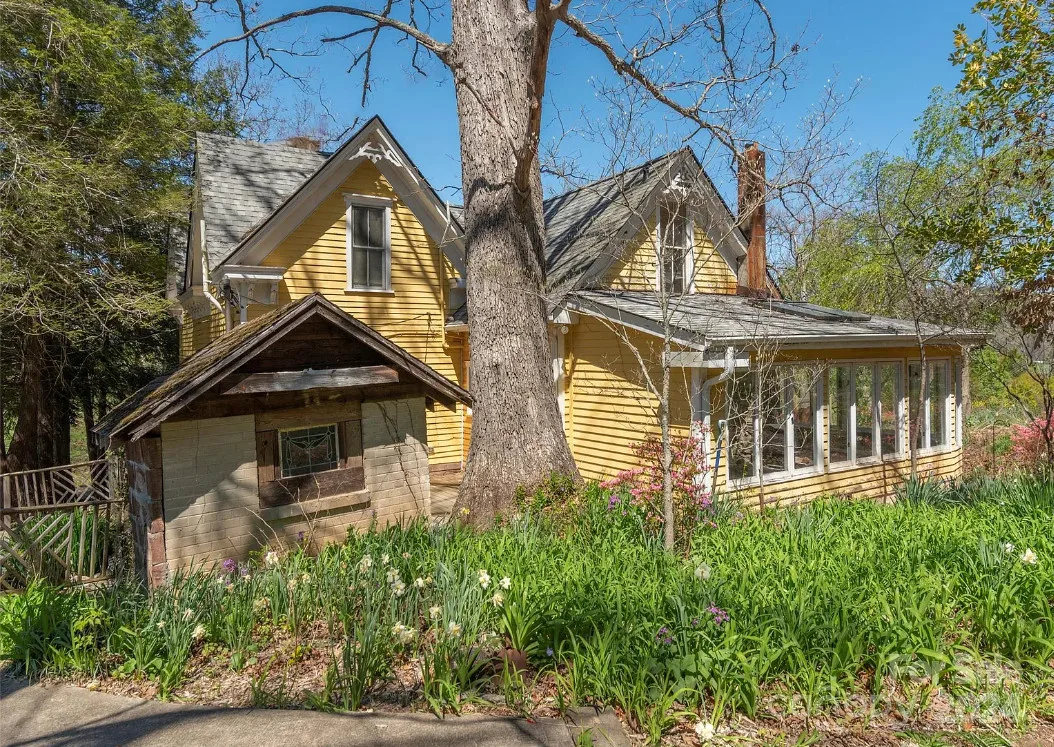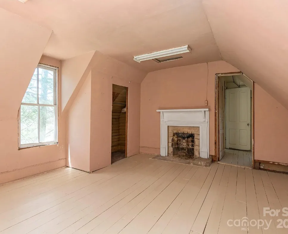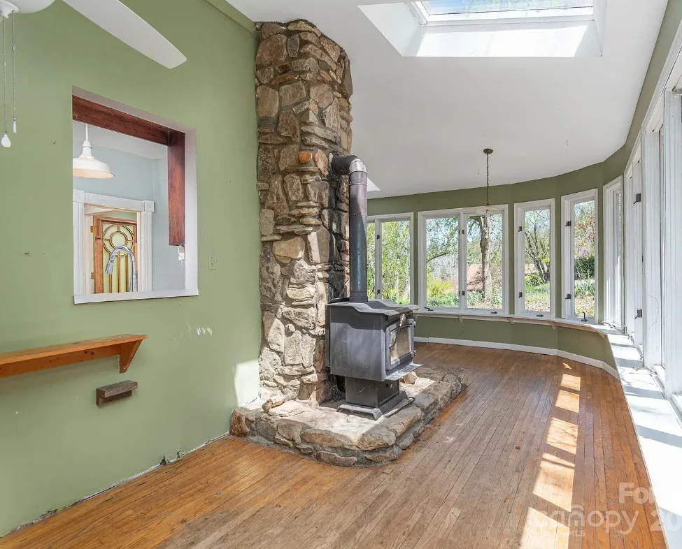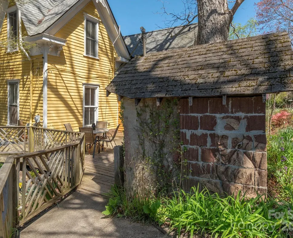 Check out the side of the storage shed! That is pretty cool. This is a pretty house! Love the exterior of it. The S. J. Ashworth House was built in 1892. It is located on 1.26 acres in Fairview, North Carolina. The house features a covered front porch, wood floors, wide baseboards, vintage light fixture, ceiling medallion, sunroom, stone hearth and cool looking double doors. This house was featured in “Castles and Cabins: The History and Architecture of Buncombe County”. Five bedrooms, two bathrooms and 2,010 square feet. $375,000