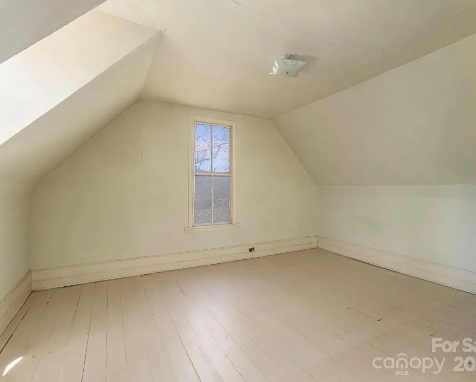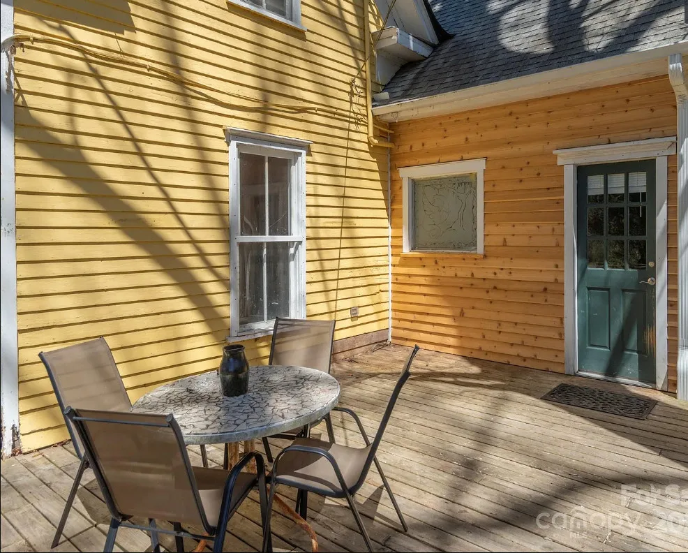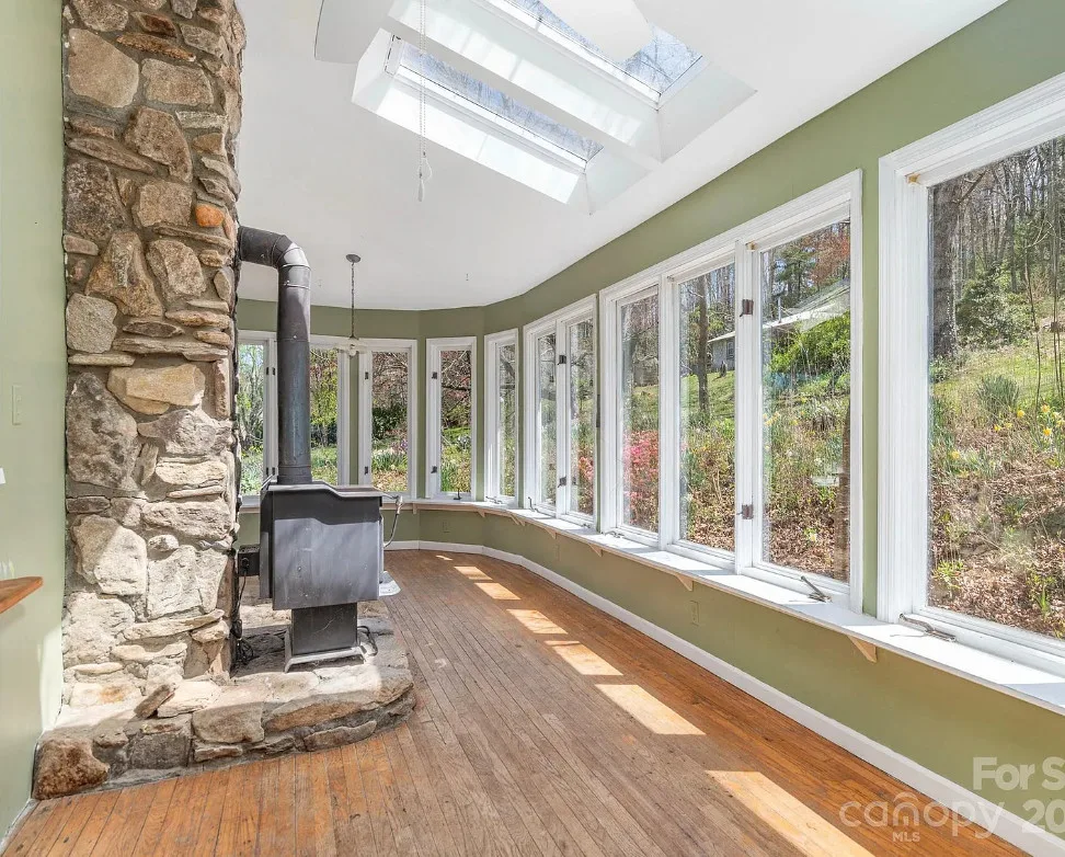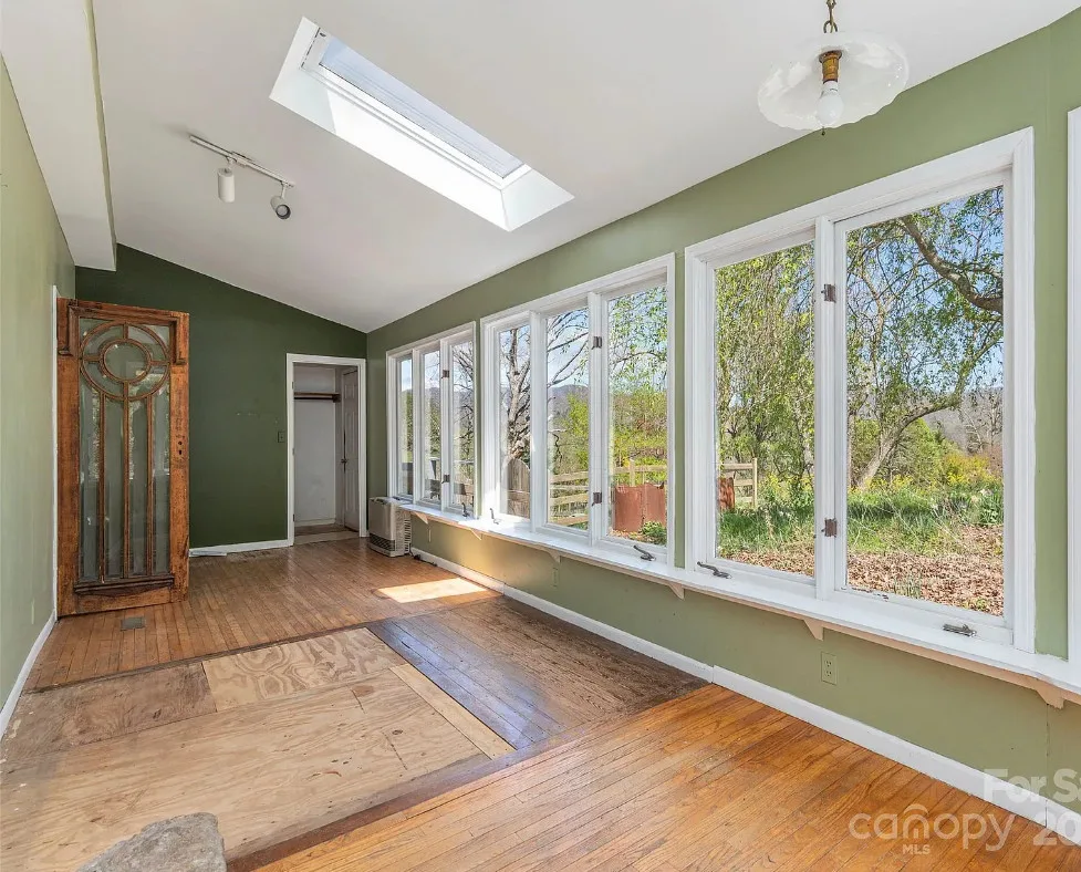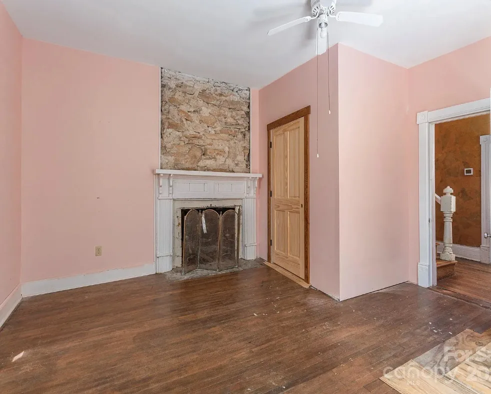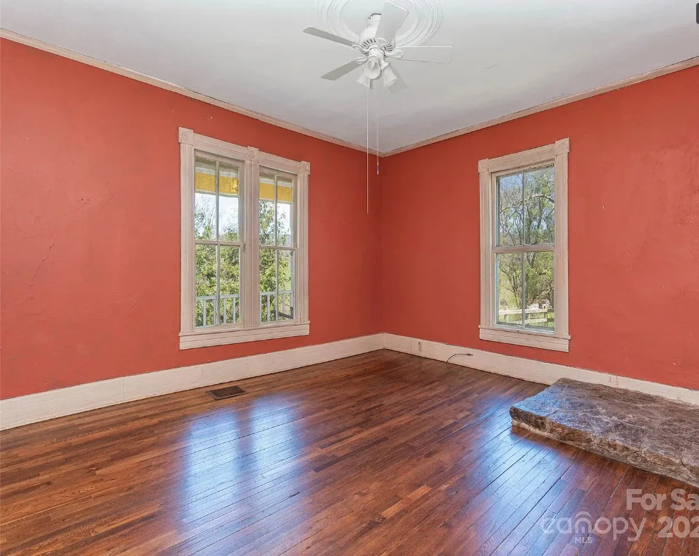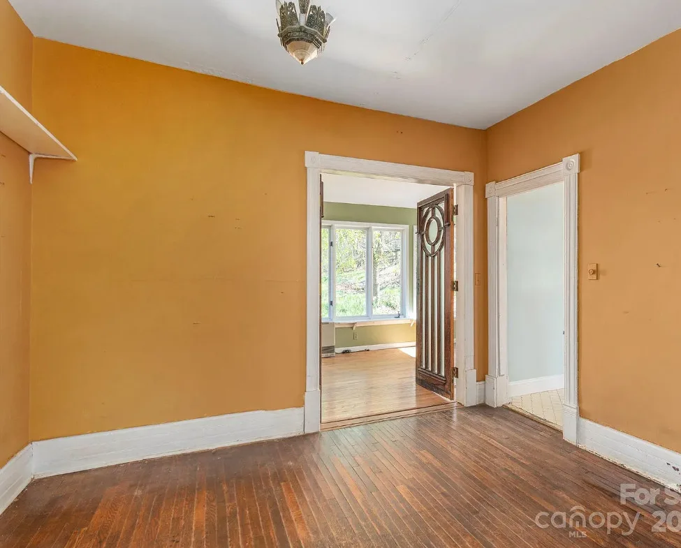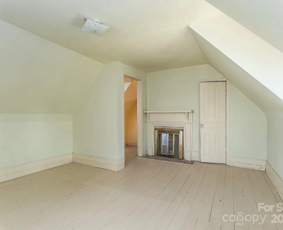 Check out the side of the storage shed! That is pretty cool. This is a pretty house! Love the exterior of it. The S. J. Ashworth House was built in 1892. It is located on 1.26 acres in Fairview, North Carolina. The house features a covered front porch, wood floors, wide baseboards, vintage light fixture, ceiling medallion, sunroom, stone hearth and cool looking double doors. This house was featured in “Castles and Cabins: The History and Architecture of Buncombe County”. Five bedrooms, two bathrooms and 2,010 square feet. $375,000