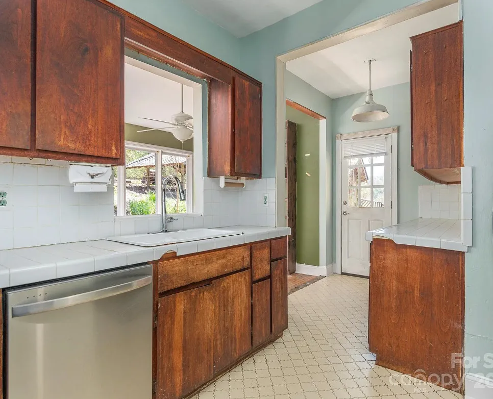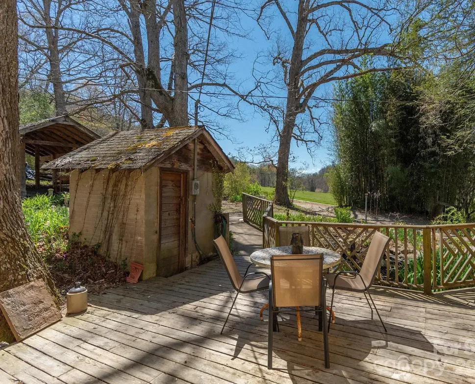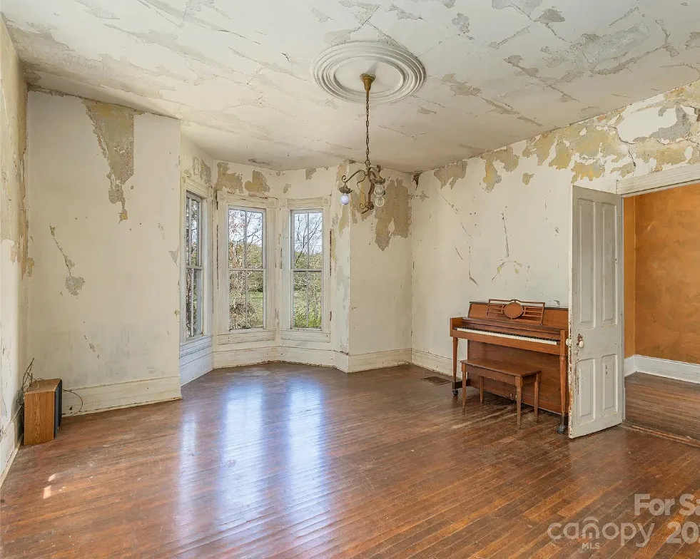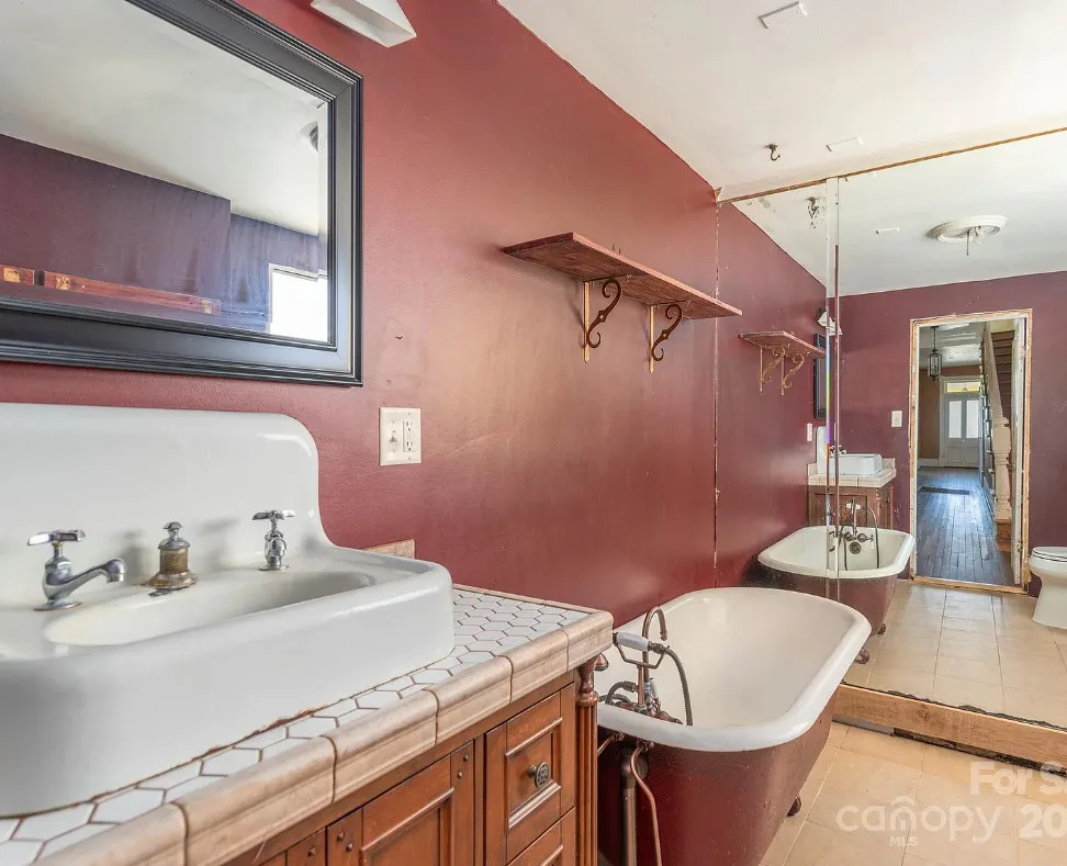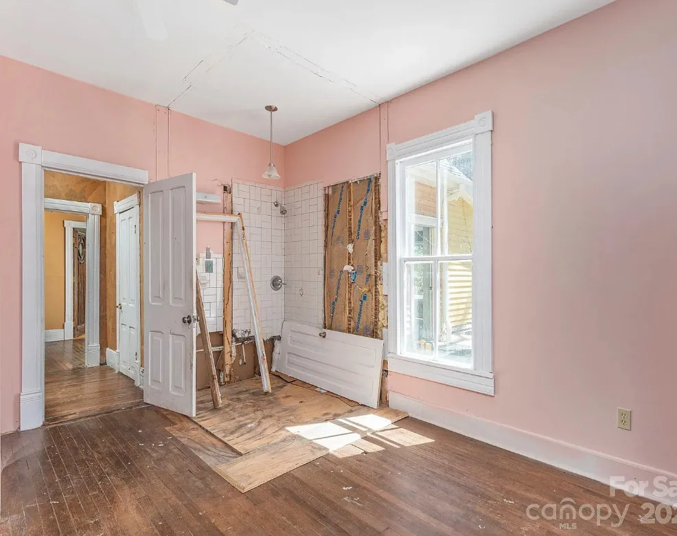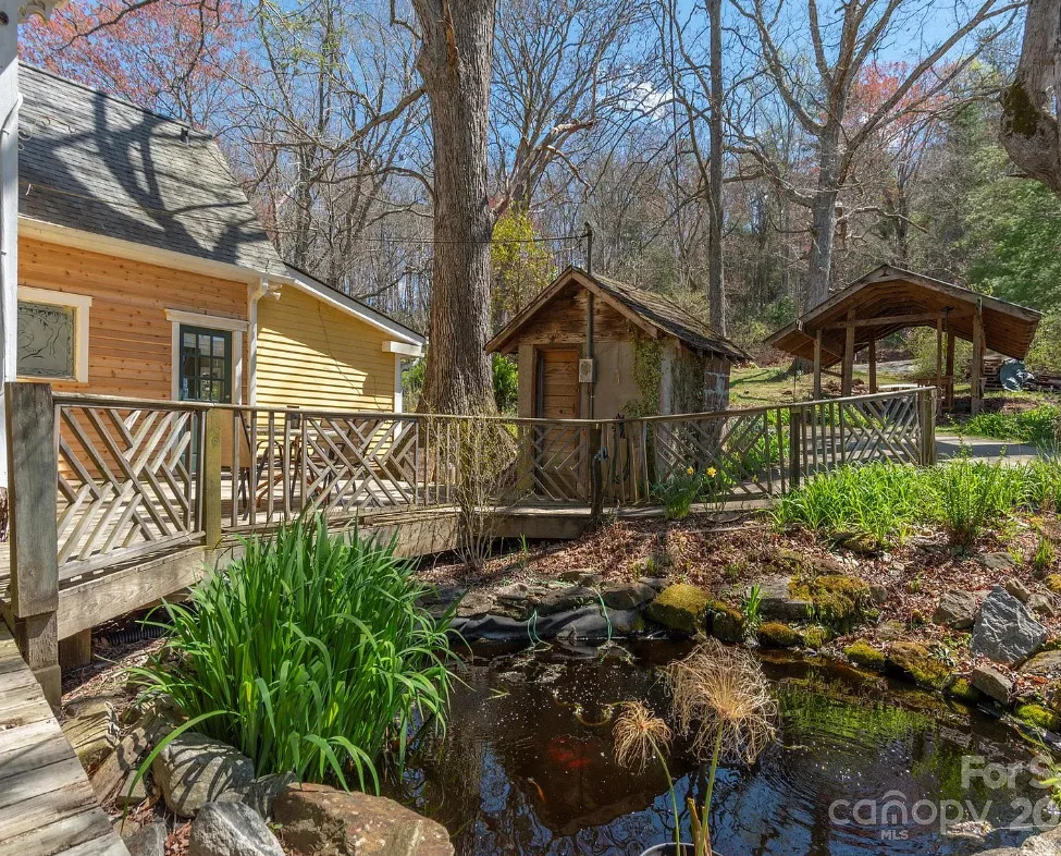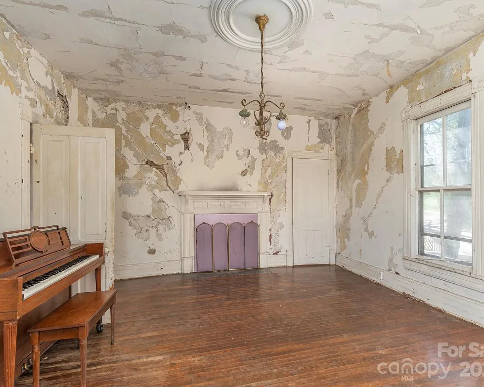 Check out the side of the storage shed! That is pretty cool. This is a pretty house! Love the exterior of it. The S. J. Ashworth House was built in 1892. It is located on 1.26 acres in Fairview, North Carolina. The house features a covered front porch, wood floors, wide baseboards, vintage light fixture, ceiling medallion, sunroom, stone hearth and cool looking double doors. This house was featured in “Castles and Cabins: The History and Architecture of Buncombe County”. Five bedrooms, two bathrooms and 2,010 square feet. $375,000